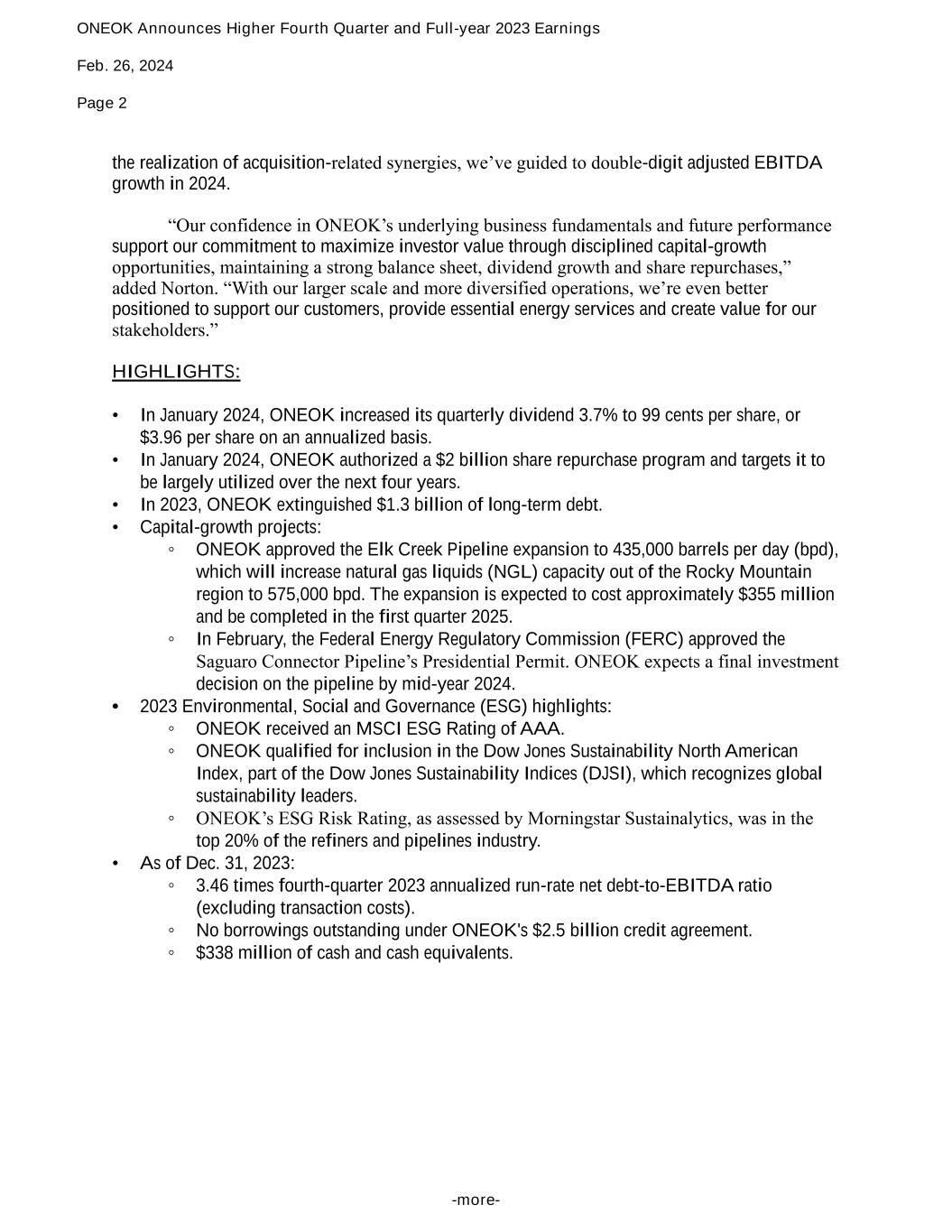 ONEOK Announces Higher Fourth Quarter and Full-year 2023 Earnings Feb. 26, 2024 Page 2 -more- the realization of acquisition-related synergies, we’ve guided to double-digit adjusted EBITDA growth in 2024. “Our confidence in ONEOK’s underlying business fundamentals and future performance support our commitment to maximize investor value through disciplined capital-growth opportunities, maintaining a strong balance sheet, dividend growth and share repurchases,” added Norton. “With our larger scale and more diversified operations, we’re even better positioned to support our customers, provide essential energy services and create value for our stakeholders.” HIGHLIGHTS: • In January 2024, ONEOK increased its quarterly dividend 3.7% to 99 cents per share, or $3.96 per share on an annualized basis. • In January 2024, ONEOK authorized a $2 billion share repurchase program and targets it to be largely utilized over the next four years. • In 2023, ONEOK extinguished $1.3 billion of long-term debt. • Capital-growth projects: ◦ ONEOK approved the Elk Creek Pipeline expansion to 435,000 barrels per day (bpd), which will increase natural gas liquids (NGL) capacity out of the Rocky Mountain region to 575,000 bpd. The expansion is expected to cost approximately $355 million and be completed in the first quarter 2025. ◦ In February, the Federal Energy Regulatory Commission (FERC) approved the Saguaro Connector Pipeline’s Presidential Permit. ONEOK expects a final investment decision on the pipeline by mid-year 2024. • 2023 Environmental, Social and Governance (ESG) highlights: ◦ ONEOK received an MSCI ESG Rating of AAA. ◦ ONEOK qualified for inclusion in the Dow Jones Sustainability North American Index, part of the Dow Jones Sustainability Indices (DJSI), which recognizes global sustainability leaders. ◦ ONEOK’s ESG Risk Rating, as assessed by Morningstar Sustainalytics, was in the top 20% of the refiners and pipelines industry. • As of Dec. 31, 2023: ◦ 3.46 times fourth-quarter 2023 annualized run-rate net debt-to-EBITDA ratio (excluding transaction costs). ◦ No borrowings outstanding under ONEOK's $2.5 billion credit agreement. ◦ $338 million of cash and cash equivalents.