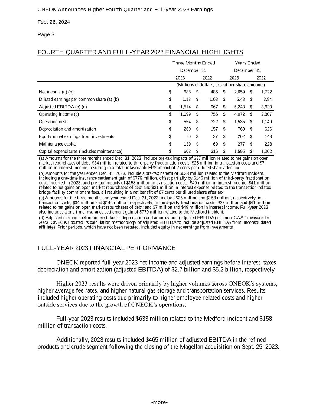 ONEOK Announces Higher Fourth Quarter and Full-year 2023 Earnings Feb. 26, 2024 Page 3 -more- FOURTH QUARTER AND FULL-YEAR 2023 FINANCIAL HIGHLIGHTS Three Months Ended Years Ended December 31, December 31, 2023 2022 2023 2022 (Millions of dollars, except per share amounts) Net income (a) (b) $ 688 $ 485 $ 2,659 $ 1,722 Diluted earnings per common share (a) (b) $ 1.18 $ 1.08 $ 5.48 $ 3.84 Adjusted EBITDA (c) (d) $ 1,514 $ 967 $ 5,243 $ 3,620 Operating income (c) $ 1,099 $ 756 $ 4,072 $ 2,807 Operating costs $ 554 $ 322 $ 1,535 $ 1,149 Depreciation and amortization $ 260 $ 157 $ 769 $ 626 Equity in net earnings from investments $ 70 $ 37 $ 202 $ 148 Maintenance capital $ 139 $ 69 $ 277 $ 228 Capital expenditures (includes maintenance) $ 603 $ 316 $ 1,595 $ 1,202 (a) Amounts for the three months ended Dec. 31, 2023, include pre-tax impacts of $37 million related to net gains on open market repurchases of debt, $34 million related to third-party fractionation costs, $25 million in transaction costs and $7 million in interest income, resulting in a total unfavorable EPS impact of 2 cents per diluted share after-tax. (b) Amounts for the year ended Dec. 31, 2023, include a pre-tax benefit of $633 million related to the Medford incident, including a one-time insurance settlement gain of $779 million, offset partially by $146 million of third-party fractionation costs incurred in 2023; and pre-tax impacts of $158 million in transaction costs, $49 million in interest income, $41 million related to net gains on open market repurchases of debt and $21 million in interest expense related to the transaction-related bridge facility commitment fees, all resulting in a net benefit of 87 cents per diluted share after tax. (c) Amounts for the three months and year ended Dec. 31, 2023, include $25 million and $158 million, respectively, in transaction costs; $34 million and $146 million, respectively, in third-party fractionation costs; $37 million and $41 million related to net gains on open market repurchases of debt; and $7 million and $49 million in interest income. Full-year 2023 also includes a one-time insurance settlement gain of $779 million related to the Medford incident. (d) Adjusted earnings before interest, taxes, depreciation and amortization (adjusted EBITDA) is a non-GAAP measure. In 2023, ONEOK updated its calculation methodology of adjusted EBITDA to include adjusted EBITDA from unconsolidated affiliates. Prior periods, which have not been restated, included equity in net earnings from investments. FULL-YEAR 2023 FINANCIAL PERFORMANCE ONEOK reported full-year 2023 net income and adjusted earnings before interest, taxes, depreciation and amortization (adjusted EBITDA) of $2.7 billion and $5.2 billion, respectively. Higher 2023 results were driven primarily by higher volumes across ONEOK’s systems, higher average fee rates, and higher natural gas storage and transportation services. Results included higher operating costs due primarily to higher employee-related costs and higher outside services due to the growth of ONEOK’s operations. Full-year 2023 results included $633 million related to the Medford incident and $158 million of transaction costs. Additionally, 2023 results included $465 million of adjusted EBITDA in the refined products and crude segment following the closing of the Magellan acquisition on Sept. 25, 2023.