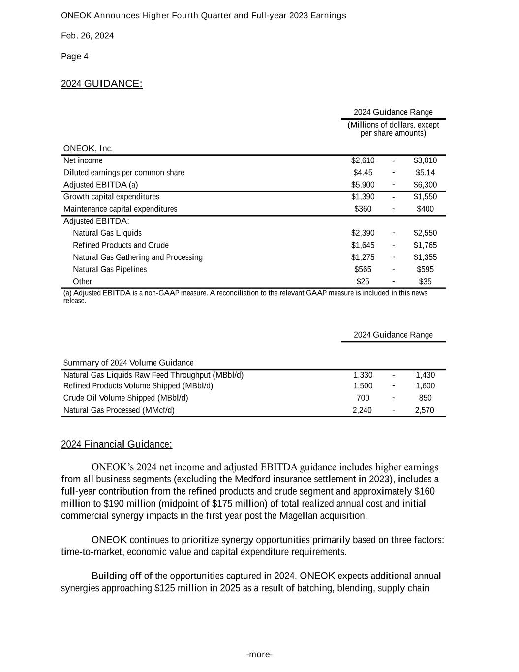 ONEOK Announces Higher Fourth Quarter and Full-year 2023 Earnings Feb. 26, 2024 Page 4 -more- 2024 GUIDANCE: 2024 Guidance Range (Millions of dollars, except per share amounts) ONEOK, Inc. Net income $2,610 - $3,010 Diluted earnings per common share $4.45 - $5.14 Adjusted EBITDA (a) $5,900 - $6,300 Growth capital expenditures $1,390 - $1,550 Maintenance capital expenditures $360 - $400 Adjusted EBITDA: Natural Gas Liquids $2,390 - $2,550 Refined Products and Crude $1,645 - $1,765 Natural Gas Gathering and Processing $1,275 - $1,355 Natural Gas Pipelines $565 - $595 Other $25 - $35 (a) Adjusted EBITDA is a non-GAAP measure. A reconciliation to the relevant GAAP measure is included in this news release. 2024 Guidance Range Summary of 2024 Volume Guidance Natural Gas Liquids Raw Feed Throughput (MBbl/d) 1,330 - 1,430 Refined Products Volume Shipped (MBbl/d) 1,500 - 1,600 Crude Oil Volume Shipped (MBbl/d) 700 - 850 Natural Gas Processed (MMcf/d) 2,240 - 2,570 2024 Financial Guidance: ONEOK’s 2024 net income and adjusted EBITDA guidance includes higher earnings from all business segments (excluding the Medford insurance settlement in 2023), includes a full-year contribution from the refined products and crude segment and approximately $160 million to $190 million (midpoint of $175 million) of total realized annual cost and initial commercial synergy impacts in the first year post the Magellan acquisition. ONEOK continues to prioritize synergy opportunities primarily based on three factors: time-to-market, economic value and capital expenditure requirements. Building off of the opportunities captured in 2024, ONEOK expects additional annual synergies approaching $125 million in 2025 as a result of batching, blending, supply chain
