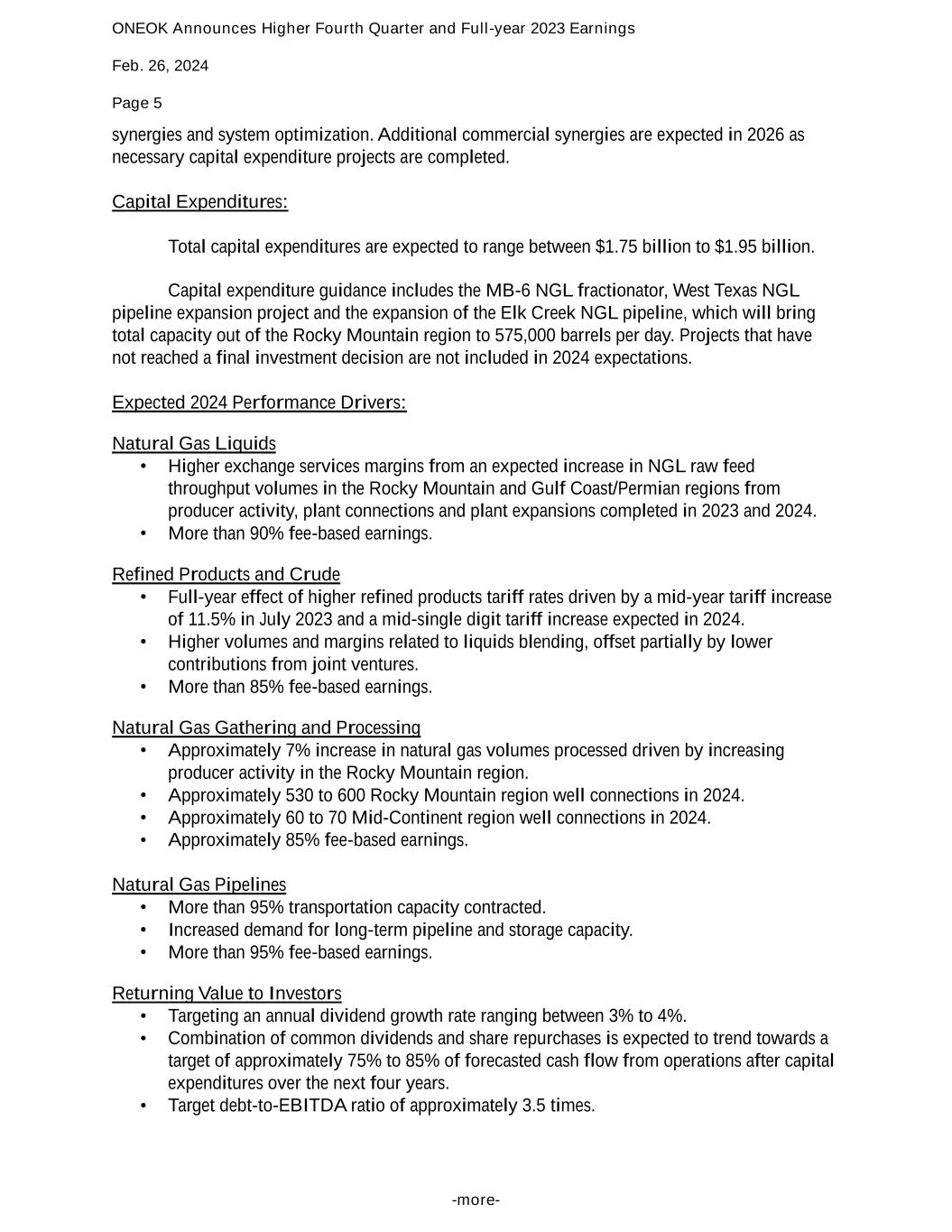 ONEOK Announces Higher Fourth Quarter and Full-year 2023 Earnings Feb. 26, 2024 Page 5 -more- synergies and system optimization. Additional commercial synergies are expected in 2026 as necessary capital expenditure projects are completed. Capital Expenditures: Total capital expenditures are expected to range between $1.75 billion to $1.95 billion. Capital expenditure guidance includes the MB-6 NGL fractionator, West Texas NGL pipeline expansion project and the expansion of the Elk Creek NGL pipeline, which will bring total capacity out of the Rocky Mountain region to 575,000 barrels per day. Projects that have not reached a final investment decision are not included in 2024 expectations. Expected 2024 Performance Drivers: Natural Gas Liquids • Higher exchange services margins from an expected increase in NGL raw feed throughput volumes in the Rocky Mountain and Gulf Coast/Permian regions from producer activity, plant connections and plant expansions completed in 2023 and 2024. • More than 90% fee-based earnings. Refined Products and Crude • Full-year effect of higher refined products tariff rates driven by a mid-year tariff increase of 11.5% in July 2023 and a mid-single digit tariff increase expected in 2024. • Higher volumes and margins related to liquids blending, offset partially by lower contributions from joint ventures. • More than 85% fee-based earnings. Natural Gas Gathering and Processing • Approximately 7% increase in natural gas volumes processed driven by increasing producer activity in the Rocky Mountain region. • Approximately 530 to 600 Rocky Mountain region well connections in 2024. • Approximately 60 to 70 Mid-Continent region well connections in 2024. • Approximately 85% fee-based earnings. Natural Gas Pipelines • More than 95% transportation capacity contracted. • Increased demand for long-term pipeline and storage capacity. • More than 95% fee-based earnings. Returning Value to Investors • Targeting an annual dividend growth rate ranging between 3% to 4%. • Combination of common dividends and share repurchases is expected to trend towards a target of approximately 75% to 85% of forecasted cash flow from operations after capital expenditures over the next four years. • Target debt-to-EBITDA ratio of approximately 3.5 times.