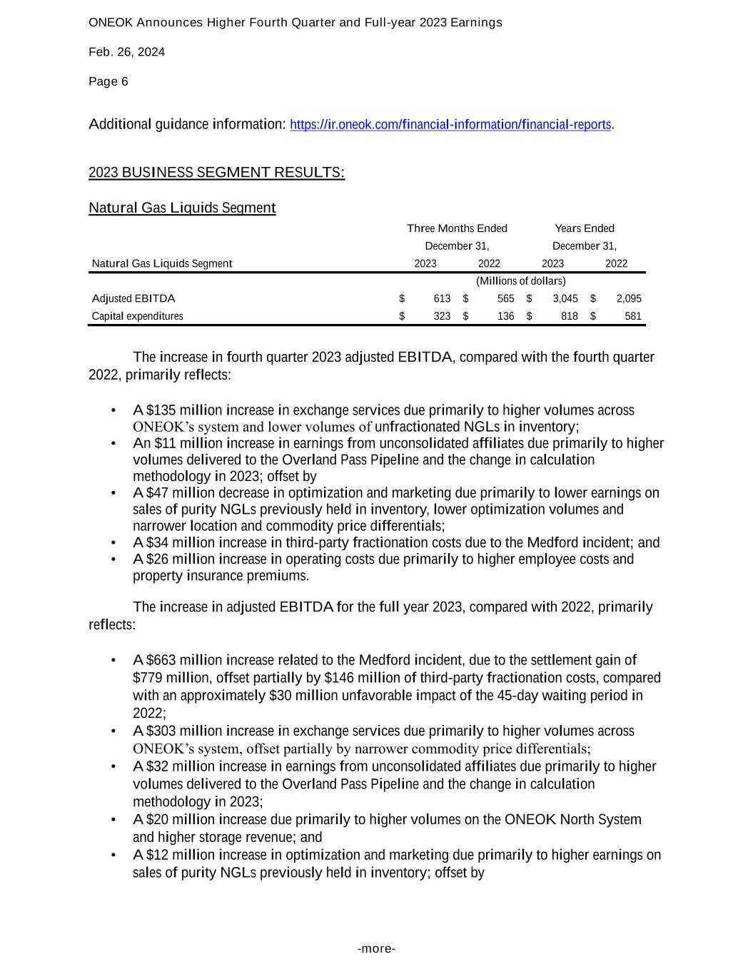 ONEOK Announces Higher Fourth Quarter and Full-year 2023 Earnings Feb. 26, 2024 Page 6 -more- Additional guidance information: https://ir.oneok.com/financial-information/financial-reports. 2023 BUSINESS SEGMENT RESULTS: Natural Gas Liquids Segment Three Months Ended Years Ended December 31, December 31, Natural Gas Liquids Segment 2023 2022 2023 2022 (Millions of dollars) Adjusted EBITDA $ 613 $ 565 $ 3,045 $ 2,095 Capital expenditures $ 323 $ 136 $ 818 $ 581 The increase in fourth quarter 2023 adjusted EBITDA, compared with the fourth quarter 2022, primarily reflects: • A $135 million increase in exchange services due primarily to higher volumes across ONEOK’s system and lower volumes of unfractionated NGLs in inventory; • An $11 million increase in earnings from unconsolidated affiliates due primarily to higher volumes delivered to the Overland Pass Pipeline and the change in calculation methodology in 2023; offset by • A $47 million decrease in optimization and marketing due primarily to lower earnings on sales of purity NGLs previously held in inventory, lower optimization volumes and narrower location and commodity price differentials; • A $34 million increase in third-party fractionation costs due to the Medford incident; and • A $26 million increase in operating costs due primarily to higher employee costs and property insurance premiums. The increase in adjusted EBITDA for the full year 2023, compared with 2022, primarily reflects: • A $663 million increase related to the Medford incident, due to the settlement gain of $779 million, offset partially by $146 million of third-party fractionation costs, compared with an approximately $30 million unfavorable impact of the 45-day waiting period in 2022; • A $303 million increase in exchange services due primarily to higher volumes across ONEOK’s system, offset partially by narrower commodity price differentials; • A $32 million increase in earnings from unconsolidated affiliates due primarily to higher volumes delivered to the Overland Pass Pipeline and the change in calculation methodology in 2023; • A $20 million increase due primarily to higher volumes on the ONEOK North System and higher storage revenue; and • A $12 million increase in optimization and marketing due primarily to higher earnings on sales of purity NGLs previously held in inventory; offset by