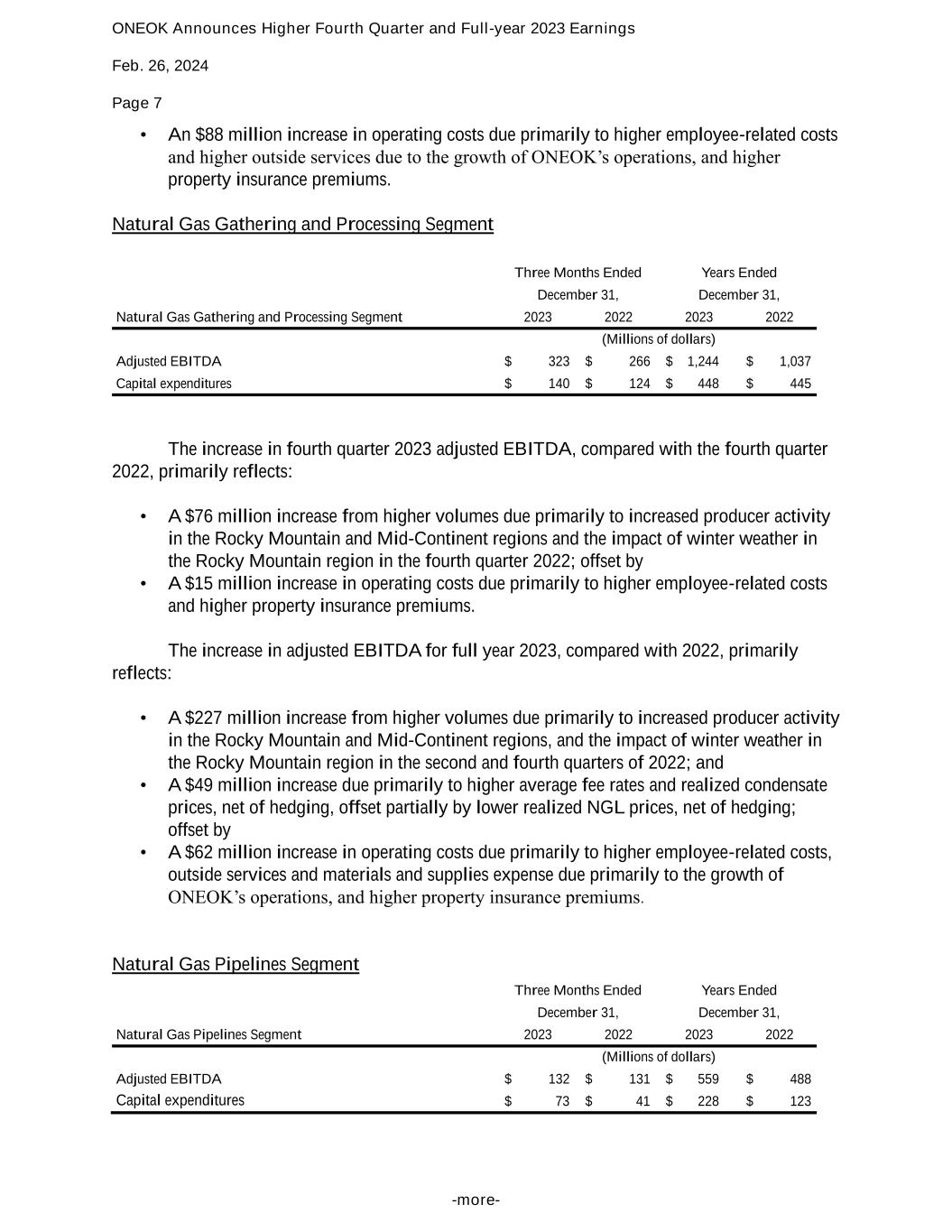 ONEOK Announces Higher Fourth Quarter and Full-year 2023 Earnings Feb. 26, 2024 Page 7 -more- • An $88 million increase in operating costs due primarily to higher employee-related costs and higher outside services due to the growth of ONEOK’s operations, and higher property insurance premiums. Natural Gas Gathering and Processing Segment Three Months Ended Years Ended December 31, December 31, Natural Gas Gathering and Processing Segment 2023 2022 2023 2022 (Millions of dollars) Adjusted EBITDA $ 323 $ 266 $ 1,244 $ 1,037 Capital expenditures $ 140 $ 124 $ 448 $ 445 The increase in fourth quarter 2023 adjusted EBITDA, compared with the fourth quarter 2022, primarily reflects: • A $76 million increase from higher volumes due primarily to increased producer activity in the Rocky Mountain and Mid-Continent regions and the impact of winter weather in the Rocky Mountain region in the fourth quarter 2022; offset by • A $15 million increase in operating costs due primarily to higher employee-related costs and higher property insurance premiums. The increase in adjusted EBITDA for full year 2023, compared with 2022, primarily reflects: • A $227 million increase from higher volumes due primarily to increased producer activity in the Rocky Mountain and Mid-Continent regions, and the impact of winter weather in the Rocky Mountain region in the second and fourth quarters of 2022; and • A $49 million increase due primarily to higher average fee rates and realized condensate prices, net of hedging, offset partially by lower realized NGL prices, net of hedging; offset by • A $62 million increase in operating costs due primarily to higher employee-related costs, outside services and materials and supplies expense due primarily to the growth of ONEOK’s operations, and higher property insurance premiums. Natural Gas Pipelines Segment Three Months Ended Years Ended December 31, December 31, Natural Gas Pipelines Segment 2023 2022 2023 2022 (Millions of dollars) Adjusted EBITDA $ 132 $ 131 $ 559 $ 488 Capital expenditures $ 73 $ 41 $ 228 $ 123