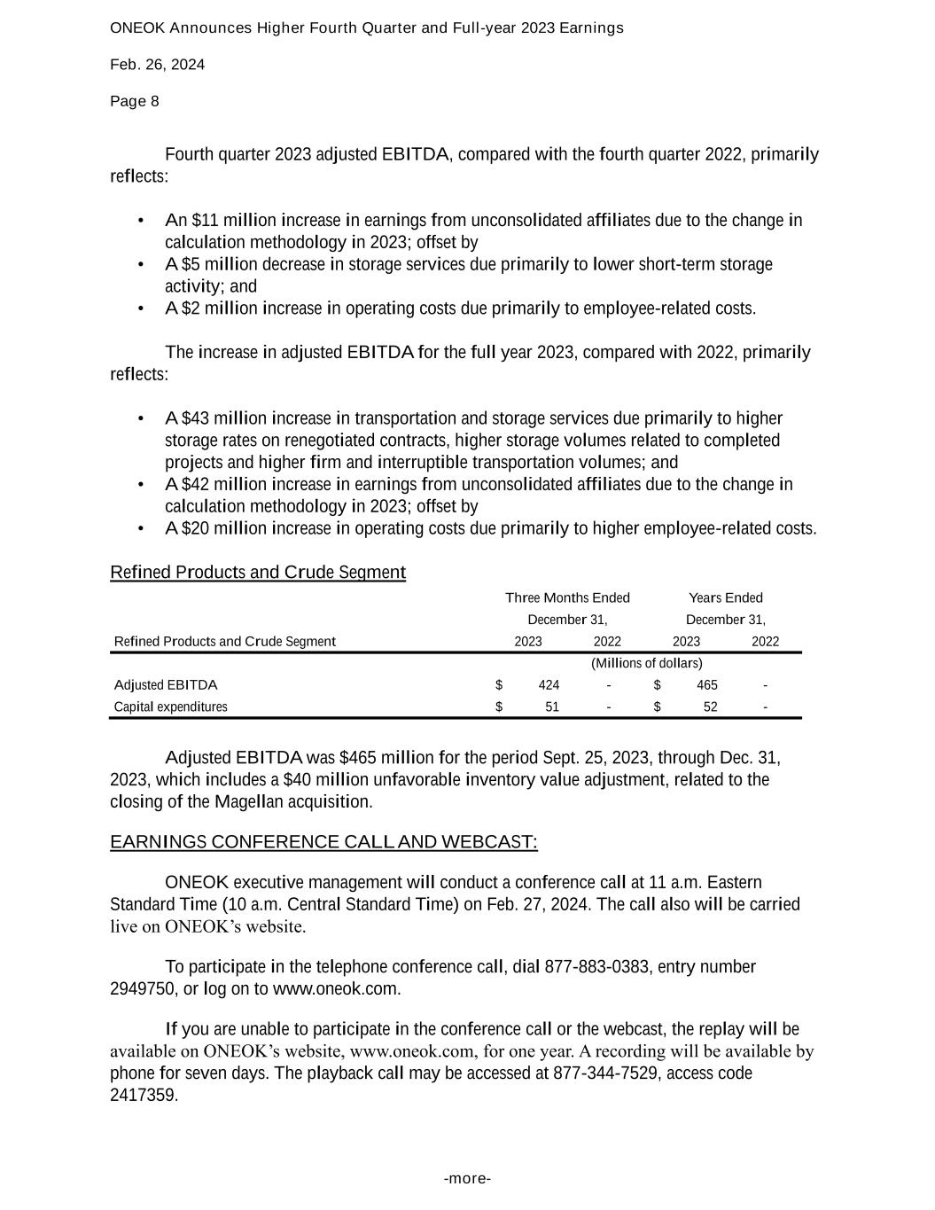 ONEOK Announces Higher Fourth Quarter and Full-year 2023 Earnings Feb. 26, 2024 Page 8 -more- Fourth quarter 2023 adjusted EBITDA, compared with the fourth quarter 2022, primarily reflects: • An $11 million increase in earnings from unconsolidated affiliates due to the change in calculation methodology in 2023; offset by • A $5 million decrease in storage services due primarily to lower short-term storage activity; and • A $2 million increase in operating costs due primarily to employee-related costs. The increase in adjusted EBITDA for the full year 2023, compared with 2022, primarily reflects: • A $43 million increase in transportation and storage services due primarily to higher storage rates on renegotiated contracts, higher storage volumes related to completed projects and higher firm and interruptible transportation volumes; and • A $42 million increase in earnings from unconsolidated affiliates due to the change in calculation methodology in 2023; offset by • A $20 million increase in operating costs due primarily to higher employee-related costs. Refined Products and Crude Segment Three Months Ended Years Ended December 31, December 31, Refined Products and Crude Segment 2023 2022 2023 2022 (Millions of dollars) Adjusted EBITDA $ 424 - $ 465 - Capital expenditures $ 51 - $ 52 - Adjusted EBITDA was $465 million for the period Sept. 25, 2023, through Dec. 31, 2023, which includes a $40 million unfavorable inventory value adjustment, related to the closing of the Magellan acquisition. EARNINGS CONFERENCE CALL AND WEBCAST: ONEOK executive management will conduct a conference call at 11 a.m. Eastern Standard Time (10 a.m. Central Standard Time) on Feb. 27, 2024. The call also will be carried live on ONEOK’s website. To participate in the telephone conference call, dial 877-883-0383, entry number 2949750, or log on to www.oneok.com. If you are unable to participate in the conference call or the webcast, the replay will be available on ONEOK’s website, www.oneok.com, for one year. A recording will be available by phone for seven days. The playback call may be accessed at 877-344-7529, access code 2417359.