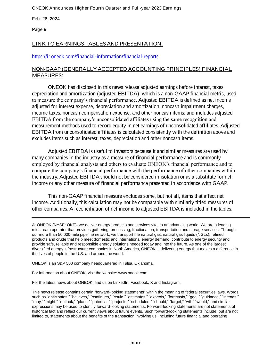 ONEOK Announces Higher Fourth Quarter and Full-year 2023 Earnings Feb. 26, 2024 Page 9 -more- LINK TO EARNINGS TABLES AND PRESENTATION: https://ir.oneok.com/financial-information/financial-reports NON-GAAP (GENERALLY ACCEPTED ACCOUNTING PRINCIPLES) FINANCIAL MEASURES: ONEOK has disclosed in this news release adjusted earnings before interest, taxes, depreciation and amortization (adjusted EBITDA), which is a non-GAAP financial metric, used to measure the company’s financial performance. Adjusted EBITDA is defined as net income adjusted for interest expense, depreciation and amortization, noncash impairment charges, income taxes, noncash compensation expense, and other noncash items; and includes adjusted EBITDA from the company’s unconsolidated affiliates using the same recognition and measurement methods used to record equity in net earnings of unconsolidated affiliates. Adjusted EBITDA from unconsolidated affiliates is calculated consistently with the definition above and excludes items such as interest, taxes, depreciation and other noncash items. Adjusted EBITDA is useful to investors because it and similar measures are used by many companies in the industry as a measure of financial performance and is commonly employed by financial analysts and others to evaluate ONEOK’s financial performance and to compare the company’s financial performance with the performance of other companies within the industry. Adjusted EBITDA should not be considered in isolation or as a substitute for net income or any other measure of financial performance presented in accordance with GAAP. This non-GAAP financial measure excludes some, but not all, items that affect net income. Additionally, this calculation may not be comparable with similarly titled measures of other companies. A reconciliation of net income to adjusted EBITDA is included in the tables. At ONEOK (NYSE: OKE), we deliver energy products and services vital to an advancing world. We are a leading midstream operator that provides gathering, processing, fractionation, transportation and storage services. Through our more than 50,000-mile pipeline network, we transport the natural gas, natural gas liquids (NGLs), refined products and crude that help meet domestic and international energy demand, contribute to energy security and provide safe, reliable and responsible energy solutions needed today and into the future. As one of the largest diversified energy infrastructure companies in North America, ONEOK is delivering energy that makes a difference in the lives of people in the U.S. and around the world. ONEOK is an S&P 500 company headquartered in Tulsa, Oklahoma. For information about ONEOK, visit the website: www.oneok.com. For the latest news about ONEOK, find us on LinkedIn, Facebook, X and Instagram. This news release contains certain "forward-looking statements" within the meaning of federal securities laws. Words such as “anticipates,” “believes,” “continues,” “could,” “estimates,” “expects,” “forecasts,” “goal,” “guidance,” “intends,” “may,” “might,” “outlook,” “plans,” “potential,” “projects,” “scheduled,” “should,” “target,” “will,” “would,” and similar expressions may be used to identify forward-looking statements. Forward-looking statements are not statements of historical fact and reflect our current views about future events. Such forward-looking statements include, but are not limited to, statements about the benefits of the transaction involving us, including future financial and operating
