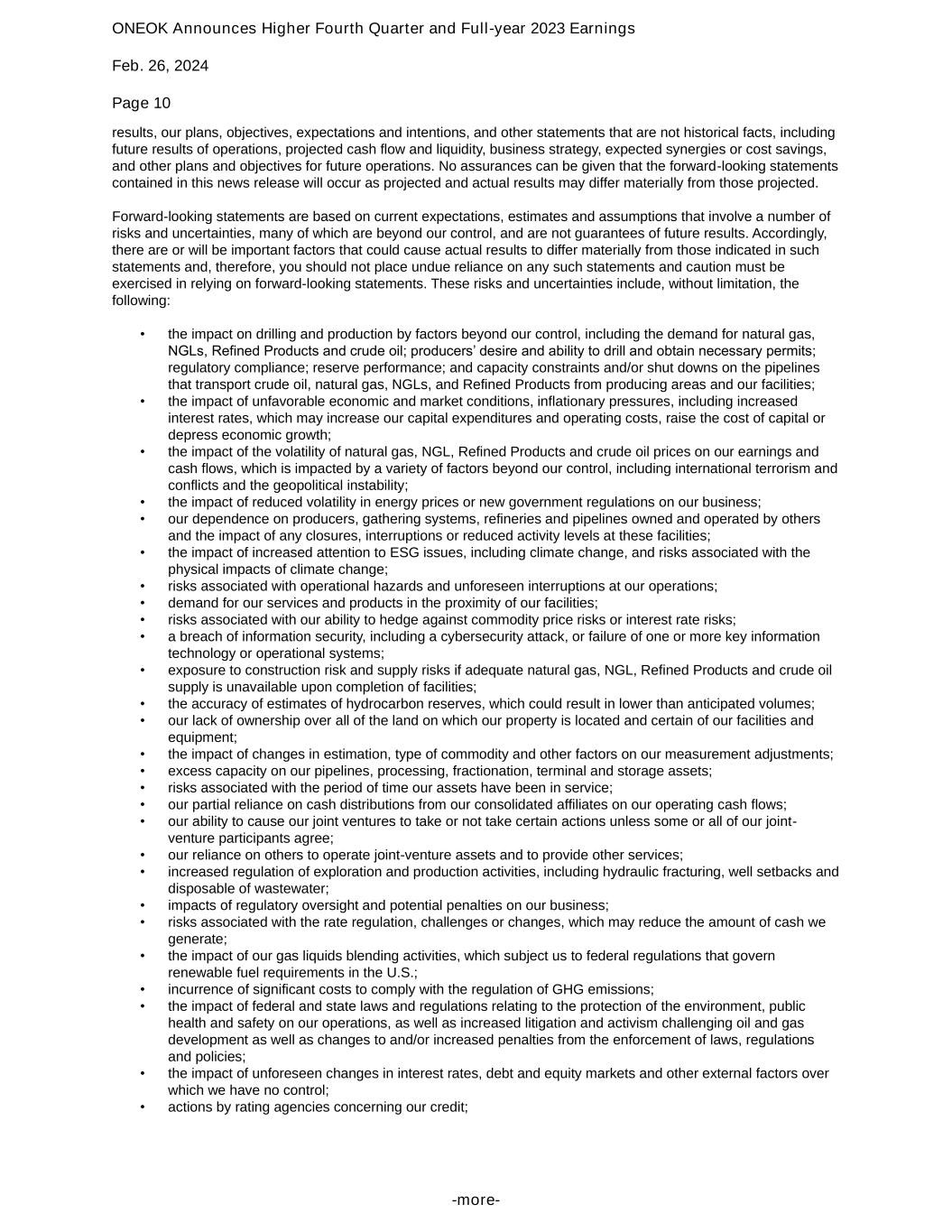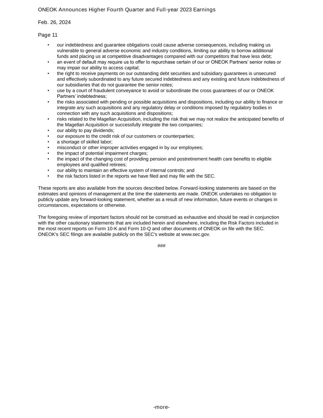 ONEOK Announces Higher Fourth Quarter and Full-year 2023 Earnings Feb. 26, 2024 Page 11 -more- • our indebtedness and guarantee obligations could cause adverse consequences, including making us vulnerable to general adverse economic and industry conditions, limiting our ability to borrow additional funds and placing us at competitive disadvantages compared with our competitors that have less debt; • an event of default may require us to offer to repurchase certain of our or ONEOK Partners’ senior notes or may impair our ability to access capital; • the right to receive payments on our outstanding debt securities and subsidiary guarantees is unsecured and effectively subordinated to any future secured indebtedness and any existing and future indebtedness of our subsidiaries that do not guarantee the senior notes; • use by a court of fraudulent conveyance to avoid or subordinate the cross guarantees of our or ONEOK Partners’ indebtedness; • the risks associated with pending or possible acquisitions and dispositions, including our ability to finance or integrate any such acquisitions and any regulatory delay or conditions imposed by regulatory bodies in connection with any such acquisitions and dispositions; • risks related to the Magellan Acquisition, including the risk that we may not realize the anticipated benefits of the Magellan Acquisition or successfully integrate the two companies; • our ability to pay dividends; • our exposure to the credit risk of our customers or counterparties; • a shortage of skilled labor; • misconduct or other improper activities engaged in by our employees; • the impact of potential impairment charges; • the impact of the changing cost of providing pension and postretirement health care benefits to eligible employees and qualified retirees; • our ability to maintain an effective system of internal controls; and • the risk factors listed in the reports we have filed and may file with the SEC. These reports are also available from the sources described below. Forward-looking statements are based on the estimates and opinions of management at the time the statements are made. ONEOK undertakes no obligation to publicly update any forward-looking statement, whether as a result of new information, future events or changes in circumstances, expectations or otherwise. The foregoing review of important factors should not be construed as exhaustive and should be read in conjunction with the other cautionary statements that are included herein and elsewhere, including the Risk Factors included in the most recent reports on Form 10-K and Form 10-Q and other documents of ONEOK on file with the SEC. ONEOK's SEC filings are available publicly on the SEC's website at www.sec.gov. ###