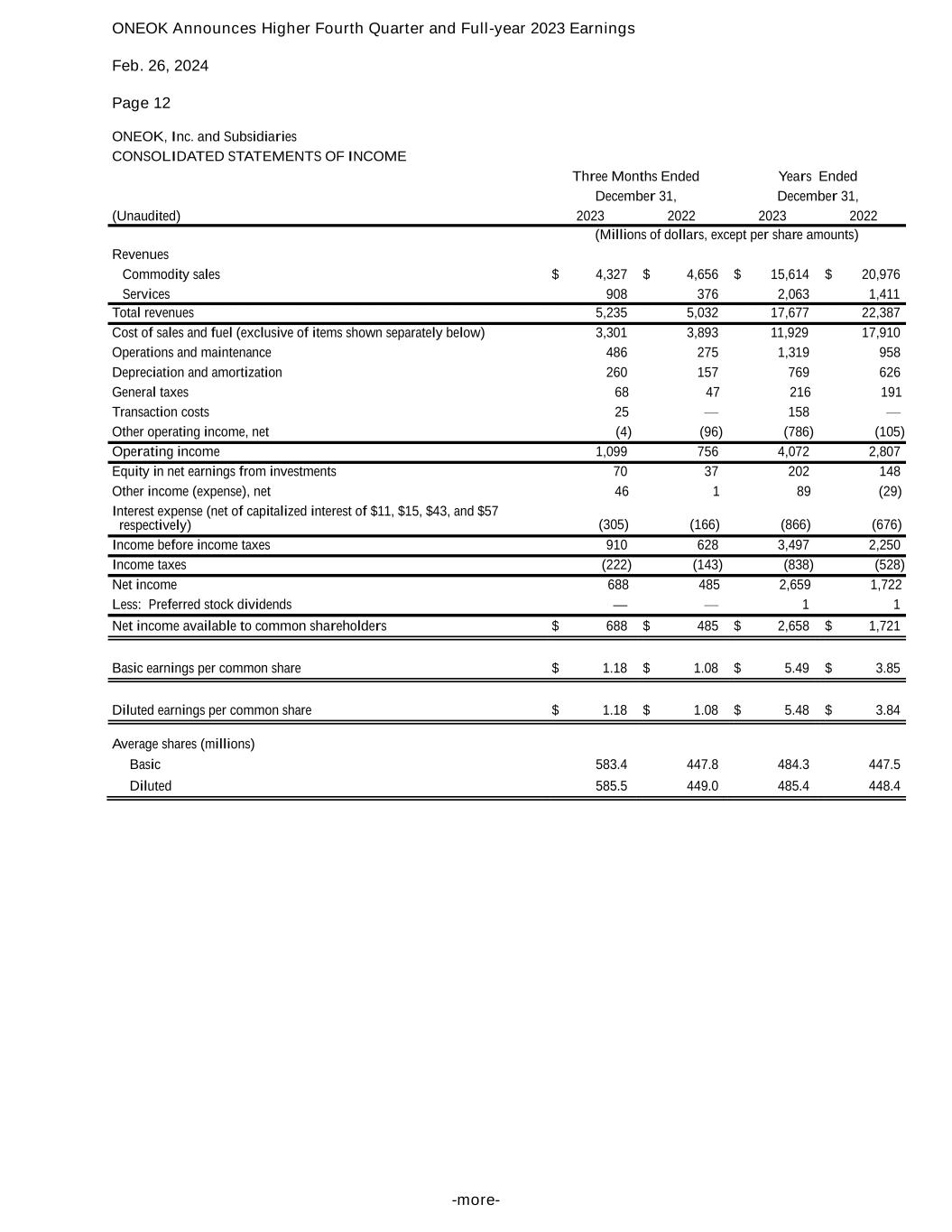 ONEOK Announces Higher Fourth Quarter and Full-year 2023 Earnings Feb. 26, 2024 Page 12 -more- ONEOK, Inc. and Subsidiaries CONSOLIDATED STATEMENTS OF INCOME Three Months Ended Years Ended December 31, December 31, (Unaudited) 2023 2022 2023 2022 (Millions of dollars, except per share amounts) Revenues Commodity sales $ 4,327 $ 4,656 $ 15,614 $ 20,976 Services 908 376 2,063 1,411 Total revenues 5,235 5,032 17,677 22,387 Cost of sales and fuel (exclusive of items shown separately below) 3,301 3,893 11,929 17,910 Operations and maintenance 486 275 1,319 958 Depreciation and amortization 260 157 769 626 General taxes 68 47 216 191 Transaction costs 25 — 158 — Other operating income, net (4) (96) (786) (105) Operating income 1,099 756 4,072 2,807 Equity in net earnings from investments 70 37 202 148 Other income (expense), net 46 1 89 (29) Interest expense (net of capitalized interest of $11, $15, $43, and $57 respectively) (305) (166) (866) (676) Income before income taxes 910 628 3,497 2,250 Income taxes (222) (143) (838) (528) Net income 688 485 2,659 1,722 Less: Preferred stock dividends — — 1 1 Net income available to common shareholders $ 688 $ 485 $ 2,658 $ 1,721 Basic earnings per common share $ 1.18 $ 1.08 $ 5.49 $ 3.85 Diluted earnings per common share $ 1.18 $ 1.08 $ 5.48 $ 3.84 Average shares (millions) Basic 583.4 447.8 484.3 447.5 Diluted 585.5 449.0 485.4 448.4