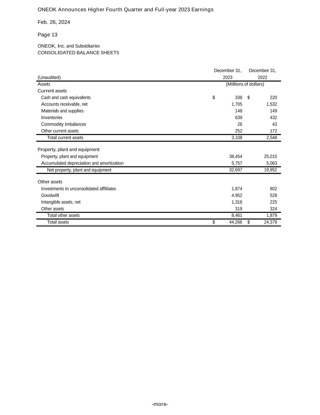 ONEOK Announces Higher Fourth Quarter and Full-year 2023 Earnings Feb. 26, 2024 Page 13 -more- ONEOK, Inc. and Subsidiaries CONSOLIDATED BALANCE SHEETS December 31, December 31, (Unaudited) 2023 2022 Assets (Millions of dollars) Current assets Cash and cash equivalents $ 338 $ 220 Accounts receivable, net 1,705 1,532 Materials and supplies 148 149 Inventories 639 432 Commodity imbalances 26 43 Other current assets 252 172 Total current assets 3,108 2,548 Property, plant and equipment Property, plant and equipment 38,454 25,015 Accumulated depreciation and amortization 5,757 5,063 Net property, plant and equipment 32,697 19,952 Other assets Investments in unconsolidated affiliates 1,874 802 Goodwill 4,952 528 Intangible assets, net 1,316 225 Other assets 319 324 Total other assets 8,461 1,879 Total assets $ 44,266 $ 24,379