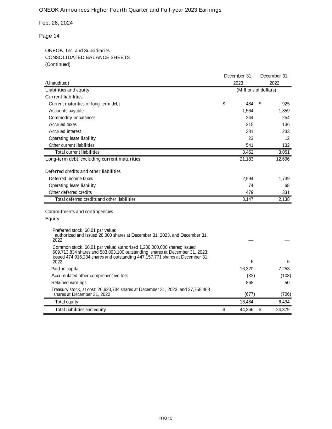 ONEOK Announces Higher Fourth Quarter and Full-year 2023 Earnings Feb. 26, 2024 Page 14 -more- ONEOK, Inc. and Subsidiaries CONSOLIDATED BALANCE SHEETS (Continued) December 31, December 31, (Unaudited) 2023 2022 Liabilities and equity (Millions of dollars) Current liabilities Current maturities of long-term debt $ 484 $ 925 Accounts payable 1,564 1,359 Commodity imbalances 244 254 Accrued taxes 215 136 Accrued interest 381 233 Operating lease liability 23 12 Other current liabilities 541 132 Total current liabilities 3,452 3,051 Long-term debt, excluding current maturities 21,183 12,696 Deferred credits and other liabilities Deferred income taxes 2,594 1,739 Operating lease liability 74 68 Other deferred credits 479 331 Total deferred credits and other liabilities 3,147 2,138 Commitments and contingencies Equity Preferred stock, $0.01 par value: authorized and issued 20,000 shares at December 31, 2023, and December 31, 2022 — — Common stock, $0.01 par value: authorized 1,200,000,000 shares; issued 609,713,834 shares and 583,093,100 outstanding shares at December 31, 2023; issued 474,916,234 shares and outstanding 447,157,771 shares at December 31, 2022 6 5 Paid-in capital 16,320 7,253 Accumulated other comprehensive loss (33) (108) Retained earnings 868 50 Treasury stock, at cost: 26,620,734 shares at December 31, 2023, and 27,758,463 shares at December 31, 2022 (677) (706) Total equity 16,484 6,494 Total liabilities and equity $ 44,266 $ 24,379