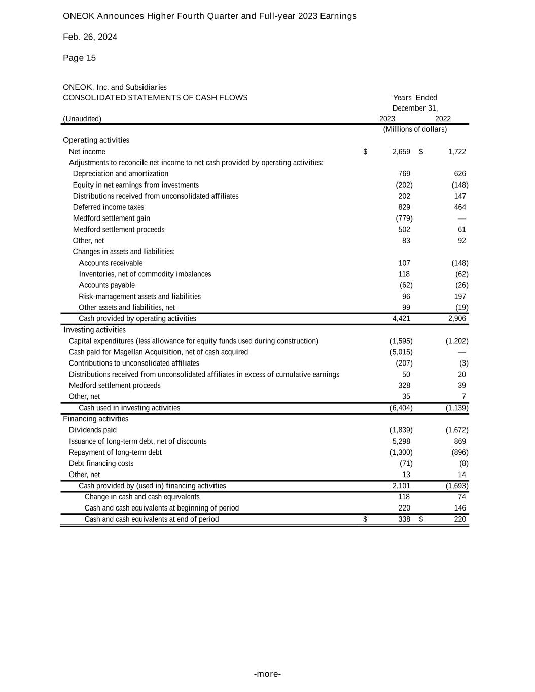ONEOK Announces Higher Fourth Quarter and Full-year 2023 Earnings Feb. 26, 2024 Page 15 -more- ONEOK, Inc. and Subsidiaries CONSOLIDATED STATEMENTS OF CASH FLOWS Years Ended December 31, (Unaudited) 2023 2022 (Millions of dollars) Operating activities Net income $ 2,659 $ 1,722 Adjustments to reconcile net income to net cash provided by operating activities: Depreciation and amortization 769 626 Equity in net earnings from investments (202) (148) Distributions received from unconsolidated affiliates 202 147 Deferred income taxes 829 464 Medford settlement gain (779) — Medford settlement proceeds 502 61 Other, net 83 92 Changes in assets and liabilities: Accounts receivable 107 (148) Inventories, net of commodity imbalances 118 (62) Accounts payable (62) (26) Risk-management assets and liabilities 96 197 Other assets and liabilities, net 99 (19) Cash provided by operating activities 4,421 2,906 Investing activities Capital expenditures (less allowance for equity funds used during construction) (1,595) (1,202) Cash paid for Magellan Acquisition, net of cash acquired (5,015) — Contributions to unconsolidated affiliates (207) (3) Distributions received from unconsolidated affiliates in excess of cumulative earnings 50 20 Medford settlement proceeds 328 39 Other, net 35 7 Cash used in investing activities (6,404) (1,139) Financing activities Dividends paid (1,839) (1,672) Issuance of long-term debt, net of discounts 5,298 869 Repayment of long-term debt (1,300) (896) Debt financing costs (71) (8) Other, net 13 14 Cash provided by (used in) financing activities 2,101 (1,693) Change in cash and cash equivalents 118 74 Cash and cash equivalents at beginning of period 220 146 Cash and cash equivalents at end of period $ 338 $ 220