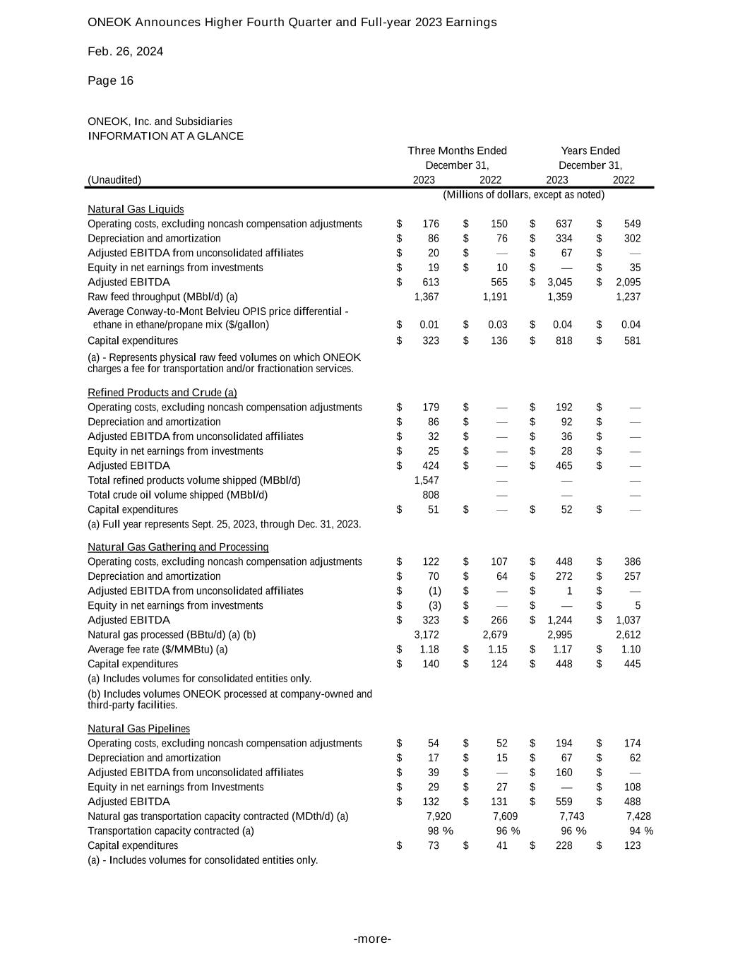 ONEOK Announces Higher Fourth Quarter and Full-year 2023 Earnings Feb. 26, 2024 Page 16 -more- ONEOK, Inc. and Subsidiaries INFORMATION AT A GLANCE Three Months Ended Years Ended December 31, December 31, (Unaudited) 2023 2022 2023 2022 (Millions of dollars, except as noted) Natural Gas Liquids Operating costs, excluding noncash compensation adjustments $ 176 $ 150 $ 637 $ 549 Depreciation and amortization $ 86 $ 76 $ 334 $ 302 Adjusted EBITDA from unconsolidated affiliates $ 20 $ — $ 67 $ — Equity in net earnings from investments $ 19 $ 10 $ — $ 35 Adjusted EBITDA $ 613 565 $ 3,045 $ 2,095 Raw feed throughput (MBbl/d) (a) 1,367 1,191 1,359 1,237 Average Conway-to-Mont Belvieu OPIS price differential - ethane in ethane/propane mix ($/gallon) $ 0.01 $ 0.03 $ 0.04 $ 0.04 Capital expenditures $ 323 $ 136 $ 818 $ 581 (a) - Represents physical raw feed volumes on which ONEOK charges a fee for transportation and/or fractionation services. Refined Products and Crude (a) Operating costs, excluding noncash compensation adjustments $ 179 $ — $ 192 $ — Depreciation and amortization $ 86 $ — $ 92 $ — Adjusted EBITDA from unconsolidated affiliates $ 32 $ — $ 36 $ — Equity in net earnings from investments $ 25 $ — $ 28 $ — Adjusted EBITDA $ 424 $ — $ 465 $ — Total refined products volume shipped (MBbl/d) 1,547 — — — Total crude oil volume shipped (MBbl/d) 808 — — — Capital expenditures $ 51 $ — $ 52 $ — (a) Full year represents Sept. 25, 2023, through Dec. 31, 2023. Natural Gas Gathering and Processing Operating costs, excluding noncash compensation adjustments $ 122 $ 107 $ 448 $ 386 Depreciation and amortization $ 70 $ 64 $ 272 $ 257 Adjusted EBITDA from unconsolidated affiliates $ (1) $ — $ 1 $ — Equity in net earnings from investments $ (3) $ — $ — $ 5 Adjusted EBITDA $ 323 $ 266 $ 1,244 $ 1,037 Natural gas processed (BBtu/d) (a) (b) 3,172 2,679 2,995 2,612 Average fee rate ($/MMBtu) (a) $ 1.18 $ 1.15 $ 1.17 $ 1.10 Capital expenditures $ 140 $ 124 $ 448 $ 445 (a) Includes volumes for consolidated entities only. (b) Includes volumes ONEOK processed at company-owned and third-party facilities. Natural Gas Pipelines Operating costs, excluding noncash compensation adjustments $ 54 $ 52 $ 194 $ 174 Depreciation and amortization $ 17 $ 15 $ 67 $ 62 Adjusted EBITDA from unconsolidated affiliates $ 39 $ — $ 160 $ — Equity in net earnings from Investments $ 29 $ 27 $ — $ 108 Adjusted EBITDA $ 132 $ 131 $ 559 $ 488 Natural gas transportation capacity contracted (MDth/d) (a) 7,920 7,609 7,743 7,428 Transportation capacity contracted (a) 98 % 96 % 96 % 94 % Capital expenditures $ 73 $ 41 $ 228 $ 123 (a) - Includes volumes for consolidated entities only.