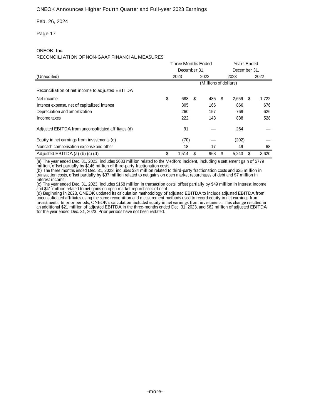 ONEOK Announces Higher Fourth Quarter and Full-year 2023 Earnings Feb. 26, 2024 Page 17 -more- ONEOK, Inc. RECONCILIATION OF NON-GAAP FINANCIAL MEASURES Three Months Ended Years Ended December 31, December 31, (Unaudited) 2023 2022 2023 2022 (Millions of dollars) Reconciliation of net income to adjusted EBITDA Net income $ 688 $ 485 $ 2,659 $ 1,722 Interest expense, net of capitalized interest 305 166 866 676 Depreciation and amortization 260 157 769 626 Income taxes 222 143 838 528 Adjusted EBITDA from unconsolidated affiliates (d) 91 — 264 — Equity in net earnings from investments (d) (70) — (202) — Noncash compensation expense and other 18 17 49 68 Adjusted EBITDA (a) (b) (c) (d) $ 1,514 $ 968 $ 5,243 $ 3,620 (a) The year ended Dec. 31, 2023, includes $633 million related to the Medford incident, including a settlement gain of $779 million, offset partially by $146 million of third-party fractionation costs. (b) The three months ended Dec. 31, 2023, includes $34 million related to third-party fractionation costs and $25 million in transaction costs, offset partially by $37 million related to net gains on open market repurchases of debt and $7 million in interest income. (c) The year ended Dec. 31, 2023, includes $158 million in transaction costs, offset partially by $49 million in interest income and $41 million related to net gains on open market repurchases of debt. (d) Beginning in 2023, ONEOK updated its calculation methodology of adjusted EBITDA to include adjusted EBITDA from unconsolidated affiliates using the same recognition and measurement methods used to record equity in net earnings from investments. In prior periods, ONEOK’s calculation included equity in net earnings from investments. This change resulted in an additional $21 million of adjusted EBITDA in the three-months ended Dec. 31, 2023, and $62 million of adjusted EBITDA for the year ended Dec. 31, 2023. Prior periods have not been restated.