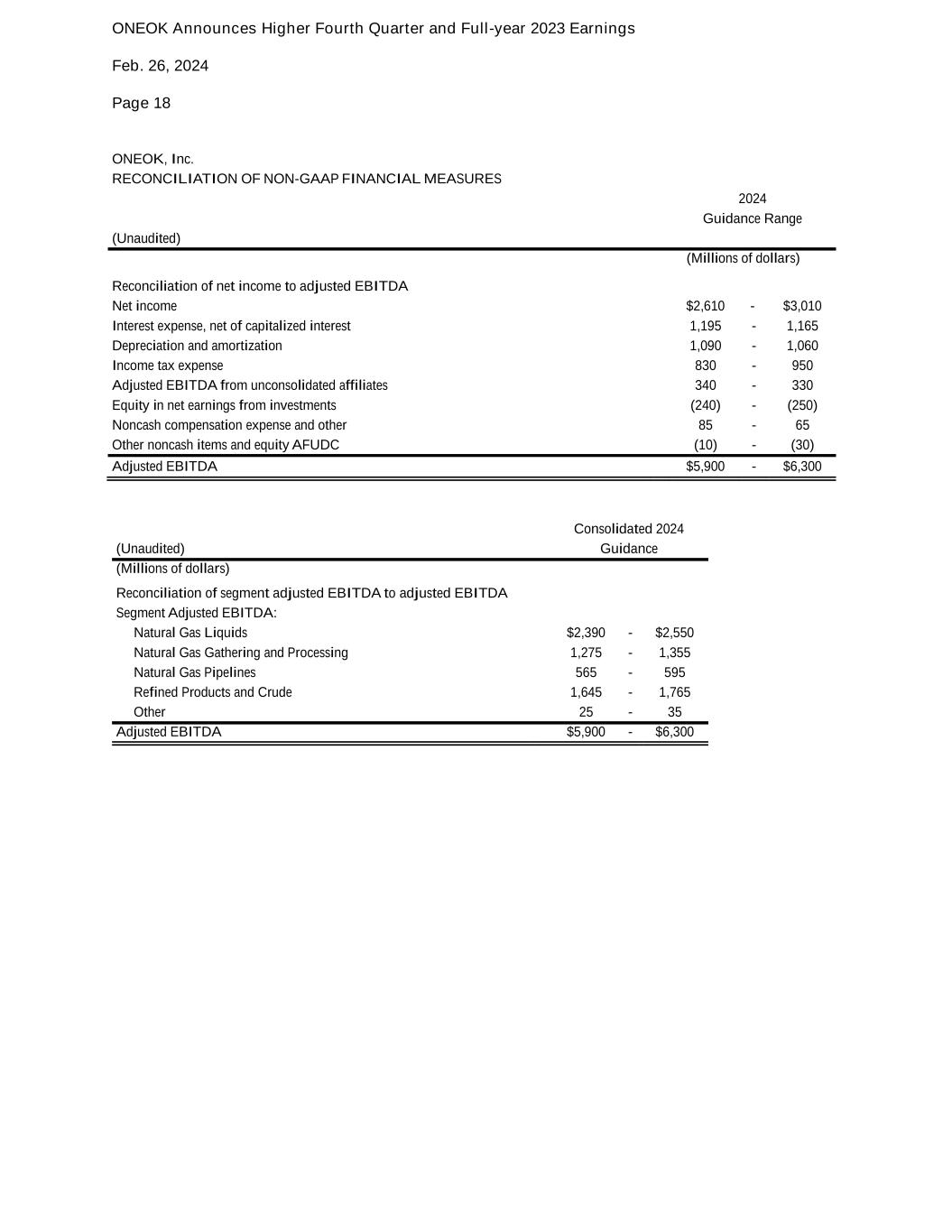 ONEOK Announces Higher Fourth Quarter and Full-year 2023 Earnings Feb. 26, 2024 Page 18 ONEOK, Inc. RECONCILIATION OF NON-GAAP FINANCIAL MEASURES 2024 Guidance Range (Unaudited) (Millions of dollars) Reconciliation of net income to adjusted EBITDA Net income $2,610 - $3,010 Interest expense, net of capitalized interest 1,195 - 1,165 Depreciation and amortization 1,090 - 1,060 Income tax expense 830 - 950 Adjusted EBITDA from unconsolidated affiliates 340 - 330 Equity in net earnings from investments (240) - (250) Noncash compensation expense and other 85 - 65 Other noncash items and equity AFUDC (10) - (30) Adjusted EBITDA $5,900 - $6,300 Consolidated 2024 (Unaudited) Guidance (Millions of dollars) Reconciliation of segment adjusted EBITDA to adjusted EBITDA Segment Adjusted EBITDA: Natural Gas Liquids $2,390 - $2,550 Natural Gas Gathering and Processing 1,275 - 1,355 Natural Gas Pipelines 565 - 595 Refined Products and Crude 1,645 - 1,765 Other 25 - 35 Adjusted EBITDA $5,900 - $6,300