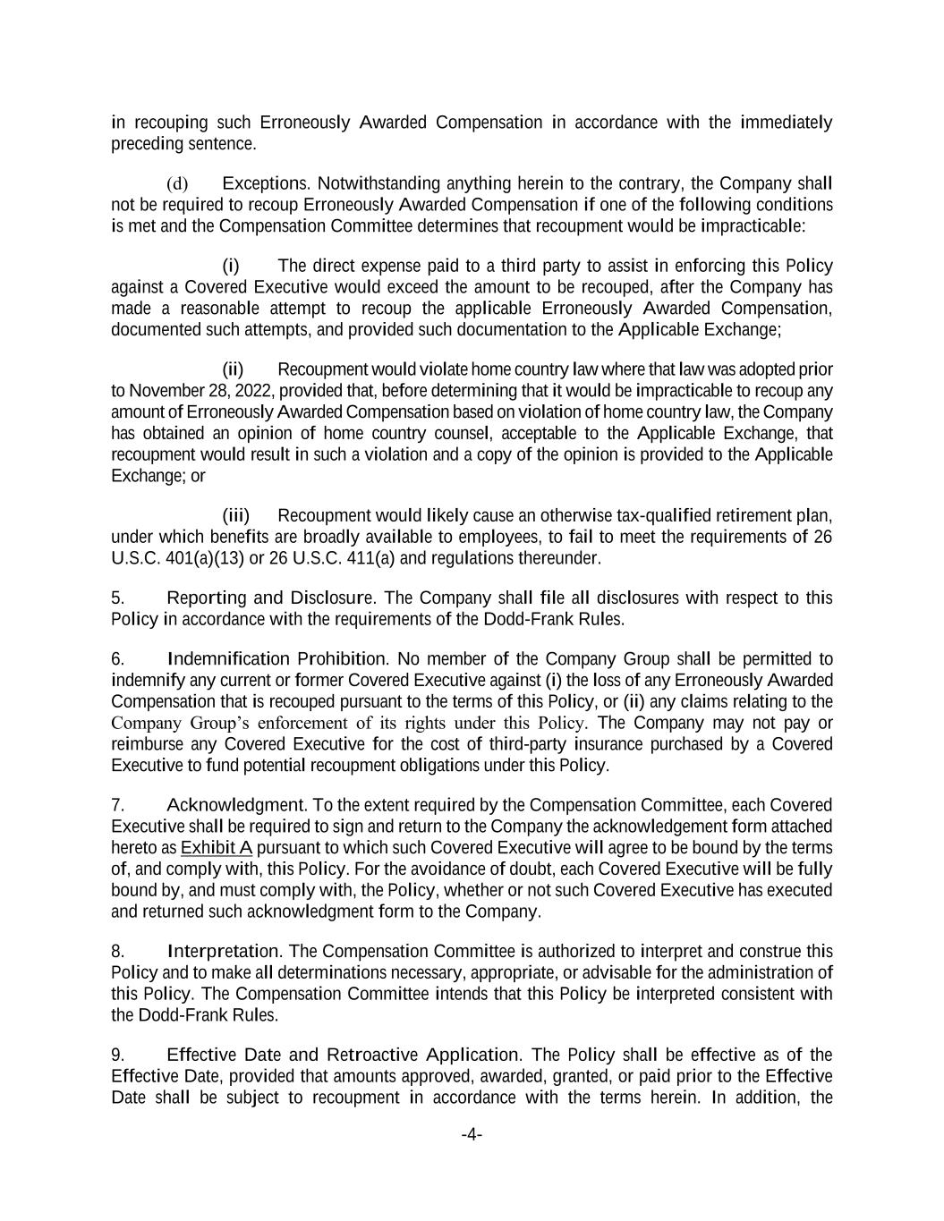 -4- in recouping such Erroneously Awarded Compensation in accordance with the immediately preceding sentence. (d) Exceptions. Notwithstanding anything herein to the contrary, the Company shall not be required to recoup Erroneously Awarded Compensation if one of the following conditions is met and the Compensation Committee determines that recoupment would be impracticable: (i) The direct expense paid to a third party to assist in enforcing this Policy against a Covered Executive would exceed the amount to be recouped, after the Company has made a reasonable attempt to recoup the applicable Erroneously Awarded Compensation, documented such attempts, and provided such documentation to the Applicable Exchange; (ii) Recoupment would violate home country law where that law was adopted prior to November 28, 2022, provided that, before determining that it would be impracticable to recoup any amount of Erroneously Awarded Compensation based on violation of home country law, the Company has obtained an opinion of home country counsel, acceptable to the Applicable Exchange, that recoupment would result in such a violation and a copy of the opinion is provided to the Applicable Exchange; or (iii) Recoupment would likely cause an otherwise tax-qualified retirement plan, under which benefits are broadly available to employees, to fail to meet the requirements of 26 U.S.C. 401(a)(13) or 26 U.S.C. 411(a) and regulations thereunder. 5. Reporting and Disclosure. The Company shall file all disclosures with respect to this Policy in accordance with the requirements of the Dodd-Frank Rules. 6. Indemnification Prohibition. No member of the Company Group shall be permitted to indemnify any current or former Covered Executive against (i) the loss of any Erroneously Awarded Compensation that is recouped pursuant to the terms of this Policy, or (ii) any claims relating to the Company Group’s enforcement of its rights under this Policy. The Company may not pay or reimburse any Covered Executive for the cost of third-party insurance purchased by a Covered Executive to fund potential recoupment obligations under this Policy. 7. Acknowledgment. To the extent required by the Compensation Committee, each Covered Executive shall be required to sign and return to the Company the acknowledgement form attached hereto as Exhibit A pursuant to which such Covered Executive will agree to be bound by the terms of, and comply with, this Policy. For the avoidance of doubt, each Covered Executive will be fully bound by, and must comply with, the Policy, whether or not such Covered Executive has executed and returned such acknowledgment form to the Company. 8. Interpretation. The Compensation Committee is authorized to interpret and construe this Policy and to make all determinations necessary, appropriate, or advisable for the administration of this Policy. The Compensation Committee intends that this Policy be interpreted consistent with the Dodd-Frank Rules. 9. Effective Date and Retroactive Application. The Policy shall be effective as of the Effective Date, provided that amounts approved, awarded, granted, or paid prior to the Effective Date shall be subject to recoupment in accordance with the terms herein. In addition, the