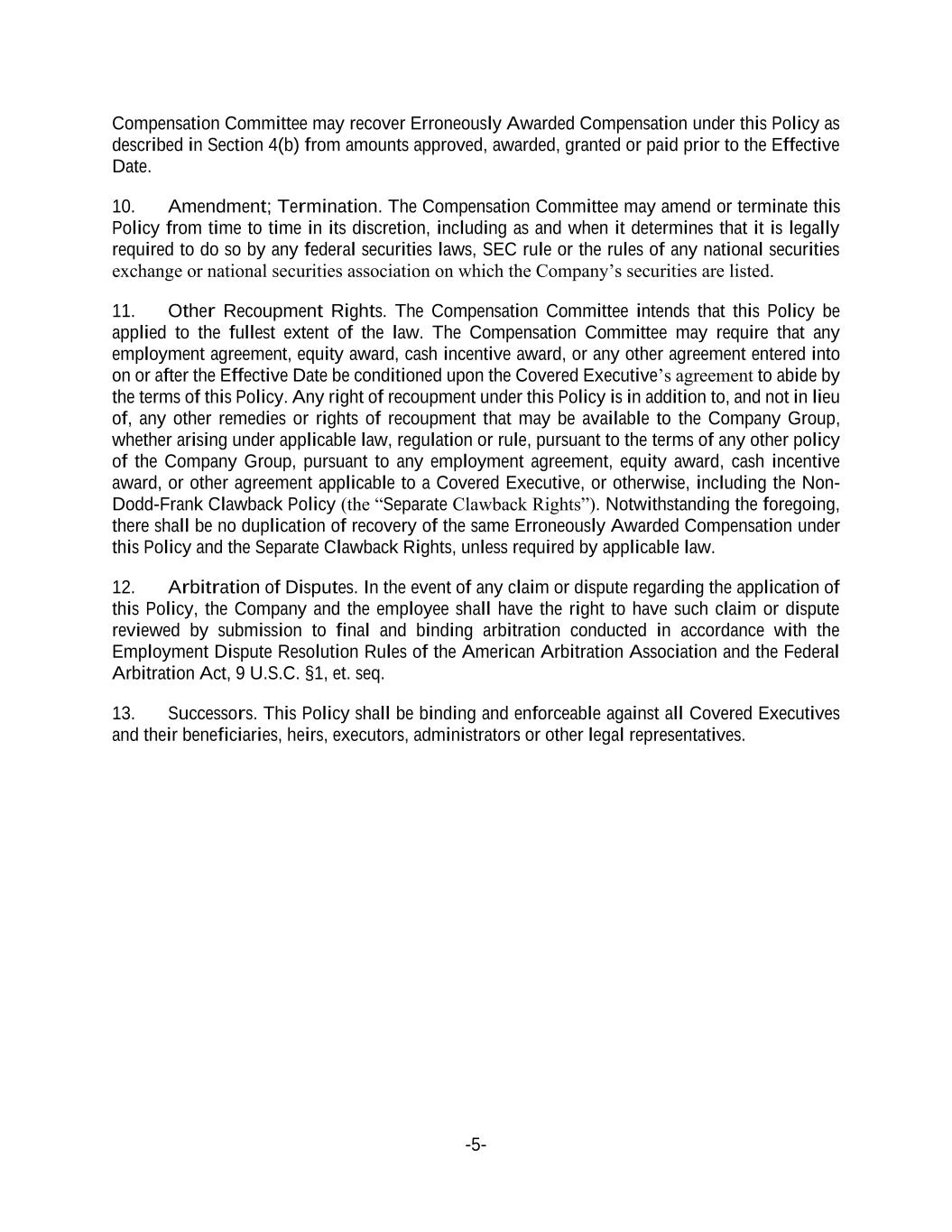 -5- Compensation Committee may recover Erroneously Awarded Compensation under this Policy as described in Section 4(b) from amounts approved, awarded, granted or paid prior to the Effective Date. 10. Amendment; Termination. The Compensation Committee may amend or terminate this Policy from time to time in its discretion, including as and when it determines that it is legally required to do so by any federal securities laws, SEC rule or the rules of any national securities exchange or national securities association on which the Company’s securities are listed. 11. Other Recoupment Rights. The Compensation Committee intends that this Policy be applied to the fullest extent of the law. The Compensation Committee may require that any employment agreement, equity award, cash incentive award, or any other agreement entered into on or after the Effective Date be conditioned upon the Covered Executive’s agreement to abide by the terms of this Policy. Any right of recoupment under this Policy is in addition to, and not in lieu of, any other remedies or rights of recoupment that may be available to the Company Group, whether arising under applicable law, regulation or rule, pursuant to the terms of any other policy of the Company Group, pursuant to any employment agreement, equity award, cash incentive award, or other agreement applicable to a Covered Executive, or otherwise, including the Non- Dodd-Frank Clawback Policy (the “Separate Clawback Rights”). Notwithstanding the foregoing, there shall be no duplication of recovery of the same Erroneously Awarded Compensation under this Policy and the Separate Clawback Rights, unless required by applicable law. 12. Arbitration of Disputes. In the event of any claim or dispute regarding the application of this Policy, the Company and the employee shall have the right to have such claim or dispute reviewed by submission to final and binding arbitration conducted in accordance with the Employment Dispute Resolution Rules of the American Arbitration Association and the Federal Arbitration Act, 9 U.S.C. §1, et. seq. 13. Successors. This Policy shall be binding and enforceable against all Covered Executives and their beneficiaries, heirs, executors, administrators or other legal representatives.