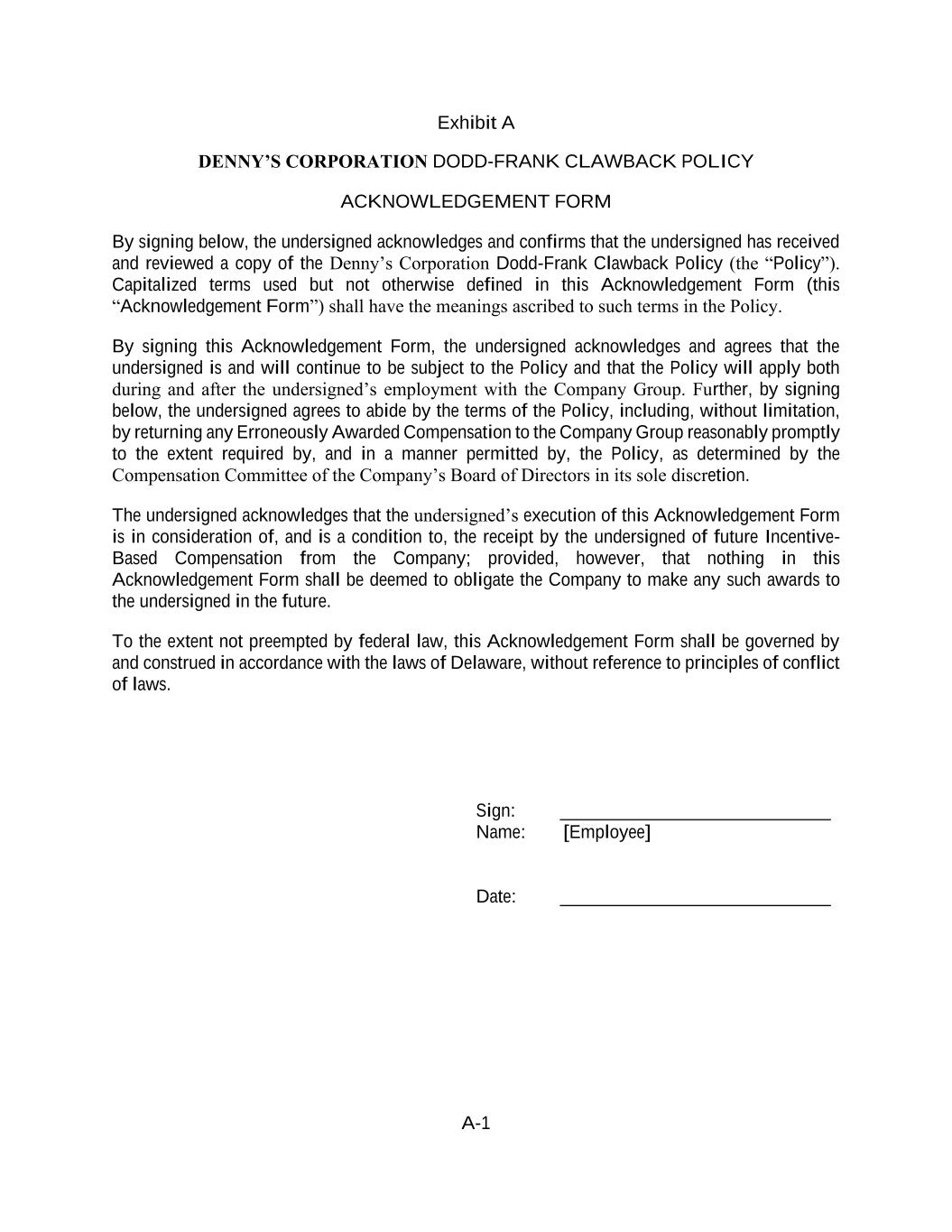 A-1 Exhibit A DENNY’S CORPORATION DODD-FRANK CLAWBACK POLICY ACKNOWLEDGEMENT FORM By signing below, the undersigned acknowledges and confirms that the undersigned has received and reviewed a copy of the Denny’s Corporation Dodd-Frank Clawback Policy (the “Policy”). Capitalized terms used but not otherwise defined in this Acknowledgement Form (this “Acknowledgement Form”) shall have the meanings ascribed to such terms in the Policy. By signing this Acknowledgement Form, the undersigned acknowledges and agrees that the undersigned is and will continue to be subject to the Policy and that the Policy will apply both during and after the undersigned’s employment with the Company Group. Further, by signing below, the undersigned agrees to abide by the terms of the Policy, including, without limitation, by returning any Erroneously Awarded Compensation to the Company Group reasonably promptly to the extent required by, and in a manner permitted by, the Policy, as determined by the Compensation Committee of the Company’s Board of Directors in its sole discretion. The undersigned acknowledges that the undersigned’s execution of this Acknowledgement Form is in consideration of, and is a condition to, the receipt by the undersigned of future Incentive- Based Compensation from the Company; provided, however, that nothing in this Acknowledgement Form shall be deemed to obligate the Company to make any such awards to the undersigned in the future. To the extent not preempted by federal law, this Acknowledgement Form shall be governed by and construed in accordance with the laws of Delaware, without reference to principles of conflict of laws. Sign: _____________________________ Name: [Employee] Date: _____________________________