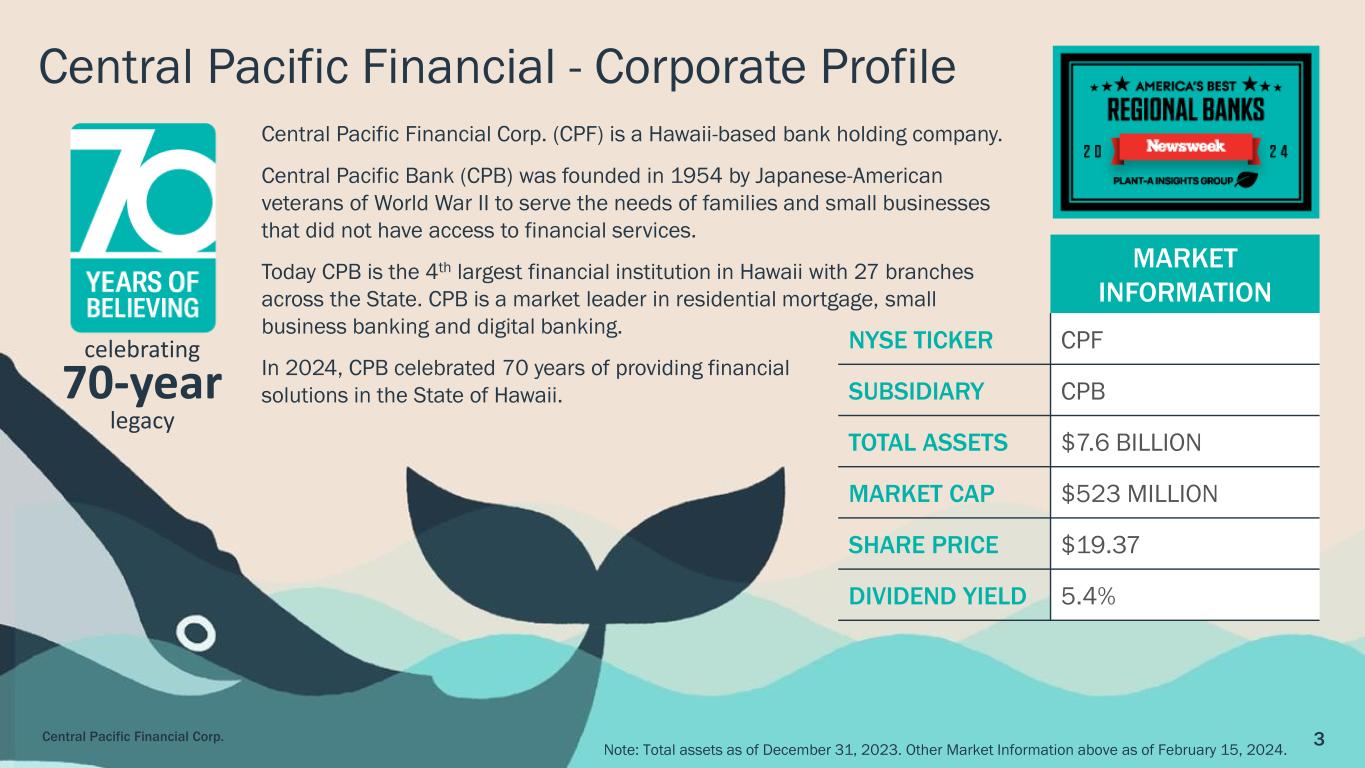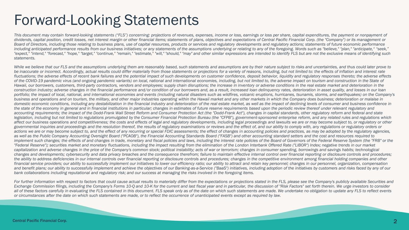 2Central Pacific Financial Corp. Forward-Looking Statements This document may contain forward-looking statements (“FLS”) concerning: projections of revenues, expenses, income or loss, earnings or loss per share, capital expenditures, the payment or nonpayment of dividends, capital position, credit losses, net interest margin or other financial items; statements of plans, objectives and expectations of Central Pacific Financial Corp. (the "Company") or its management or Board of Directors, including those relating to business plans, use of capital resources, products or services and regulatory developments and regulatory actions; statements of future economic performance including anticipated performance results from our business initiatives; or any statements of the assumptions underlying or relating to any of the foregoing. Words such as "believe," "plan," "anticipate,“ “seek,” "expect," "intend," "forecast," "hope," "target," "continue," "remain," "estimate," "will," "should," "may" and other similar expressions are intended to identify FLS but are not the exclusive means of identifying such statements. While we believe that our FLS and the assumptions underlying them are reasonably based, such statements and assumptions are by their nature subject to risks and uncertainties, and thus could later prove to be inaccurate or incorrect. Accordingly, actual results could differ materially from those statements or projections for a variety of reasons, including, but not limited to: the effects of inflation and interest rate fluctuations; the adverse effects of recent bank failures and the potential impact of such developments on customer confidence, deposit behavior, liquidity and regulatory responses thereto; the adverse effects of the COVID-19 pandemic virus (and ongoing pandemic variants) on local, national and international economies, including, but not limited to, the adverse impact on tourism and construction in the State of Hawaii, our borrowers, customers, third-party contractors, vendors and employees; supply chain disruptions; the increase in inventory or adverse conditions in the real estate market and deterioration in the construction industry; adverse changes in the financial performance and/or condition of our borrowers and, as a result, increased loan delinquency rates, deterioration in asset quality, and losses in our loan portfolio; the impact of local, national, and international economies and events (including natural disasters such as wildfires, volcanic eruptions, hurricanes, tsunamis, storms, and earthquakes) on the Company's business and operations and on tourism, the military, and other major industries operating within the Hawaii market and any other markets in which the Company does business; deterioration or malaise in domestic economic conditions, including any destabilization in the financial industry and deterioration of the real estate market, as well as the impact of declining levels of consumer and business confidence in the state of the economy in general and in financial institutions in particular; changes in estimates of future reserve requirements based upon the periodic review thereof under relevant regulatory and accounting requirements; the impact of the Dodd-Frank Wall Street Reform and Consumer Protection Act (the "Dodd-Frank Act"), changes in capital standards, other regulatory reform and federal and state legislation, including but not limited to regulations promulgated by the Consumer Financial Protection Bureau (the "CFPB"), government-sponsored enterprise reform, and any related rules and regulations which affect our business operations and competitiveness; the costs and effects of legal and regulatory developments, including legal proceedings and lawsuits we are or may become subject to, or regulatory or other governmental inquiries and proceedings and the resolution thereof, the results of regulatory examinations or reviews and the effect of, and our ability to comply with, any regulations or regulatory orders or actions we are or may become subject to, and the effect of any recurring or special FDIC assessments; the effect of changes in accounting policies and practices, as may be adopted by the regulatory agencies, as well as the Public Company Accounting Oversight Board ("PCAOB"), the Financial Accounting Standards Board ("FASB") and other accounting standard setters and the cost and resources required to implement such changes; the effects of and changes in trade, monetary and fiscal policies and laws, including the interest rate policies of the Board of Governors of the Federal Reserve System (the "FRB" or the "Federal Reserve"); securities market and monetary fluctuations, including the impact resulting from the elimination of the London Interbank Offered Rate ("LIBOR") Index; negative trends in our market capitalization and adverse changes in the price of the Company's common stock; political instability; acts of war or terrorism; changes in consumer spending, borrowings and savings habits; technological changes and developments; cybersecurity and data privacy breaches and the consequence therefrom; failure to maintain effective internal control over financial reporting or disclosure controls and procedures; the ability to address deficiencies in our internal controls over financial reporting or disclosure controls and procedures; changes in the competitive environment among financial holding companies and other financial service providers; our ability to successfully implement our initiatives to lower our efficiency ratio; our ability to attract and retain key personnel; changes in our personnel, organization, compensation and benefit plans; our ability to successfully implement and achieve the objectives of our Banking-as-a-Service ("BaaS") initiatives, including adoption of the initiatives by customers and risks faced by any of our bank collaborations including reputational and regulatory risk; and our success at managing t
