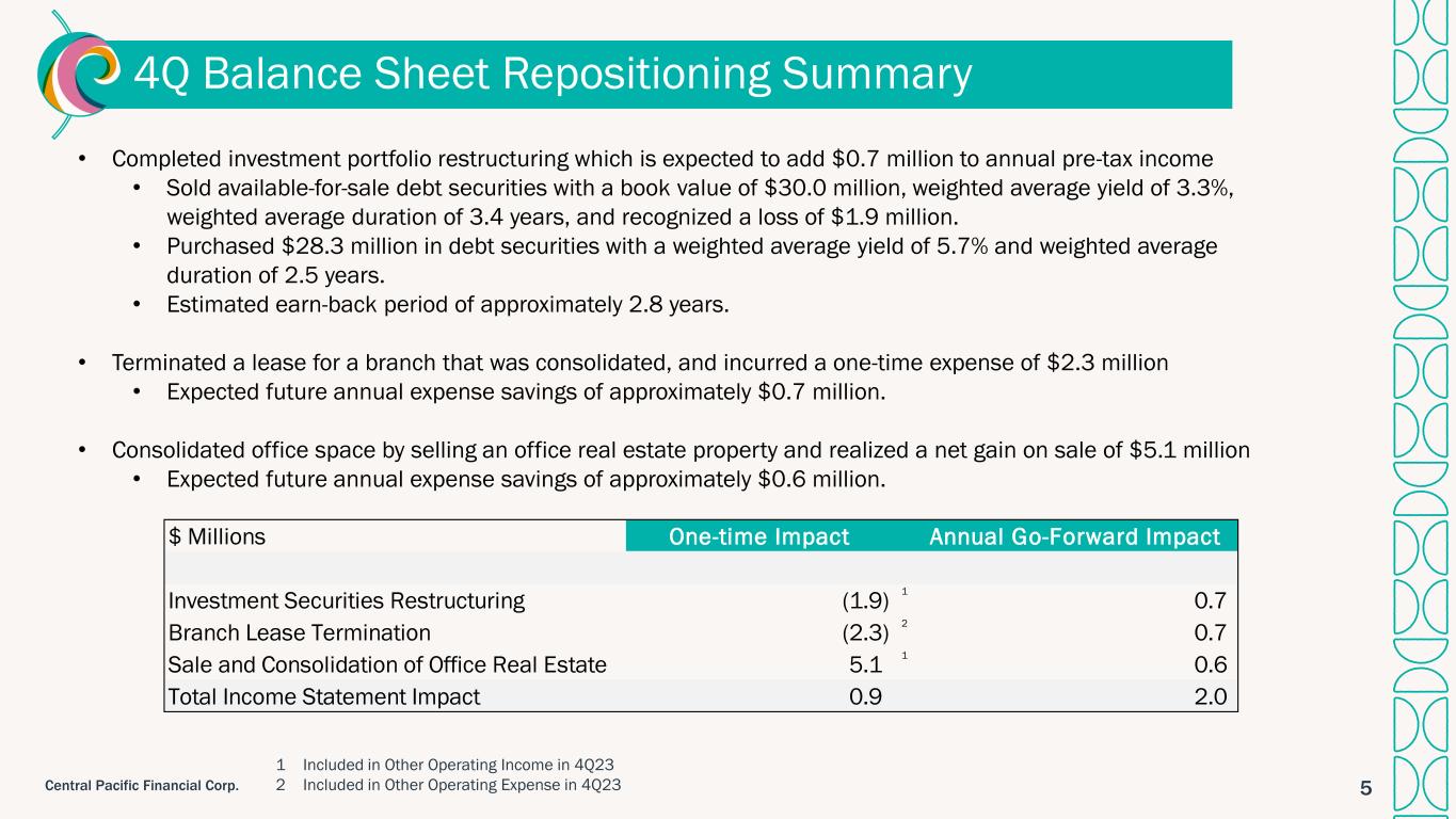 4Central Pacific Financial Corp. 4th Quarter 2023 Financial Highlights • Growth in net income and PPNR QoQ • Solid liquidity position with sizable cash position, and modest loan and deposit portfolio decline • Strong capital and asset quality • Completed balance sheet repositioning to consolidate properties and restructure a portion of the investment securities portfolio • Quarterly cash dividend maintained at $0.26 4Q23 3Q23 2023Y NET INCOME / DILUTED EPS $14.9MM / $0.55 $13.1MM / $0.49 $58.7MM / $2.17 PPNR $23.8MM $22.4MM $92.5MM RETURN ON ASSETS (ROA) 0.79% 0.70% 0.78% RETURN ON EQUITY (ROE) 12.55% 10.95% 12.38% TOTAL LOAN GROWTH/DECLINE -$69.7MM (-1.3%) -$12.0MM (-0.2%) -$116.5MM (-2.1%) TOTAL DEPOSIT GROWTH/DECLINE -$27.2MM (-0.4%) +$69.0MM (+1.0%) +$111.4MM (+1.7%) NET INTEREST MARGIN (NIM) 2.84% 2.88% 2.94%