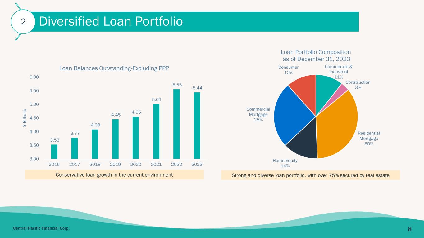 7Central Pacific Financial Corp. Tourism Visitor arrivals compared to pre-pandemic 90% 1 Employment Unemployment Rate December 2023 2.9% 1 FACTORS FOR A FAVORABLE HAWAII OUTLOOK • Maui tourism recovery from Maui wildfires in August 2023 faster than anticipated with visitor arrivals at 75% of the previous year in December 2023 • Japanese visitor return increasing, currently at ~49% of pre-pandemic levels • Low unemployment and strong real estate market • Substantial Federal government contracts and military investments • Increase in public and private investments to address housing shortage 1 Source: Hawaii Department of Business, Economic Development & Tourism. Tourism represents total visitor arrivals in December 2023 compared to December 2019. 2 Source: Honolulu Board of Realtors. Resilient Hawaii Economy Housing Oahu Median Single- Family Home Price January 2024 $1.0MM 2 1 Visitors from Japan to Hawaii1