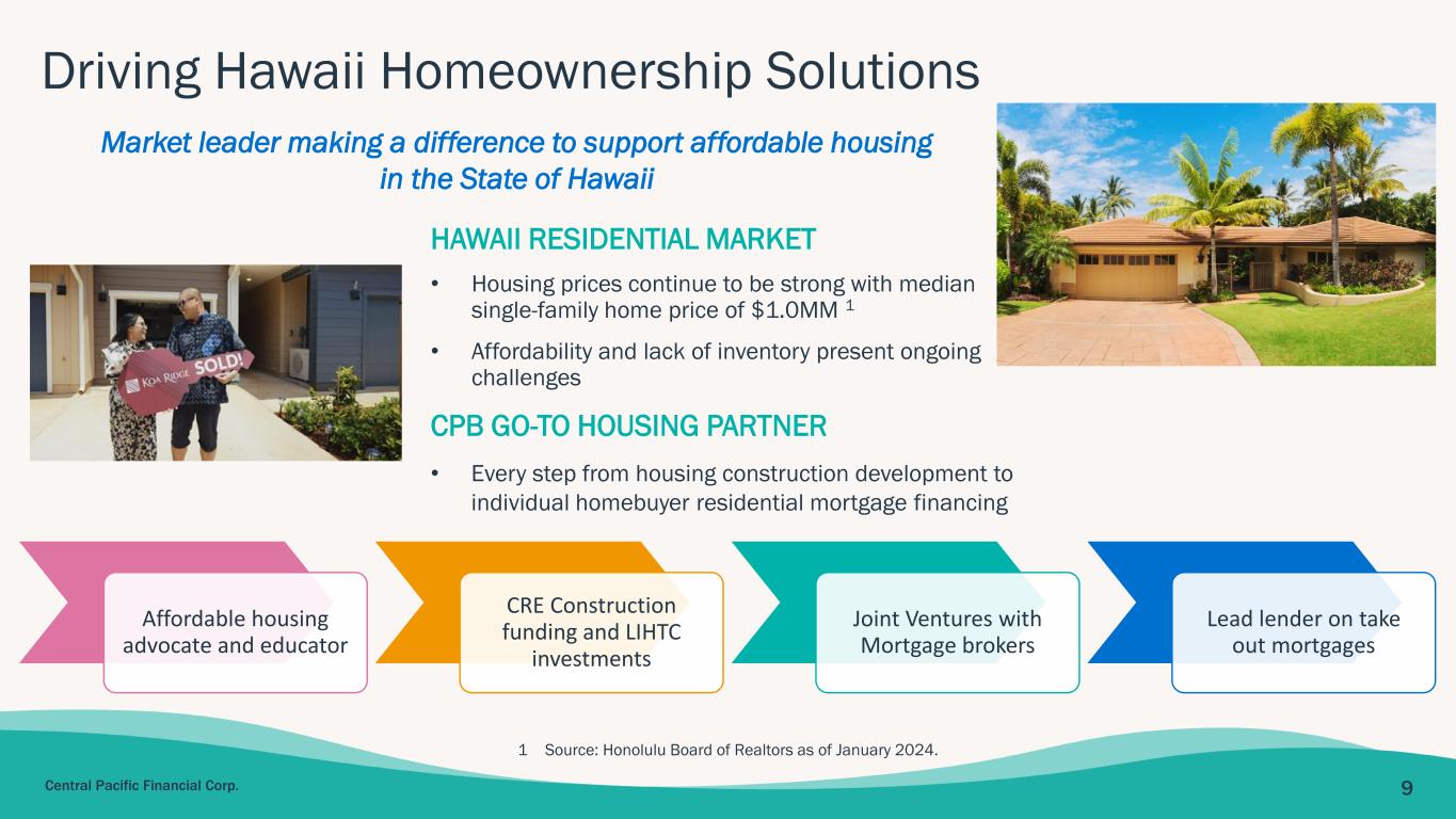 8Central Pacific Financial Corp. Conservative loan growth in the current environment Strong and diverse loan portfolio, with over 75% secured by real estate Diversified Loan Portfolio2 3.53 3.77 4.08 4.45 4.55 5.01 5.55 5.44 3.00 3.50 4.00 4.50 5.00 5.50 6.00 2016 2017 2018 2019 2020 2021 2022 2023 $ B il li o n s Loan Balances Outstanding-Excluding PPP Commercial & Industrial 11% Construction 3% Residential Mortgage 35% Home Equity 14% Commercial Mortgage 25% Consumer 12% Loan Portfolio Composition as of December 31, 2023