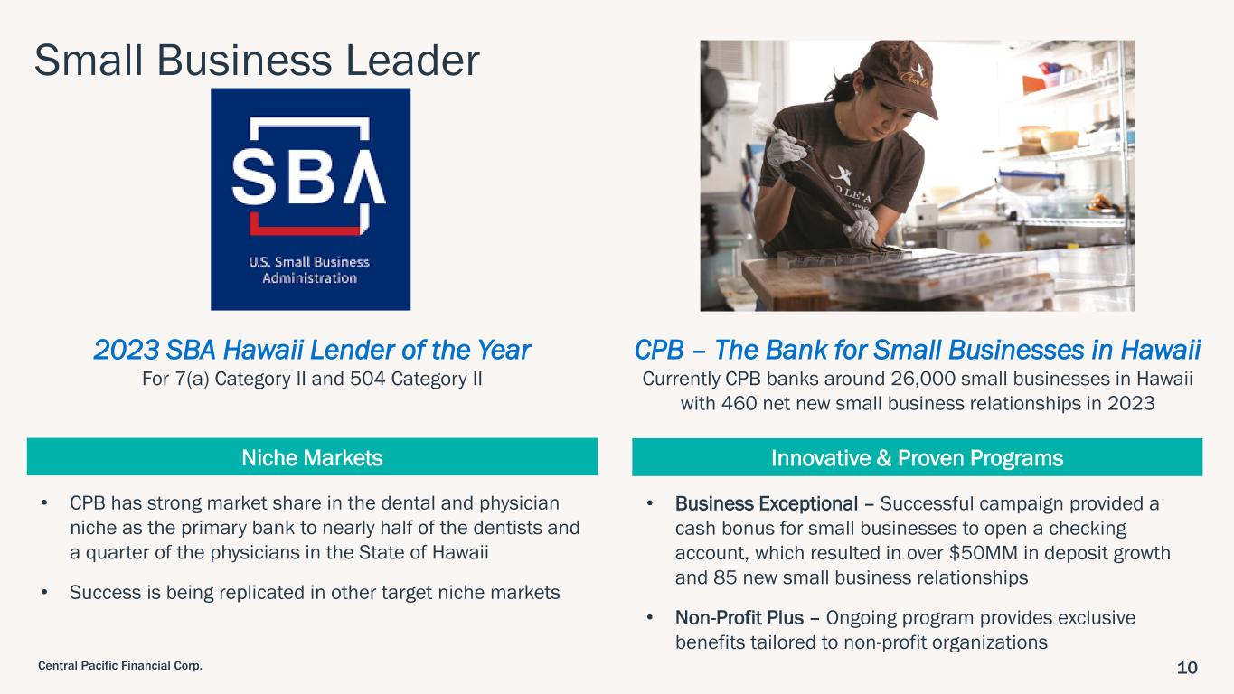 9Central Pacific Financial Corp. HAWAII RESIDENTIAL MARKET • Housing prices continue to be strong with median single-family home price of $1.0MM 1 • Affordability and lack of inventory present ongoing challenges CPB GO-TO HOUSING PARTNER • Every step from housing construction development to individual homebuyer residential mortgage financing Market leader making a difference to support affordable housing in the State of Hawaii Affordable housing advocate and educator CRE Construction funding and LIHTC investments Joint Ventures with Mortgage brokers Lead lender on take out mortgages Driving Hawaii Homeownership Solutions 1 Source: Honolulu Board of Realtors as of January 2024.