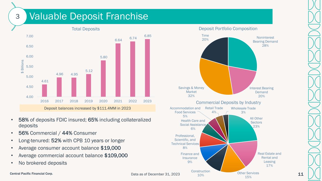 10Central Pacific Financial Corp. Innovative & Proven Programs • Business Exceptional – Successful campaign provided a cash bonus for small businesses to open a checking account, which resulted in over $50MM in deposit growth and 85 new small business relationships • Non-Profit Plus – Ongoing program provides exclusive benefits tailored to non-profit organizations 2023 SBA Hawaii Lender of the Year For 7(a) Category II and 504 Category II Niche Markets • CPB has strong market share in the dental and physician niche as the primary bank to nearly half of the dentists and a quarter of the physicians in the State of Hawaii • Success is being replicated in other target niche markets CPB – The Bank for Small Businesses in Hawaii Currently CPB banks around 26,000 small businesses in Hawaii with 460 net new small business relationships in 2023 Small Business Leader