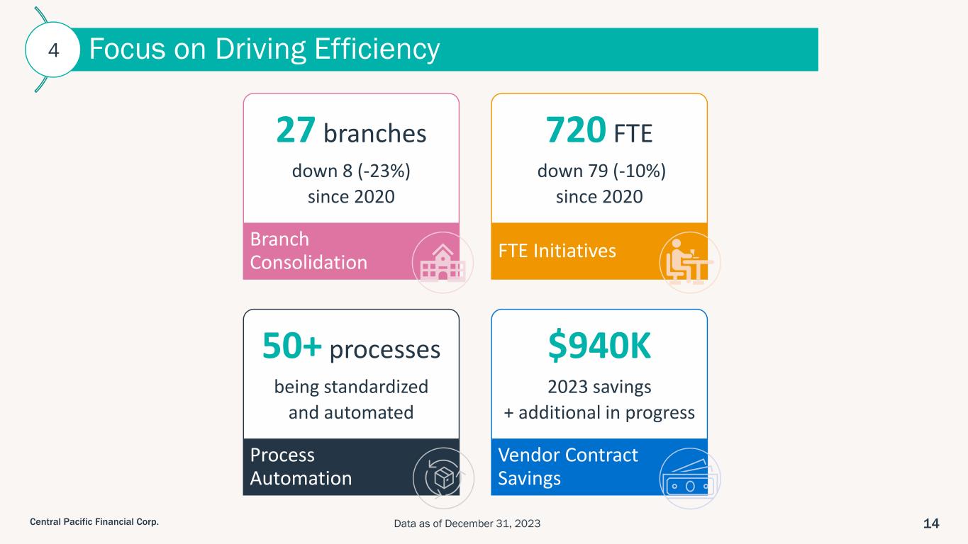 13Central Pacific Financial Corp. Leadership Connections Strategic Alliances Best Service Level Captive Insurance Deposits CPB Foundation with Mana Up Hawaii sponsored the first Aloha Market at Tokyo Haneda Airport in November 2023 showcasing 40 Hawai’i brands CPB and Tokyo Star Bank alliance announced in August 2023 for business and investment opportunities in Japan and Hawaii Favorable Hawaii State laws for Japanese captive insurance CPB is a member of the Hawaii Captive Insurance Council Japan Competitive Advantage Convenient, customized services and online banking experience tailored to Japanese customers