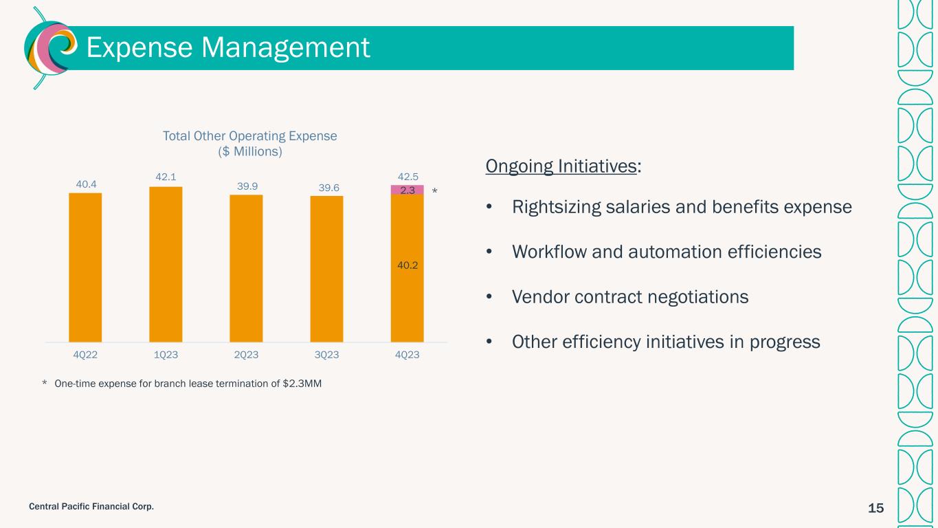 14Central Pacific Financial Corp. Focus on Driving Efficiency4 27 branches down 8 (-23%) since 2020 Branch Consolidation 720 FTE down 79 (-10%) since 2020 FTE Initiatives 50+ processes being standardized and automated Process Automation $940K 2023 savings + additional in progress Vendor Contract Savings Data as of December 31, 2023