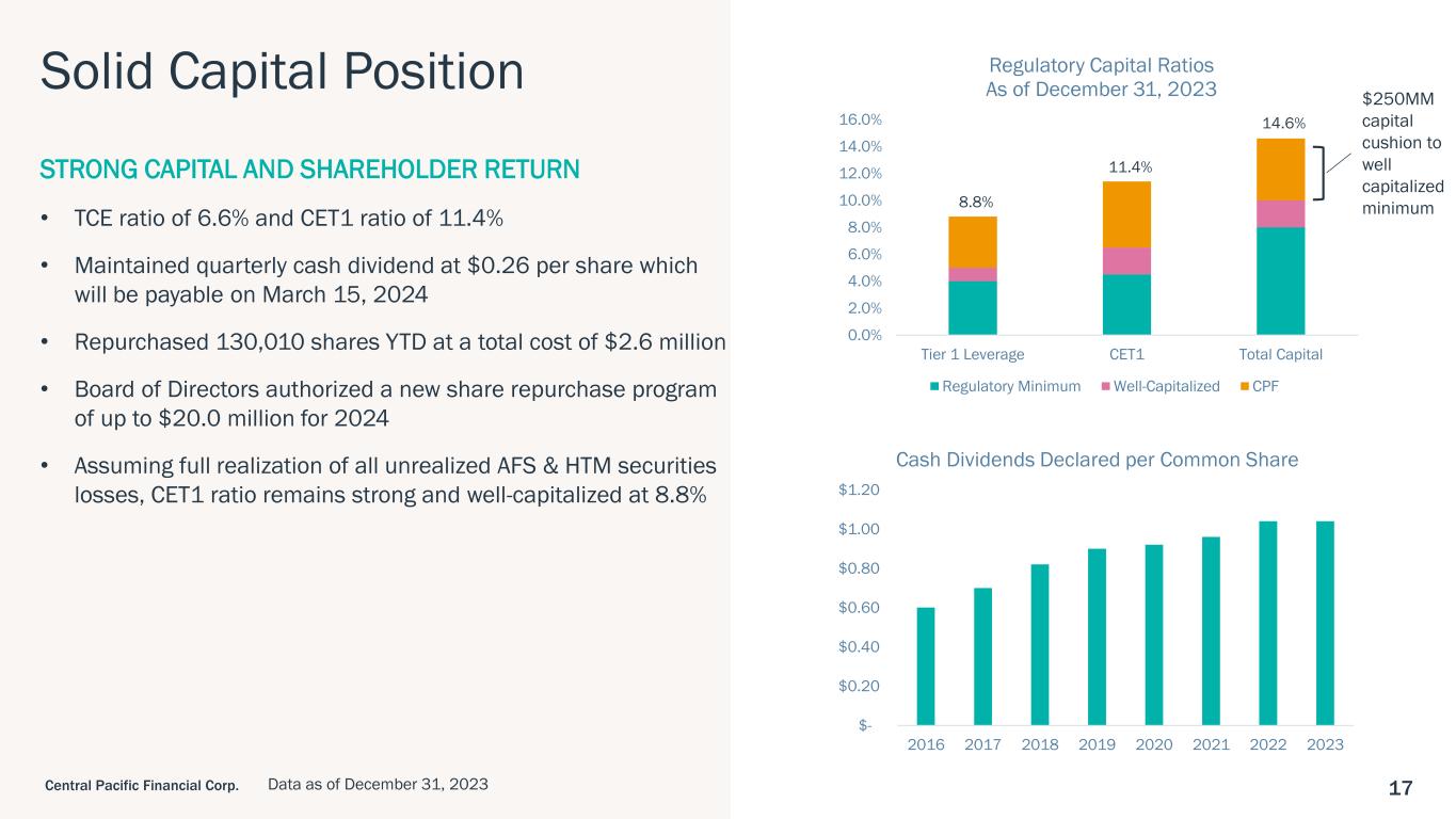 16Central Pacific Financial Corp. 0.09% 0.10% 0.09% 0.12% 0.13% 0.20% 0.11% 4Q22 1Q23 2Q23 3Q23 4Q23 NPAs/Total Loans 0.06% 0.04% 0.04% 0.05% 0.07% 0.06% 0.12% 0.20% 0.23% 0.34%0.12% 0.16% 0.24% 0.28% 0.41% 4Q22 1Q23 2Q23 3Q23 4Q23 Annualized NCO/Avg Loans All Other NCO/Avg Loans Mainland Consumer NCO/Avg Loans Solid Credit & Capital Profile5 * NPA increase relates to 2 Hawaii construction loans to a single borrower that subsequently paid off in full in mid-July 2023. 2Q23 NPAs/Total Loans ratio is 0.11% excluding the 2 Hawaii construction loans mentioned above. * Strong credit risk management continues to drive low levels of problem assets 0.03% 0.03% 0.06% 0.05% 0.02% 4Q22 1Q23 2Q23 3Q23 4Q23 Delinquencies 90+Days/Total Loans 1.39% 1.28% 1.34% 1.09% 0.92% 4Q22 1Q23 2Q23 3Q23 4Q23 Criticized/Total Loans