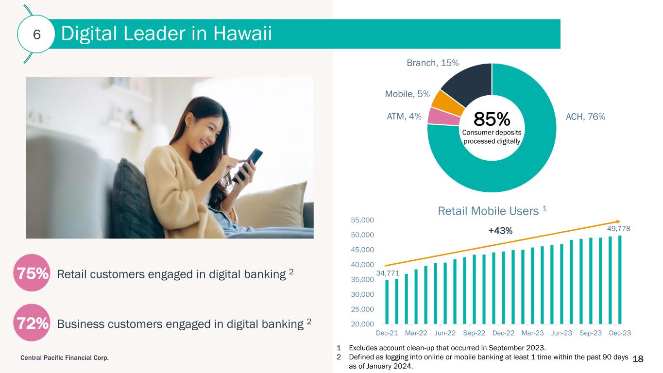 181Central Pacific Financial Corp. ACH, 76%ATM, 4% Mobile, 5% Branch, 15% 85% Consumer deposits processed digitally 34,771 49,778 20,000 25,000 30,000 35,000 40,000 45,000 50,000 55,000 Dec-21 Mar-22 Jun-22 Sep-22 Dec-22 Mar-23 Jun-23 Sep-23 Dec-23 Retail Mobile Users 1 Digital Leader in Hawaii6 1 Excludes account clean-up that occurred in September 2023. 2 Defined as logging into online or mobile banking at least 1 time within the past 90 days as of January 2024. Retail customers engaged in digital banking 2 +43% 75% Business customers engaged in digital banking 272%