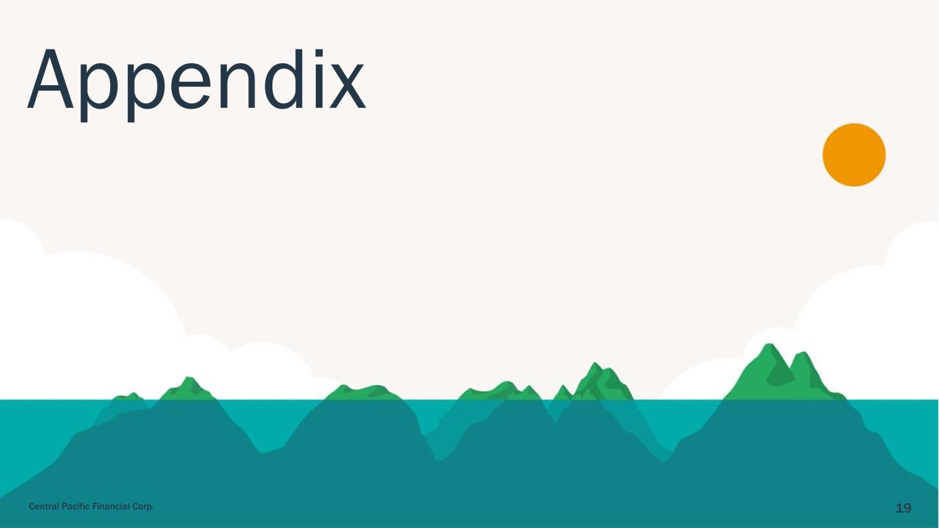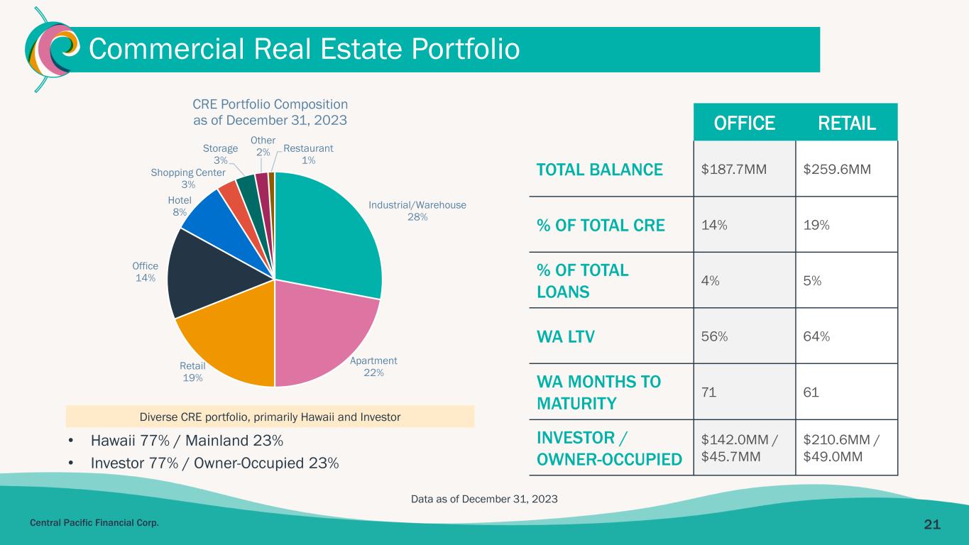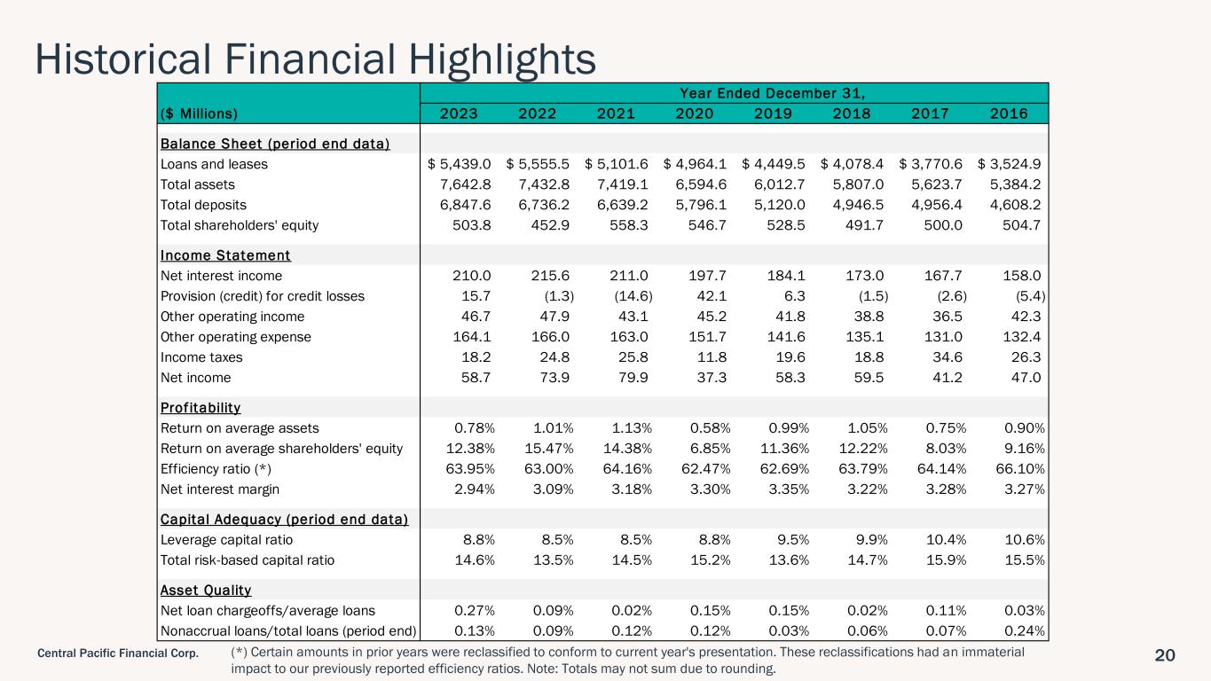 20Central Pacific Financial Corp. (*) Certain amounts in prior years were reclassified to conform to current year's presentation. These reclassifications had an immaterial impact to our previously reported efficiency ratios. Note: Totals may not sum due to rounding. Historical Financial Highlights ($ Millions) 2023 2022 2021 2020 2019 2018 2017 2016 Balance Sheet (period end data) Loans and leases 5,439.0$ 5,555.5$ 5,101.6$ 4,964.1$ 4,449.5$ 4,078.4$ 3,770.6$ 3,524.9$ Total assets 7,642.8 7,432.8 7,419.1 6,594.6 6,012.7 5,807.0 5,623.7 5,384.2 Total deposits 6,847.6 6,736.2 6,639.2 5,796.1 5,120.0 4,946.5 4,956.4 4,608.2 Total shareholders' equity 503.8 452.9 558.3 546.7 528.5 491.7 500.0 504.7 Income Statement Net interest income 210.0 215.6 211.0 197.7 184.1 173.0 167.7 158.0 Provision (credit) for credit losses 15.7 (1.3) (14.6) 42.1 6.3 (1.5) (2.6) (5.4) Other operating income 46.7 47.9 43.1 45.2 41.8 38.8 36.5 42.3 Other operating expense 164.1 166.0 163.0 151.7 141.6 135.1 131.0 132.4 Income taxes 18.2 24.8 25.8 11.8 19.6 18.8 34.6 26.3 Net income 58.7 73.9 79.9 37.3 58.3 59.5 41.2 47.0 Prof itability Return on average assets 0.78% 1.01% 1.13% 0.58% 0.99% 1.05% 0.75% 0.90% Return on average shareholders' equity 12.38% 15.47% 14.38% 6.85% 11.36% 12.22% 8.03% 9.16% Efficiency ratio (*) 63.95% 63.00% 64.16% 62.47% 62.69% 63.79% 64.14% 66.10% Net interest margin 2.94% 3.09% 3.18% 3.30% 3.35% 3.22% 3.28% 3.27% Capital Adequacy (period end data) Leverage capital ratio 8.8% 8.5% 8.5% 8.8% 9.5% 9.9% 10.4% 10.6% Total risk-based capital ratio 14.6% 13.5% 14.5% 15.2% 13.6% 14.7% 15.9% 15.5% Asset Quality Net loan chargeoffs/average loans 0.27% 0.09% 0.02% 0.15% 0.15% 0.02% 0.11% 0.03% Nonaccrual loans/total loans (period end) 0.13% 0.09% 0.12% 0.12% 0.03% 0.06% 0.07% 0.24% Year Ended December 31,