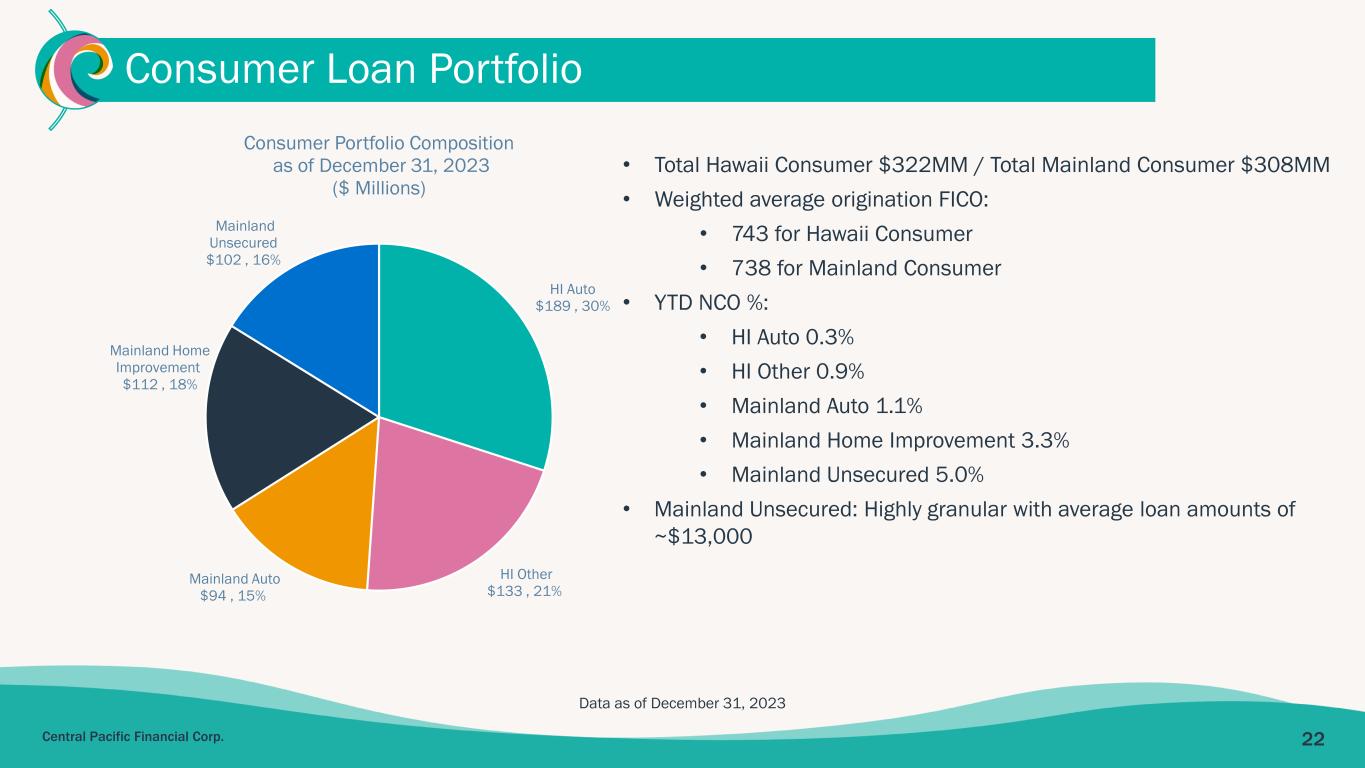 22Central Pacific Financial Corp. • Total Hawaii Consumer $322MM / Total Mainland Consumer $308MM • Weighted average origination FICO: • 743 for Hawaii Consumer • 738 for Mainland Consumer • YTD NCO %: • HI Auto 0.3% • HI Other 0.9% • Mainland Auto 1.1% • Mainland Home Improvement 3.3% • Mainland Unsecured 5.0% • Mainland Unsecured: Highly granular with average loan amounts of ~$13,000 Consumer Loan Portfolio HI Auto $189 , 30% HI Other $133 , 21% Mainland Auto $94 , 15% Mainland Home Improvement $112 , 18% Mainland Unsecured $102 , 16% Consumer Portfolio Composition as of December 31, 2023 ($ Millions) Data as of December 31, 2023