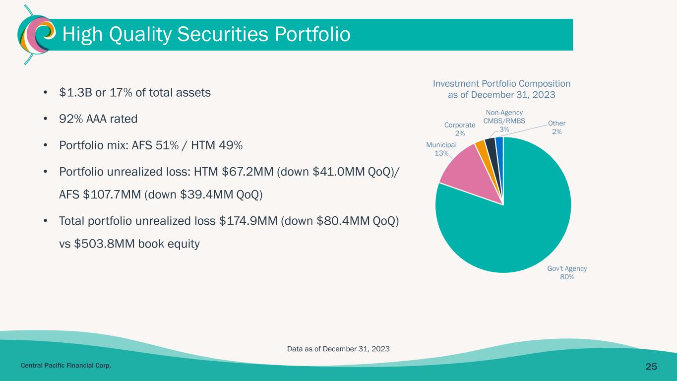 24Central Pacific Financial Corp. • $5.0MM provision for credit loss on loans in 4Q23 driven by net charge-offs, offset by a credit of $0.3MM to the reserve for unfunded commitments, for a total provision for credit loss of $4.7MM • ACL coverage ratio increased to 1.18% for 4Q23 Note: Totals may not sum due to rounding. Allowance for Credit Losses $ Millions 4Q22 1Q23 2Q23 3Q23 4Q23 Beginning Balance 64.4 63.7 63.1 63.8 64.5 Less: Net Charge-offs 1.7 2.3 3.4 3.9 5.5 Plus: Provision for Credit Losses 1.0 1.6 4.1 4.5 5.0 Ending Balance 63.7 63.1 63.8 64.5 64.0 Coverage Ratio (ACL to Total Loans) 1.15% 1.14% 1.16% 1.17% 1.18%