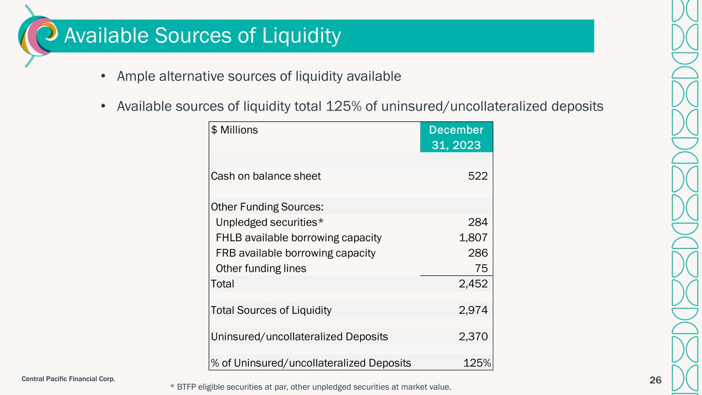 25Central Pacific Financial Corp. High Quality Securities Portfolio • $1.3B or 17% of total assets • 92% AAA rated • Portfolio mix: AFS 51% / HTM 49% • Portfolio unrealized loss: HTM $67.2MM (down $41.0MM QoQ)/ AFS $107.7MM (down $39.4MM QoQ) • Total portfolio unrealized loss $174.9MM (down $80.4MM QoQ) vs $503.8MM book equity Gov't Agency 80% Municipal 13% Corporate 2% Non-Agency CMBS/RMBS 3% Other 2% Investment Portfolio Composition as of December 31, 2023 Data as of December 31, 2023