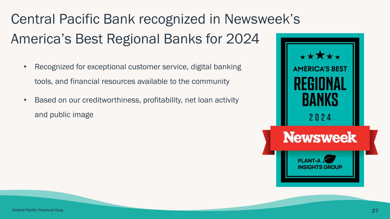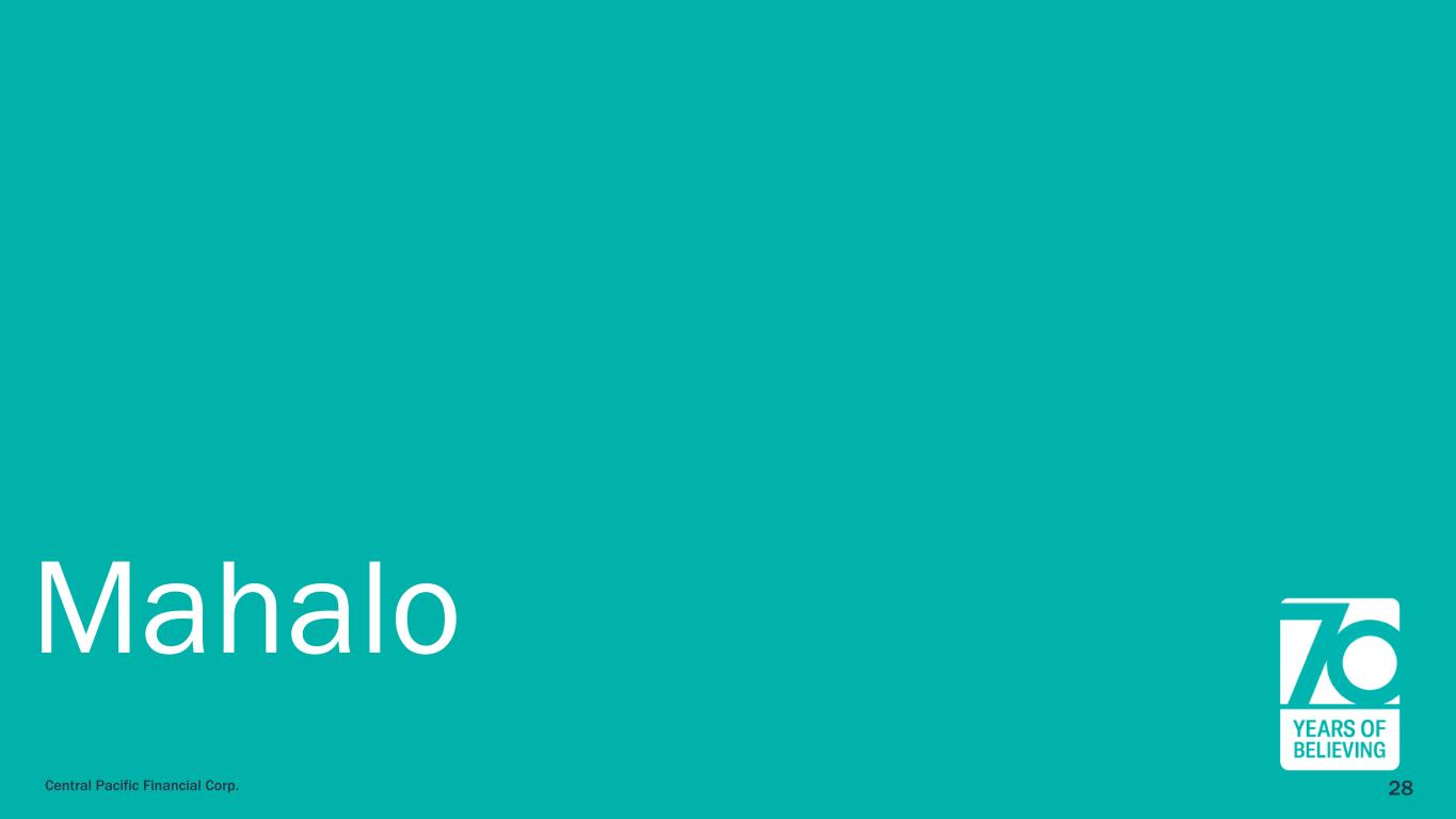 27Central Pacific Financial Corp. Central Pacific Bank recognized in Newsweek’s America’s Best Regional Banks for 2024 • Recognized for exceptional customer service, digital banking tools, and financial resources available to the community • Based on our creditworthiness, profitability, net loan activity and public image