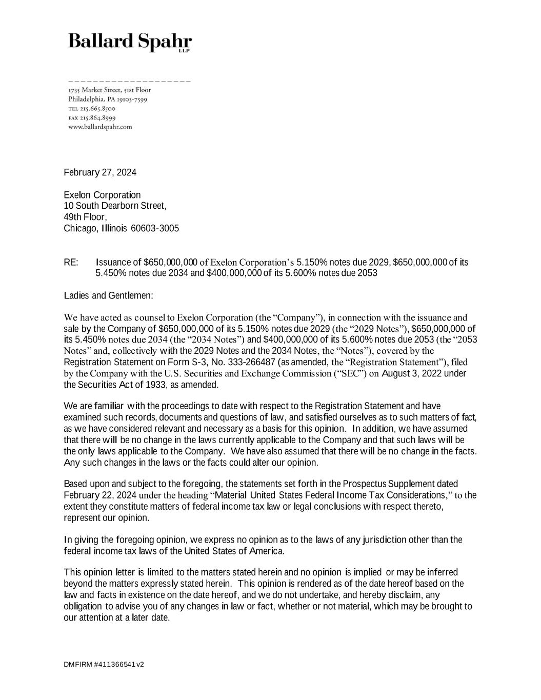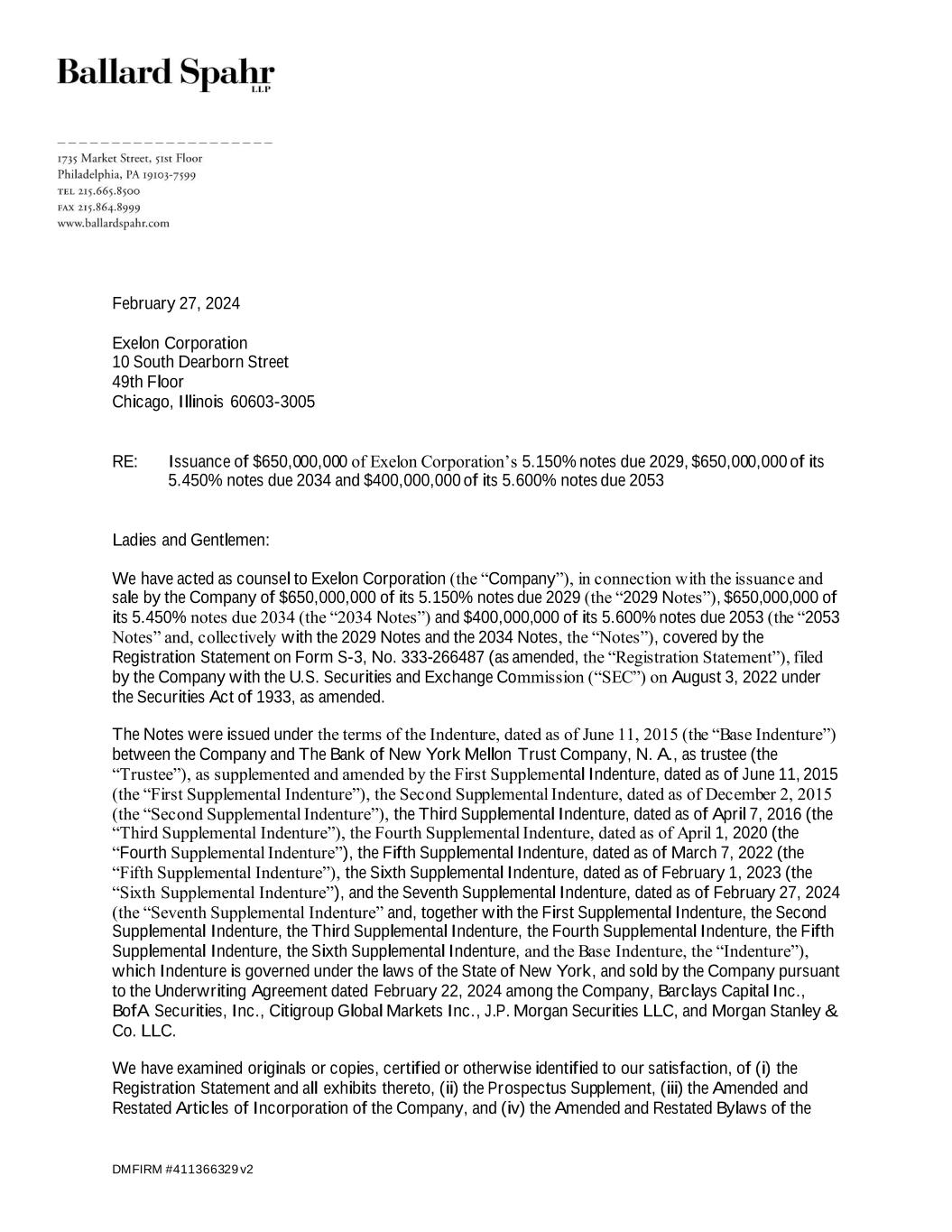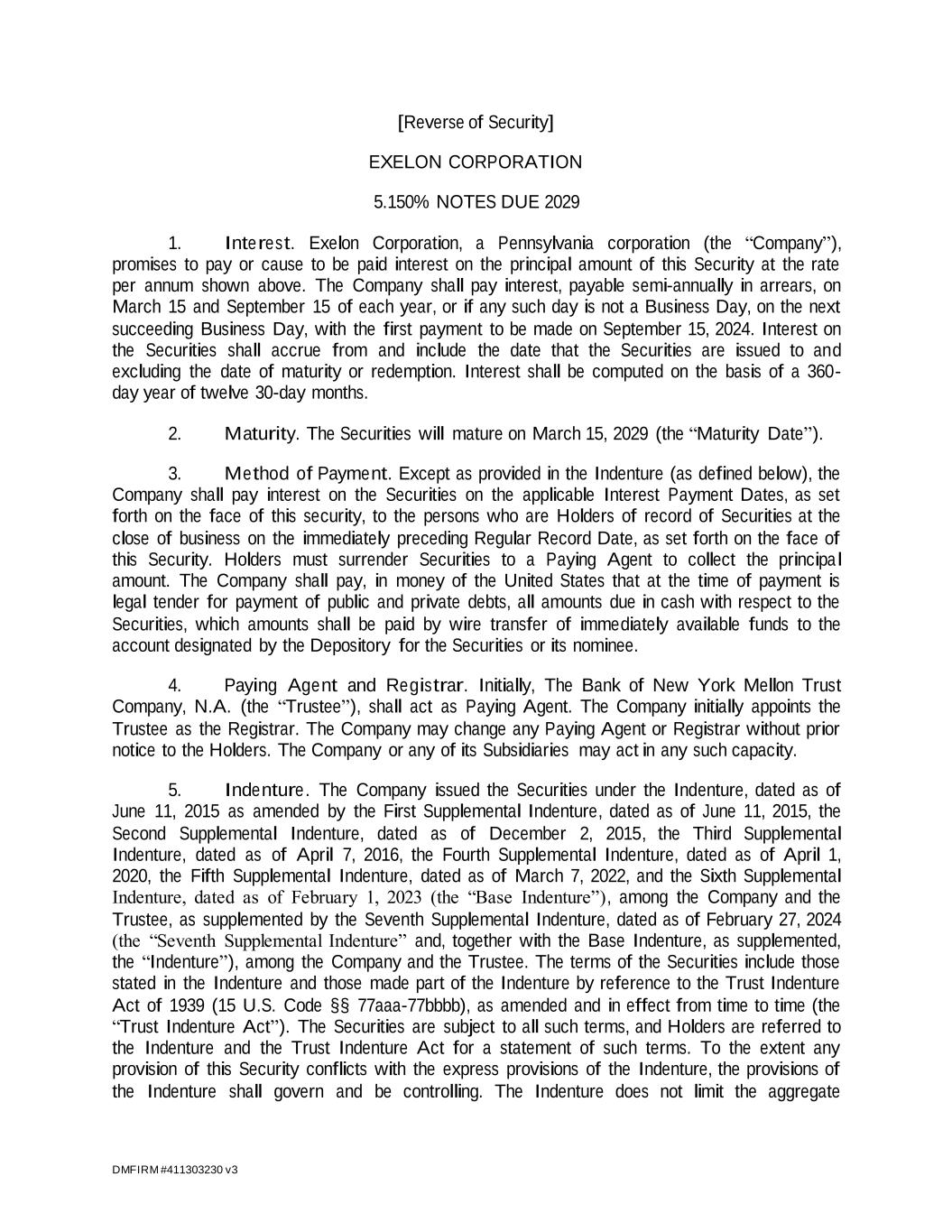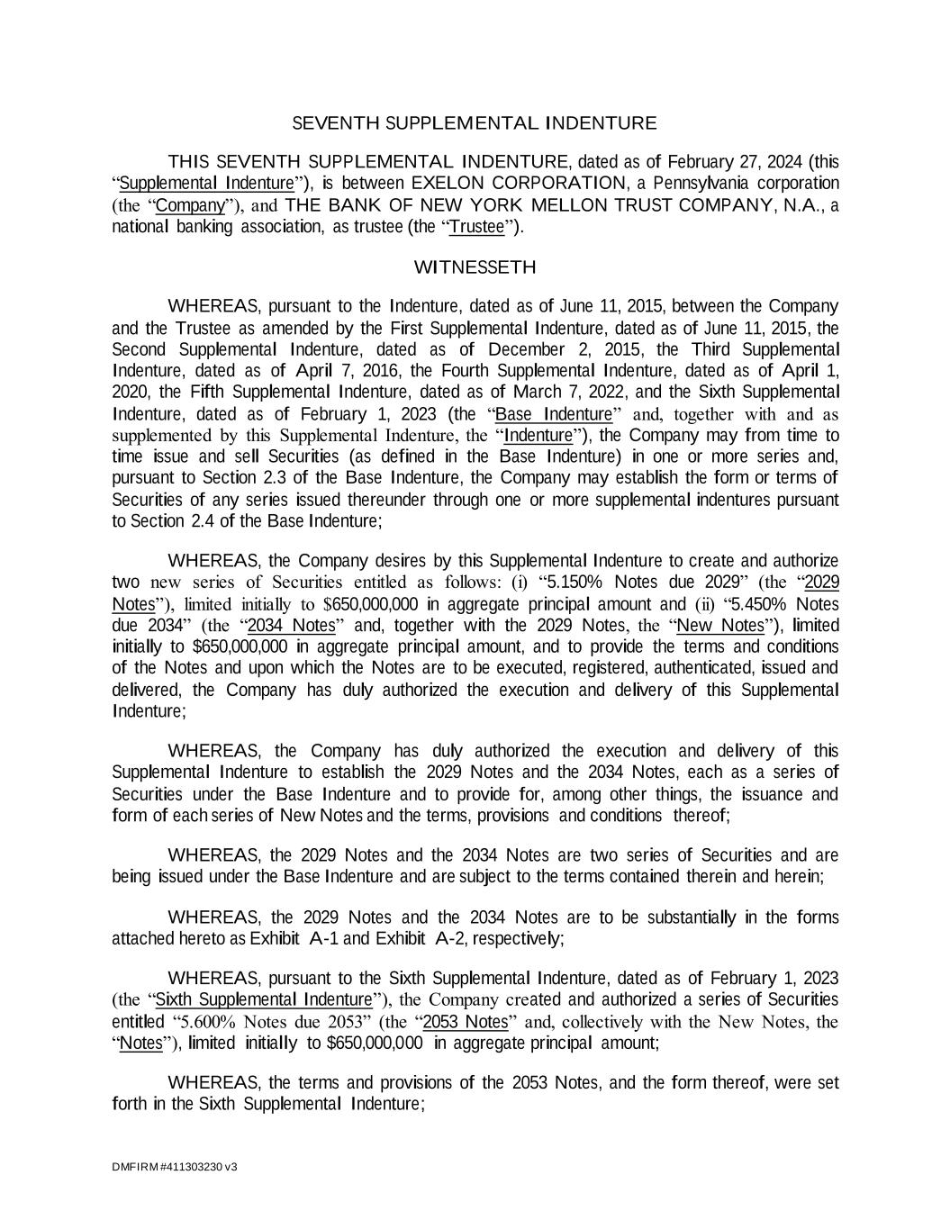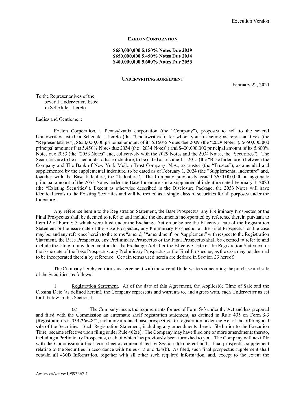 Execution Version AmericasActive:19593367.4 EXELON CORPORATION $650,000,000 5.150% Notes Due 2029 $650,000,000 5.450% Notes Due 2034 $400,000,000 5.600% Notes Due 2053 UNDERWRITING AGREEMENT February 22, 2024 To the Representatives of the several Underwriters listed in Schedule 1 hereto Ladies and Gentlemen: Exelon Corporation, a Pennsylvania corporation (the “Company”), proposes to sell to the several Underwriters listed in Schedule 1 hereto (the “Underwriters”), for whom you are acting as representatives (the “Representatives”), $650,000,000 principal amount of its 5.150% Notes due 2029 (the “2029 Notes”), $650,000,000 principal amount of its 5.450% Notes due 2034 (the “2034 Notes”) and $400,000,000 principal amount of its 5.600% Notes due 2053 (the “2053 Notes” and, collectively with the 2029 Notes and the 2034 Notes, the “Securities”). The Securities are to be issued under a base indenture, to be dated as of June 11, 2015 (the “Base Indenture”) between the Company and The Bank of New York Mellon Trust Company, N.A., as trustee (the “Trustee”), as amended and supplemented by the supplemental indenture, to be dated as of February 1, 2024 (the “Supplemental Indenture” and, together with the Base Indenture, the “Indenture”). The Company previously issued $650,000,000 in aggregate principal amount of the 2053 Notes under the Base Indenture and a supplemental indenture dated February 1, 2023 (the “Existing Securities”). Except as otherwise described in the Disclosure Package, the 2053 Notes will have identical terms to the Existing Securities and will be treated as a single class of securities for all purposes under the Indenture. Any reference herein to the Registration Statement, the Base Prospectus, any Preliminary Prospectus or the Final Prospectus shall be deemed to refer to and include the documents incorporated by reference therein pursuant to Item 12 of Form S-3 which were filed under the Exchange Act on or before the Effective Date of the Registration Statement or the issue date of the Base Prospectus, any Preliminary Prospectus or the Final Prospectus, as the case may be; and any reference herein to the terms “amend,” “amendment” or “supplement” with respect to the Registration Statement, the Base Prospectus, any Preliminary Prospectus or the Final Prospectus shall be deemed to refer to and include the filing of any document under the Exchange Act after the Effective Date of the Registration Statement or the issue date of the Base Prospectus, any Preliminary Prospectus or the Final Prospectus, as the case may be, deemed to be incorporated therein by reference. Certain terms used herein are defined in Section 23 hereof. The Company hereby confirms its agreement with the several Underwriters concerning the purchase and sale of the Securities, as follows: 1. Registration Statement. As of the date of this Agreement, the Applicable Time of Sale and the Closing Date (as defined herein), the Company represents and warrants to, and agrees with, each Underwriter as set forth below in this Section 1. (a) The Company meets the requirements for use of Form S-3 under the Act and has prepared and filed with the Commission an automatic shelf registration statement, as defined in Rule 405 on Form S-3 (Registration No. 333-266487), including a related base prospectus, for registration under the Act of the offering and sale of the Securities. Such Registration Statement, including any amendments thereto filed prior to the Execution Time, became effective upon filing under Rule 462(e). The Company may have filed one or more amendments thereto, including a Preliminary Prospectus, each of which has previously been furnished to you. The Company will next file with the Commission a final term sheet as contemplated by Section 4(b) hereof and a final prospectus supplement relating to the Securities in accordance with Rules 415 and 424(b). As filed, such final prospectus supplement shall contain all 430B Information, together with all other such required information, and, except to the extent the