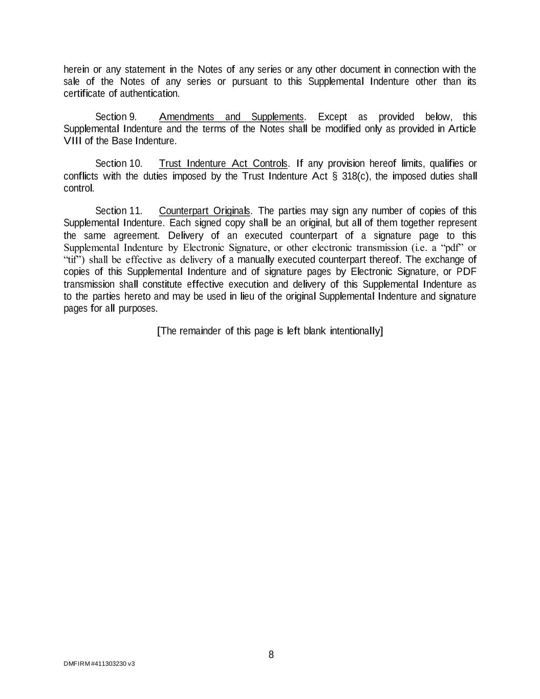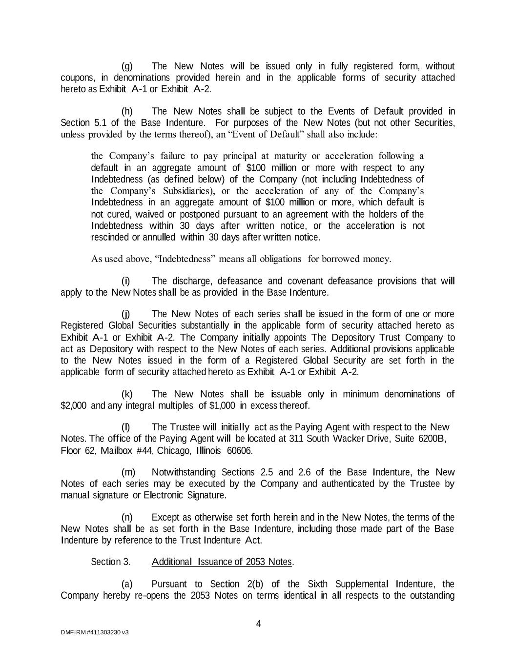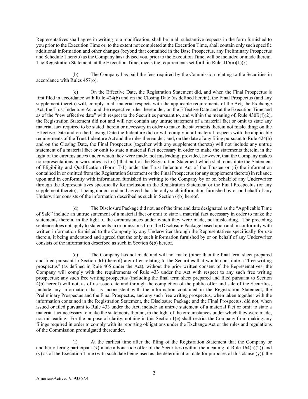 2 AmericasActive:19593367.4 Representatives shall agree in writing to a modification, shall be in all substantive respects in the form furnished to you prior to the Execution Time or, to the extent not completed at the Execution Time, shall contain only such specific additional information and other changes (beyond that contained in the Base Prospectus, any Preliminary Prospectus and Schedule 1 hereto) as the Company has advised you, prior to the Execution Time, will be included or made therein. The Registration Statement, at the Execution Time, meets the requirements set forth in Rule 415(a)(1)(x). (b) The Company has paid the fees required by the Commission relating to the Securities in accordance with Rules 457(o). (c) On the Effective Date, the Registration Statement did, and when the Final Prospectus is first filed in accordance with Rule 424(b) and on the Closing Date (as defined herein), the Final Prospectus (and any supplement thereto) will, comply in all material respects with the applicable requirements of the Act, the Exchange Act, the Trust Indenture Act and the respective rules thereunder; on the Effective Date and at the Execution Time and as of the “new effective date” with respect to the Securities pursuant to, and within the meaning of, Rule 430B(f)(2), the Registration Statement did not and will not contain any untrue statement of a material fact or omit to state any material fact required to be stated therein or necessary in order to make the statements therein not misleading; on the Effective Date and on the Closing Date the Indenture did or will comply in all material respects with the applicable requirements of the Trust Indenture Act and the rules thereunder; and, on the date of any filing pursuant to Rule 424(b) and on the Closing Date, the Final Prospectus (together with any supplement thereto) will not include any untrue statement of a material fact or omit to state a material fact necessary in order to make the statements therein, in the light of the circumstances under which they were made, not misleading; provided, however, that the Company makes no representations or warranties as to (i) that part of the Registration Statement which shall constitute the Statement of Eligibility and Qualification (Form T-1) under the Trust Indenture Act of the Trustee or (ii) the information contained in or omitted from the Registration Statement or the Final Prospectus (or any supplement thereto) in reliance upon and in conformity with information furnished in writing to the Company by or on behalf of any Underwriter through the Representatives specifically for inclusion in the Registration Statement or the Final Prospectus (or any supplement thereto), it being understood and agreed that the only such information furnished by or on behalf of any Underwriter consists of the information described as such in Section 6(b) hereof. (d) The Disclosure Package did not, as of the time and date designated as the “Applicable Time of Sale” include an untrue statement of a material fact or omit to state a material fact necessary in order to make the statements therein, in the light of the circumstances under which they were made, not misleading. The preceding sentence does not apply to statements in or omissions from the Disclosure Package based upon and in conformity with written information furnished to the Company by any Underwriter through the Representatives specifically for use therein, it being understood and agreed that the only such information furnished by or on behalf of any Underwriter consists of the information described as such in Section 6(b) hereof. (e) The Company has not made and will not make (other than the final term sheet prepared and filed pursuant to Section 4(b) hereof) any offer relating to the Securities that would constitute a “free writing prospectus” (as defined in Rule 405 under the Act), without the prior written consent of the Representatives; the Company will comply with the requirements of Rule 433 under the Act with respect to any such free writing prospectus; any such free writing prospectus (including the final term sheet prepared and filed pursuant to Section 4(b) hereof) will not, as of its issue date and through the completion of the public offer and sale of the Securities, include any information that is inconsistent with the information contained in the Registration Statement, the Preliminary Prospectus and the Final Prospectus, and any such free writing prospectus, when taken together with the information contained in the Registration Statement, the Disclosure Package and the Final Prospectus, did not, when issued or filed pursuant to Rule 433 under the Act, include an untrue statement of a material fact or omit to state a material fact necessary to make the statements therein, in the light of the circumstances under which they were made, not misleading. For the purpose of clarity, nothing in this Section 1(e) shall restrict the Company from making any filings required in order to comply with its reporting obligations under the Exchange Act or the rules and regulations of the Commission promulgated thereunder. (f) At the earliest time after the filing of the Registration Statement that the Company or another offering participant (x) made a bona fide offer of the Securities (within the meaning of Rule 164(h)(2)) and (y) as of the Execution Time (with such date being used as the determination date for purposes of this clause (y)), the