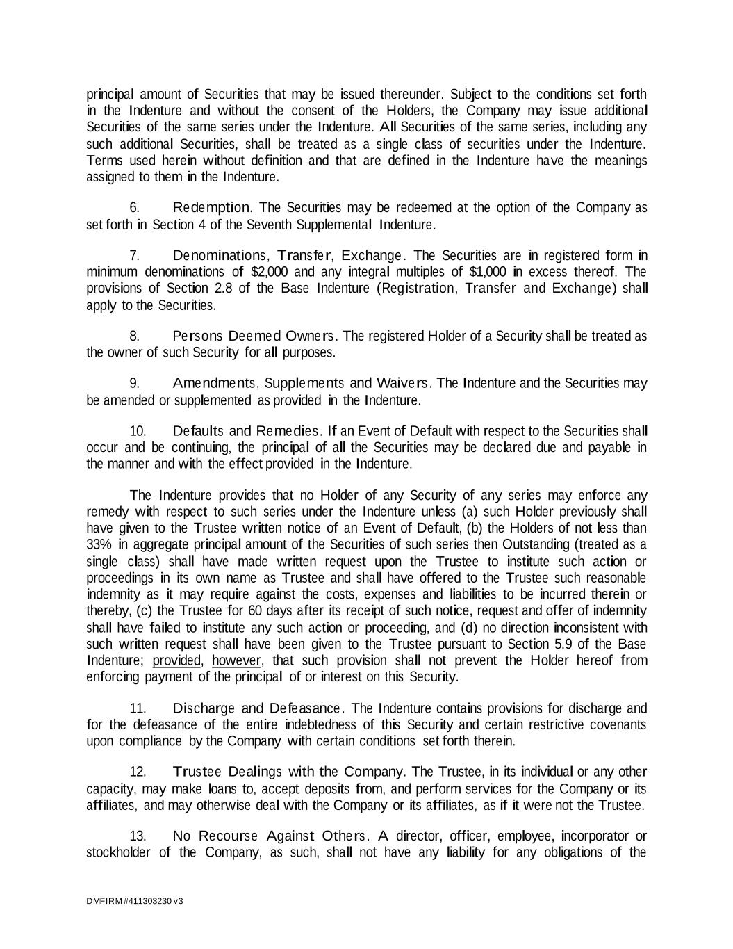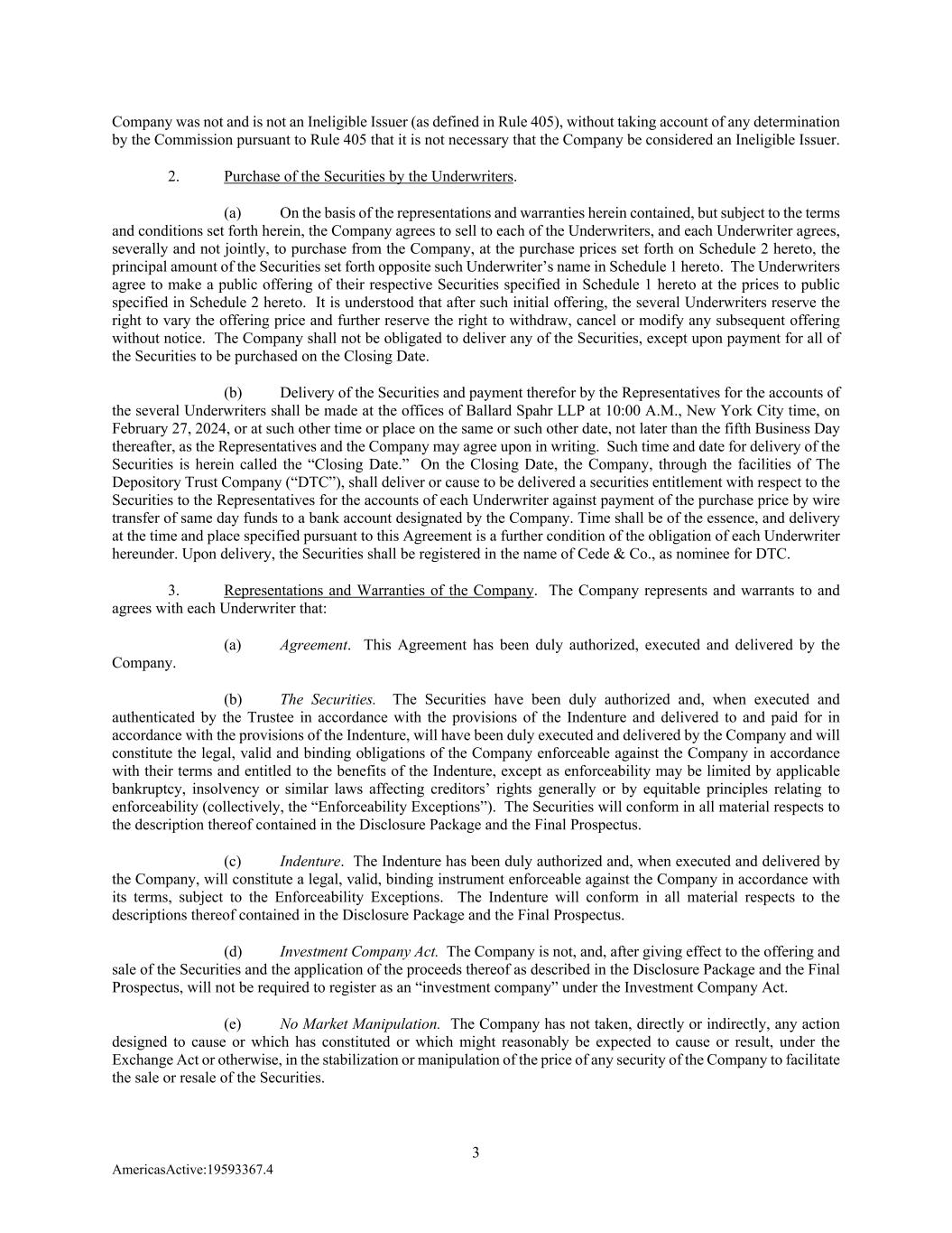 3 AmericasActive:19593367.4 Company was not and is not an Ineligible Issuer (as defined in Rule 405), without taking account of any determination by the Commission pursuant to Rule 405 that it is not necessary that the Company be considered an Ineligible Issuer. 2. Purchase of the Securities by the Underwriters. (a) On the basis of the representations and warranties herein contained, but subject to the terms and conditions set forth herein, the Company agrees to sell to each of the Underwriters, and each Underwriter agrees, severally and not jointly, to purchase from the Company, at the purchase prices set forth on Schedule 2 hereto, the principal amount of the Securities set forth opposite such Underwriter’s name in Schedule 1 hereto. The Underwriters agree to make a public offering of their respective Securities specified in Schedule 1 hereto at the prices to public specified in Schedule 2 hereto. It is understood that after such initial offering, the several Underwriters reserve the right to vary the offering price and further reserve the right to withdraw, cancel or modify any subsequent offering without notice. The Company shall not be obligated to deliver any of the Securities, except upon payment for all of the Securities to be purchased on the Closing Date. (b) Delivery of the Securities and payment therefor by the Representatives for the accounts of the several Underwriters shall be made at the offices of Ballard Spahr LLP at 10:00 A.M., New York City time, on February 27, 2024, or at such other time or place on the same or such other date, not later than the fifth Business Day thereafter, as the Representatives and the Company may agree upon in writing. Such time and date for delivery of the Securities is herein called the “Closing Date.” On the Closing Date, the Company, through the facilities of The Depository Trust Company (“DTC”), shall deliver or cause to be delivered a securities entitlement with respect to the Securities to the Representatives for the accounts of each Underwriter against payment of the purchase price by wire transfer of same day funds to a bank account designated by the Company. Time shall be of the essence, and delivery at the time and place specified pursuant to this Agreement is a further condition of the obligation of each Underwriter hereunder. Upon delivery, the Securities shall be registered in the name of Cede & Co., as nominee for DTC. 3. Representations and Warranties of the Company. The Company represents and warrants to and agrees with each Underwriter that: (a) Agreement. This Agreement has been duly authorized, executed and delivered by the Company. (b) The Securities. The Securities have been duly authorized and, when executed and authenticated by the Trustee in accordance with the provisions of the Indenture and delivered to and paid for in accordance with the provisions of the Indenture, will have been duly executed and delivered by the Company and will constitute the legal, valid and binding obligations of the Company enforceable against the Company in accordance with their terms and entitled to the benefits of the Indenture, except as enforceability may be limited by applicable bankruptcy, insolvency or similar laws affecting creditors’ rights generally or by equitable principles relating to enforceability (collectively, the “Enforceability Exceptions”). The Securities will conform in all material respects to the description thereof contained in the Disclosure Package and the Final Prospectus. (c) Indenture. The Indenture has been duly authorized and, when executed and delivered by the Company, will constitute a legal, valid, binding instrument enforceable against the Company in accordance with its terms, subject to the Enforceability Exceptions. The Indenture will conform in all material respects to the descriptions thereof contained in the Disclosure Package and the Final Prospectus. (d) Investment Company Act. The Company is not, and, after giving effect to the offering and sale of the Securities and the application of the proceeds thereof as described in the Disclosure Package and the Final Prospectus, will not be required to register as an “investment company” under the Investment Company Act. (e) No Market Manipulation. The Company has not taken, directly or indirectly, any action designed to cause or which has constituted or which might reasonably be expected to cause or result, under the Exchange Act or otherwise, in the stabilization or manipulation of the price of any security of the Company to facilitate the sale or resale of the Securities.