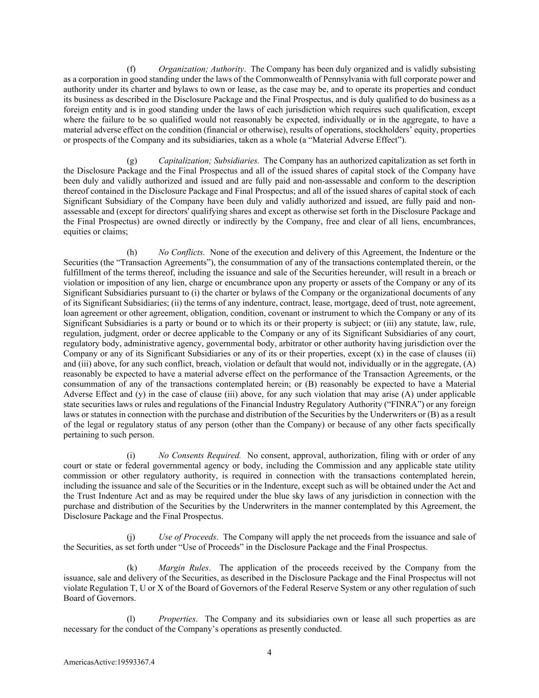 4 AmericasActive:19593367.4 (f) Organization; Authority. The Company has been duly organized and is validly subsisting as a corporation in good standing under the laws of the Commonwealth of Pennsylvania with full corporate power and authority under its charter and bylaws to own or lease, as the case may be, and to operate its properties and conduct its business as described in the Disclosure Package and the Final Prospectus, and is duly qualified to do business as a foreign entity and is in good standing under the laws of each jurisdiction which requires such qualification, except where the failure to be so qualified would not reasonably be expected, individually or in the aggregate, to have a material adverse effect on the condition (financial or otherwise), results of operations, stockholders’ equity, properties or prospects of the Company and its subsidiaries, taken as a whole (a “Material Adverse Effect”). (g) Capitalization; Subsidiaries. The Company has an authorized capitalization as set forth in the Disclosure Package and the Final Prospectus and all of the issued shares of capital stock of the Company have been duly and validly authorized and issued and are fully paid and non-assessable and conform to the description thereof contained in the Disclosure Package and Final Prospectus; and all of the issued shares of capital stock of each Significant Subsidiary of the Company have been duly and validly authorized and issued, are fully paid and non- assessable and (except for directors' qualifying shares and except as otherwise set forth in the Disclosure Package and the Final Prospectus) are owned directly or indirectly by the Company, free and clear of all liens, encumbrances, equities or claims; (h) No Conflicts. None of the execution and delivery of this Agreement, the Indenture or the Securities (the “Transaction Agreements”), the consummation of any of the transactions contemplated therein, or the fulfillment of the terms thereof, including the issuance and sale of the Securities hereunder, will result in a breach or violation or imposition of any lien, charge or encumbrance upon any property or assets of the Company or any of its Significant Subsidiaries pursuant to (i) the charter or bylaws of the Company or the organizational documents of any of its Significant Subsidiaries; (ii) the terms of any indenture, contract, lease, mortgage, deed of trust, note agreement, loan agreement or other agreement, obligation, condition, covenant or instrument to which the Company or any of its Significant Subsidiaries is a party or bound or to which its or their property is subject; or (iii) any statute, law, rule, regulation, judgment, order or decree applicable to the Company or any of its Significant Subsidiaries of any court, regulatory body, administrative agency, governmental body, arbitrator or other authority having jurisdiction over the Company or any of its Significant Subsidiaries or any of its or their properties, except (x) in the case of clauses (ii) and (iii) above, for any such conflict, breach, violation or default that would not, individually or in the aggregate, (A) reasonably be expected to have a material adverse effect on the performance of the Transaction Agreements, or the consummation of any of the transactions contemplated herein; or (B) reasonably be expected to have a Material Adverse Effect and (y) in the case of clause (iii) above, for any such violation that may arise (A) under applicable state securities laws or rules and regulations of the Financial Industry Regulatory Authority (“FINRA”) or any foreign laws or statutes in connection with the purchase and distribution of the Securities by the Underwriters or (B) as a result of the legal or regulatory status of any person (other than the Company) or because of any other facts specifically pertaining to such person. (i) No Consents Required. No consent, approval, authorization, filing with or order of any court or state or federal governmental agency or body, including the Commission and any applicable state utility commission or other regulatory authority, is required in connection with the transactions contemplated herein, including the issuance and sale of the Securities or in the Indenture, except such as will be obtained under the Act and the Trust Indenture Act and as may be required under the blue sky laws of any jurisdiction in connection with the purchase and distribution of the Securities by the Underwriters in the manner contemplated by this Agreement, the Disclosure Package and the Final Prospectus. (j) Use of Proceeds. The Company will apply the net proceeds from the issuance and sale of the Securities, as set forth under “Use of Proceeds” in the Disclosure Package and the Final Prospectus. (k) Margin Rules. The application of the proceeds received by the Company from the issuance, sale and delivery of the Securities, as described in the Disclosure Package and the Final Prospectus will not violate Regulation T, U or X of the Board of Governors of the Federal Reserve System or any other regulation of such Board of Governors. (l) Properties. The Company and its subsidiaries own or lease all such properties as are necessary for the conduct of the Company’s operations as presently conducted.