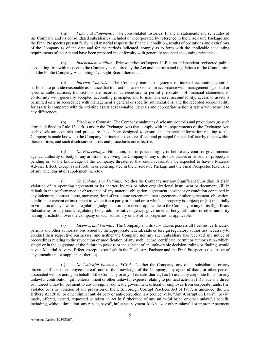 5 AmericasActive:19593367.4 (m) Financial Statements. The consolidated historical financial statements and schedules of the Company and its consolidated subsidiaries included or incorporated by reference in the Disclosure Package and the Final Prospectus present fairly in all material respects the financial condition, results of operations and cash flows of the Company as of the date and for the periods indicated, comply as to form with the applicable accounting requirements of the Act and have been prepared in conformity with generally accepted accounting principles. (n) Independent Auditor. PricewaterhouseCoopers LLP is an independent registered public accounting firm with respect to the Company as required by the Act and the rules and regulations of the Commission and the Public Company Accounting Oversight Board thereunder. (o) Internal Controls. The Company maintains systems of internal accounting controls sufficient to provide reasonable assurance that transactions are executed in accordance with management’s general or specific authorizations, transactions are recorded as necessary to permit preparation of financial statements in conformity with generally accepted accounting principles and to maintain asset accountability, access to assets is permitted only in accordance with management’s general or specific authorizations, and the recorded accountability for assets is compared with the existing assets at reasonable intervals and appropriate action is taken with respect to any differences. (p) Disclosure Controls. The Company maintains disclosure controls and procedures (as such term is defined in Rule 13a-15(e) under the Exchange Act) that comply with the requirements of the Exchange Act, such disclosure controls and procedures have been designed to ensure that material information relating to the Company is made known to the Company’s principal executive officer and principal financial officer by others within those entities, and such disclosure controls and procedures are effective. (q) No Proceedings. No action, suit or proceeding by or before any court or governmental agency, authority or body or any arbitrator involving the Company or any of its subsidiaries or its or their property is pending or, to the knowledge of the Company, threatened that could reasonably be expected to have a Material Adverse Effect, except as set forth in or contemplated in the Disclosure Package and the Final Prospectus (exclusive of any amendment or supplement thereto). (r) No Violations or Defaults. Neither the Company nor any Significant Subsidiary is (i) in violation of its operating agreement or its charter, bylaws or other organizational instrument or document; (ii) in default in the performance or observance of any material obligation, agreement, covenant or condition contained in any indenture, contract, lease, mortgage, deed of trust, note agreement, loan agreement or other agreement, obligation, condition, covenant or instrument to which it is a party or bound or to which its property is subject; or (iii) materially in violation of any law, rule, regulation, judgment, order or decree applicable to the Company or any of its Significant Subsidiaries or any court, regulatory body, administrative agency, governmental body, arbitrator or other authority having jurisdiction over the Company or such subsidiary or any of its properties, as applicable. (s) Licenses and Permits. The Company and its subsidiaries possess all licenses, certificates, permits and other authorizations issued by the appropriate federal, state or foreign regulatory authorities necessary to conduct their respective businesses, and neither the Company nor any such subsidiary has received any notice of proceedings relating to the revocation or modification of any such license, certificate, permit or authorization which, singly or in the aggregate, if the failure to possess or the subject of an unfavorable decision, ruling or finding, would have a Material Adverse Effect, except as set forth in the Disclosure Package and the Final Prospectus (exclusive of any amendment or supplement thereto). (t) No Unlawful Payments; FCPA. Neither the Company, any of its subsidiaries, or any director, officer, or employee thereof, nor, to the knowledge of the Company, any agent affiliate, or other person associated with or acting on behalf of the Company or any of its subsidiaries, has (i) used any corporate funds for any unlawful contribution, gift, entertainment or other unlawful expense relating to political activity; (ii) made any direct or indirect unlawful payment to any foreign or domestic government official or employee from corporate funds; (iii) violated or is in violation of any provision of the U.S. Foreign Corrupt Practices Act of 1977, as amended, the UK Bribery Act 2010, or other similar anti-bribery or anti-corruption law (collectively, “Anti-Corruption Laws”); or (iv) made, offered, agreed, requested or taken an act in furtherance of any unlawful bribe or other unlawful benefit, including, without limitation, any rebate, payoff, influence payment, kickback or other unlawful or improper payment