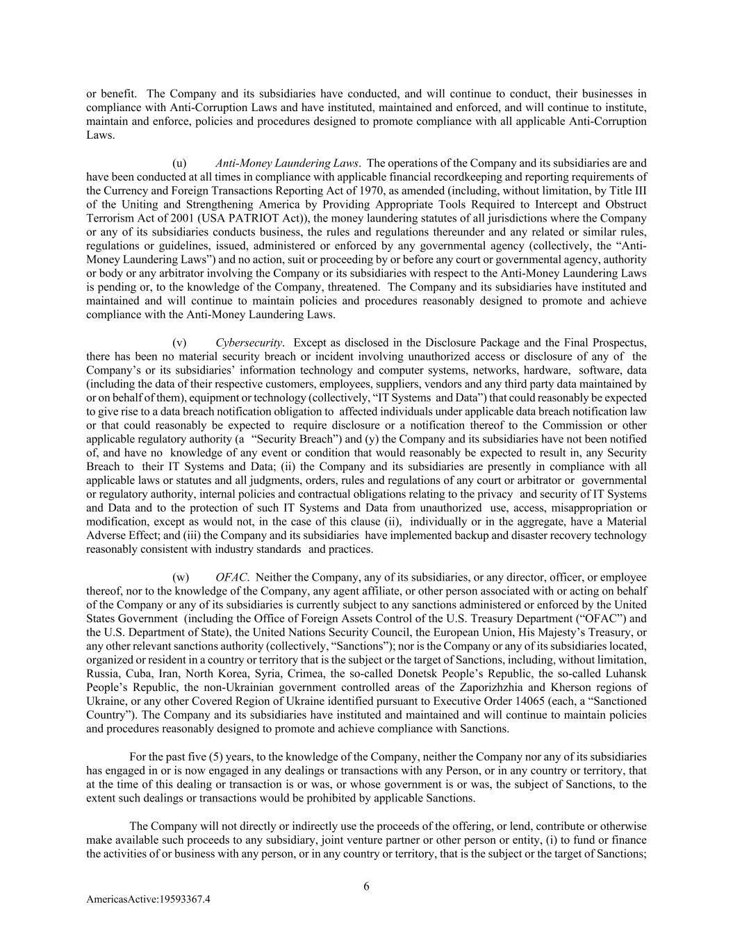 6 AmericasActive:19593367.4 or benefit. The Company and its subsidiaries have conducted, and will continue to conduct, their businesses in compliance with Anti-Corruption Laws and have instituted, maintained and enforced, and will continue to institute, maintain and enforce, policies and procedures designed to promote compliance with all applicable Anti-Corruption Laws. (u) Anti-Money Laundering Laws. The operations of the Company and its subsidiaries are and have been conducted at all times in compliance with applicable financial recordkeeping and reporting requirements of the Currency and Foreign Transactions Reporting Act of 1970, as amended (including, without limitation, by Title III of the Uniting and Strengthening America by Providing Appropriate Tools Required to Intercept and Obstruct Terrorism Act of 2001 (USA PATRIOT Act)), the money laundering statutes of all jurisdictions where the Company or any of its subsidiaries conducts business, the rules and regulations thereunder and any related or similar rules, regulations or guidelines, issued, administered or enforced by any governmental agency (collectively, the “Anti- Money Laundering Laws”) and no action, suit or proceeding by or before any court or governmental agency, authority or body or any arbitrator involving the Company or its subsidiaries with respect to the Anti-Money Laundering Laws is pending or, to the knowledge of the Company, threatened. The Company and its subsidiaries have instituted and maintained and will continue to maintain policies and procedures reasonably designed to promote and achieve compliance with the Anti-Money Laundering Laws. (v) Cybersecurity. Except as disclosed in the Disclosure Package and the Final Prospectus, there has been no material security breach or incident involving unauthorized access or disclosure of any of the Company’s or its subsidiaries’ information technology and computer systems, networks, hardware, software, data (including the data of their respective customers, employees, suppliers, vendors and any third party data maintained by or on behalf of them), equipment or technology (collectively, “IT Systems and Data”) that could reasonably be expected to give rise to a data breach notification obligation to affected individuals under applicable data breach notification law or that could reasonably be expected to require disclosure or a notification thereof to the Commission or other applicable regulatory authority (a “Security Breach”) and (y) the Company and its subsidiaries have not been notified of, and have no knowledge of any event or condition that would reasonably be expected to result in, any Security Breach to their IT Systems and Data; (ii) the Company and its subsidiaries are presently in compliance with all applicable laws or statutes and all judgments, orders, rules and regulations of any court or arbitrator or governmental or regulatory authority, internal policies and contractual obligations relating to the privacy and security of IT Systems and Data and to the protection of such IT Systems and Data from unauthorized use, access, misappropriation or modification, except as would not, in the case of this clause (ii), individually or in the aggregate, have a Material Adverse Effect; and (iii) the Company and its subsidiaries have implemented backup and disaster recovery technology reasonably consistent with industry standards and practices. (w) OFAC. Neither the Company, any of its subsidiaries, or any director, officer, or employee thereof, nor to the knowledge of the Company, any agent affiliate, or other person associated with or acting on behalf of the Company or any of its subsidiaries is currently subject to any sanctions administered or enforced by the United States Government (including the Office of Foreign Assets Control of the U.S. Treasury Department (“OFAC”) and the U.S. Department of State), the United Nations Security Council, the European Union, His Majesty’s Treasury, or any other relevant sanctions authority (collectively, “Sanctions”); nor is the Company or any of its subsidiaries located, organized or resident in a country or territory that is the subject or the target of Sanctions, including, without limitation, Russia, Cuba, Iran, North Korea, Syria, Crimea, the so-called Donetsk People’s Republic, the so-called Luhansk People’s Republic, the non-Ukrainian government controlled areas of the Zaporizhzhia and Kherson regions of Ukraine, or any other Covered Region of Ukraine identified pursuant to Executive Order 14065 (each, a “Sanctioned Country”). The Company and its subsidiaries have instituted and maintained and will continue to maintain policies and procedures reasonably designed to promote and achieve compliance with Sanctions. For the past five (5) years, to the knowledge of the Company, neither the Company nor any of its subsidiaries has engaged in or is now engaged in any dealings or transactions with any Person, or in any country or territory, that at the time of this dealing or transaction is or was, or whose government is or was, the subject of Sanctions, to the extent such dealings or transactions would be prohibited by applicable Sanctions. The Company will not directly or indirectly use the proceeds of the offering, or lend, contribute or otherwise make available such proceeds to any subsidiary, joint venture partner or other person or entity, (i) to fund or finance the activities of or business with any person, or in any country or territory, that is the subject or the target of Sanctions;