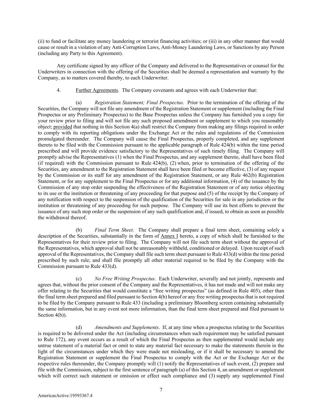 7 AmericasActive:19593367.4 (ii) to fund or facilitate any money laundering or terrorist financing activities; or (iii) in any other manner that would cause or result in a violation of any Anti-Corruption Laws, Anti-Money Laundering Laws, or Sanctions by any Person (including any Party to this Agreement). Any certificate signed by any officer of the Company and delivered to the Representatives or counsel for the Underwriters in connection with the offering of the Securities shall be deemed a representation and warranty by the Company, as to matters covered thereby, to each Underwriter. 4. Further Agreements. The Company covenants and agrees with each Underwriter that: (a) Registration Statement; Final Prospectus. Prior to the termination of the offering of the Securities, the Company will not file any amendment of the Registration Statement or supplement (including the Final Prospectus or any Preliminary Prospectus) to the Base Prospectus unless the Company has furnished you a copy for your review prior to filing and will not file any such proposed amendment or supplement to which you reasonably object; provided that nothing in this Section 4(a) shall restrict the Company from making any filings required in order to comply with its reporting obligations under the Exchange Act or the rules and regulations of the Commission promulgated thereunder. The Company will cause the Final Prospectus, properly completed, and any supplement thereto to be filed with the Commission pursuant to the applicable paragraph of Rule 424(b) within the time period prescribed and will provide evidence satisfactory to the Representatives of such timely filing. The Company will promptly advise the Representatives (1) when the Final Prospectus, and any supplement thereto, shall have been filed (if required) with the Commission pursuant to Rule 424(b), (2) when, prior to termination of the offering of the Securities, any amendment to the Registration Statement shall have been filed or become effective, (3) of any request by the Commission or its staff for any amendment of the Registration Statement, or any Rule 462(b) Registration Statement, or for any supplement to the Final Prospectus or for any additional information, (4) of the issuance by the Commission of any stop order suspending the effectiveness of the Registration Statement or of any notice objecting to its use or the institution or threatening of any proceeding for that purpose and (5) of the receipt by the Company of any notification with respect to the suspension of the qualification of the Securities for sale in any jurisdiction or the institution or threatening of any proceeding for such purpose. The Company will use its best efforts to prevent the issuance of any such stop order or the suspension of any such qualification and, if issued, to obtain as soon as possible the withdrawal thereof. (b) Final Term Sheet. The Company shall prepare a final term sheet, containing solely a description of the Securities, substantially in the form of Annex I hereto, a copy of which shall be furnished to the Representatives for their review prior to filing. The Company will not file such term sheet without the approval of the Representatives, which approval shall not be unreasonably withheld, conditioned or delayed. Upon receipt of such approval of the Representatives, the Company shall file such term sheet pursuant to Rule 433(d) within the time period prescribed by such rule; and shall file promptly all other material required to be filed by the Company with the Commission pursuant to Rule 433(d). (c) No Free Writing Prospectus. Each Underwriter, severally and not jointly, represents and agrees that, without the prior consent of the Company and the Representatives, it has not made and will not make any offer relating to the Securities that would constitute a “free writing prospectus” (as defined in Rule 405), other than the final term sheet prepared and filed pursuant to Section 4(b) hereof or any free writing prospectus that is not required to be filed by the Company pursuant to Rule 433 (including a preliminary Bloomberg screen containing substantially the same information, but in any event not more information, than the final term sheet prepared and filed pursuant to Section 4(b)). (d) Amendments and Supplements. If, at any time when a prospectus relating to the Securities is required to be delivered under the Act (including circumstances when such requirement may be satisfied pursuant to Rule 172), any event occurs as a result of which the Final Prospectus as then supplemented would include any untrue statement of a material fact or omit to state any material fact necessary to make the statements therein in the light of the circumstances under which they were made not misleading, or if it shall be necessary to amend the Registration Statement or supplement the Final Prospectus to comply with the Act or the Exchange Act or the respective rules thereunder, the Company promptly will (1) notify the Representatives of such event, (2) prepare and file with the Commission, subject to the first sentence of paragraph (a) of this Section 4, an amendment or supplement which will correct such statement or omission or effect such compliance and (3) supply any supplemented Final