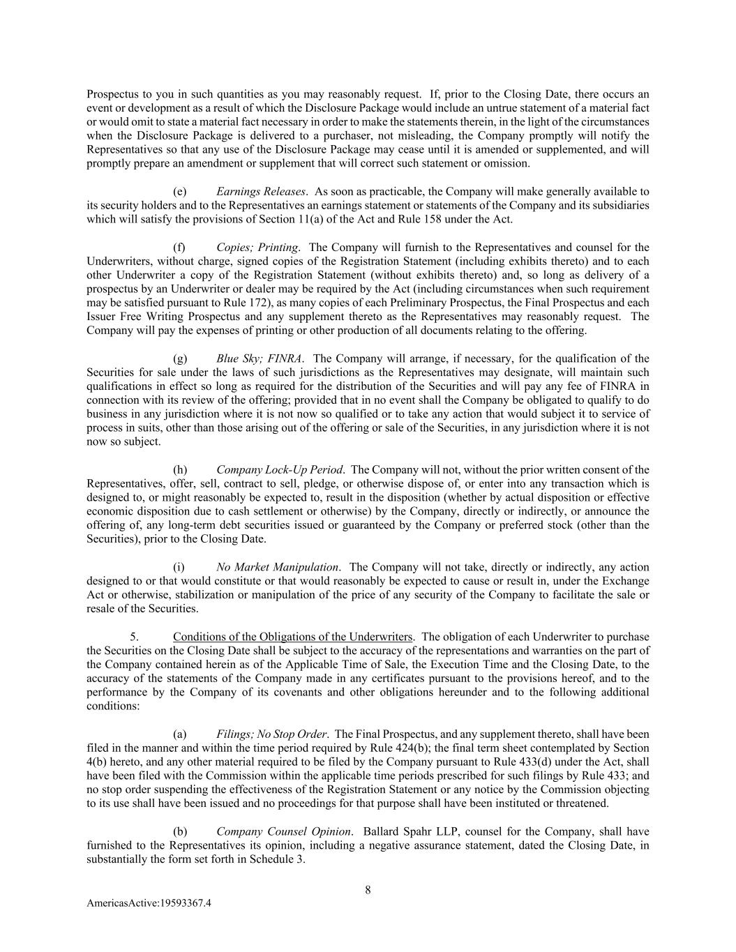 8 AmericasActive:19593367.4 Prospectus to you in such quantities as you may reasonably request. If, prior to the Closing Date, there occurs an event or development as a result of which the Disclosure Package would include an untrue statement of a material fact or would omit to state a material fact necessary in order to make the statements therein, in the light of the circumstances when the Disclosure Package is delivered to a purchaser, not misleading, the Company promptly will notify the Representatives so that any use of the Disclosure Package may cease until it is amended or supplemented, and will promptly prepare an amendment or supplement that will correct such statement or omission. (e) Earnings Releases. As soon as practicable, the Company will make generally available to its security holders and to the Representatives an earnings statement or statements of the Company and its subsidiaries which will satisfy the provisions of Section 11(a) of the Act and Rule 158 under the Act. (f) Copies; Printing. The Company will furnish to the Representatives and counsel for the Underwriters, without charge, signed copies of the Registration Statement (including exhibits thereto) and to each other Underwriter a copy of the Registration Statement (without exhibits thereto) and, so long as delivery of a prospectus by an Underwriter or dealer may be required by the Act (including circumstances when such requirement may be satisfied pursuant to Rule 172), as many copies of each Preliminary Prospectus, the Final Prospectus and each Issuer Free Writing Prospectus and any supplement thereto as the Representatives may reasonably request. The Company will pay the expenses of printing or other production of all documents relating to the offering. (g) Blue Sky; FINRA. The Company will arrange, if necessary, for the qualification of the Securities for sale under the laws of such jurisdictions as the Representatives may designate, will maintain such qualifications in effect so long as required for the distribution of the Securities and will pay any fee of FINRA in connection with its review of the offering; provided that in no event shall the Company be obligated to qualify to do business in any jurisdiction where it is not now so qualified or to take any action that would subject it to service of process in suits, other than those arising out of the offering or sale of the Securities, in any jurisdiction where it is not now so subject. (h) Company Lock-Up Period. The Company will not, without the prior written consent of the Representatives, offer, sell, contract to sell, pledge, or otherwise dispose of, or enter into any transaction which is designed to, or might reasonably be expected to, result in the disposition (whether by actual disposition or effective economic disposition due to cash settlement or otherwise) by the Company, directly or indirectly, or announce the offering of, any long-term debt securities issued or guaranteed by the Company or preferred stock (other than the Securities), prior to the Closing Date. (i) No Market Manipulation. The Company will not take, directly or indirectly, any action designed to or that would constitute or that would reasonably be expected to cause or result in, under the Exchange Act or otherwise, stabilization or manipulation of the price of any security of the Company to facilitate the sale or resale of the Securities. 5. Conditions of the Obligations of the Underwriters. The obligation of each Underwriter to purchase the Securities on the Closing Date shall be subject to the accuracy of the representations and warranties on the part of the Company contained herein as of the Applicable Time of Sale, the Execution Time and the Closing Date, to the accuracy of the statements of the Company made in any certificates pursuant to the provisions hereof, and to the performance by the Company of its covenants and other obligations hereunder and to the following additional conditions: (a) Filings; No Stop Order. The Final Prospectus, and any supplement thereto, shall have been filed in the manner and within the time period required by Rule 424(b); the final term sheet contemplated by Section 4(b) hereto, and any other material required to be filed by the Company pursuant to Rule 433(d) under the Act, shall have been filed with the Commission within the applicable time periods prescribed for such filings by Rule 433; and no stop order suspending the effectiveness of the Registration Statement or any notice by the Commission objecting to its use shall have been issued and no proceedings for that purpose shall have been instituted or threatened. (b) Company Counsel Opinion. Ballard Spahr LLP, counsel for the Company, shall have furnished to the Representatives its opinion, including a negative assurance statement, dated the Closing Date, in substantially the form set forth in Schedule 3.