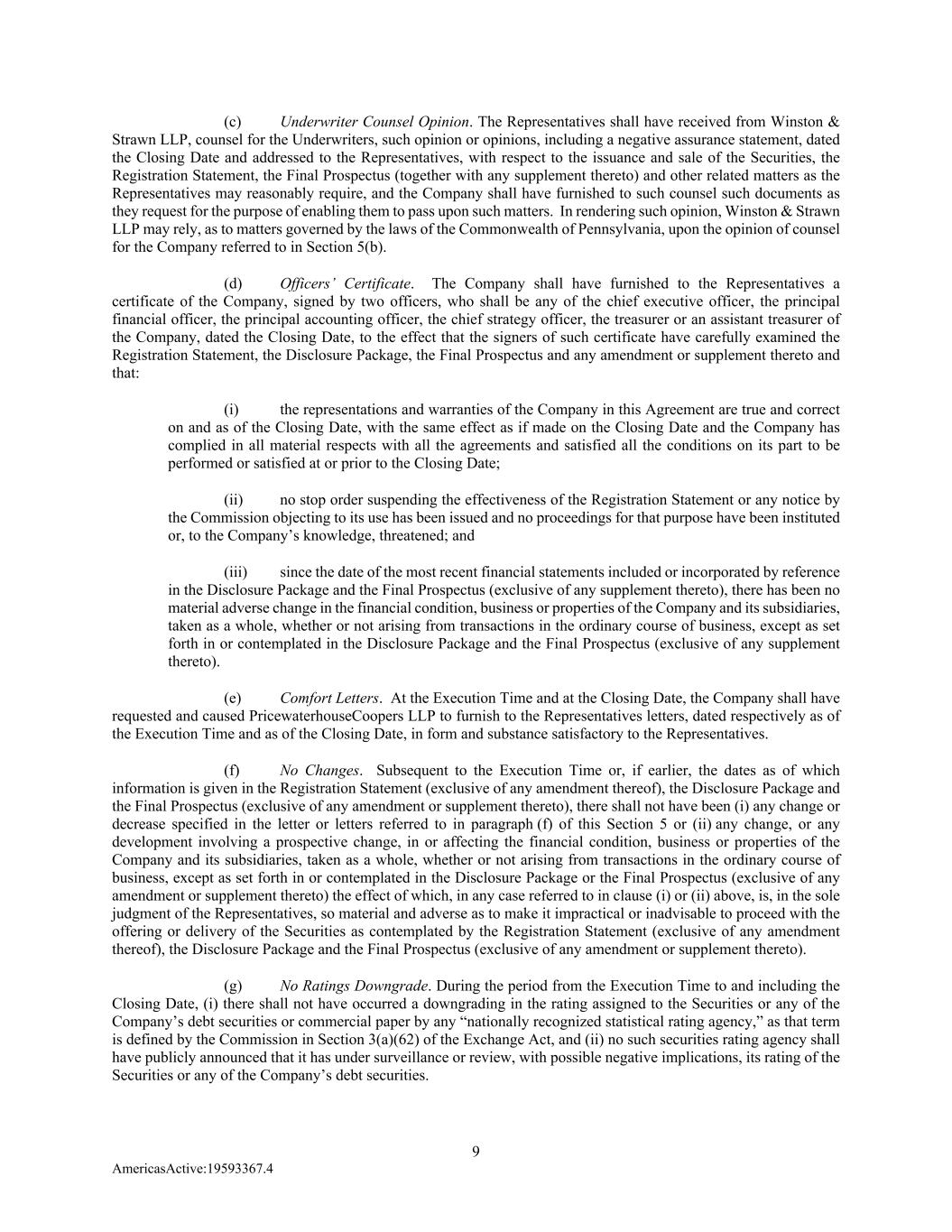 9 AmericasActive:19593367.4 (c) Underwriter Counsel Opinion. The Representatives shall have received from Winston & Strawn LLP, counsel for the Underwriters, such opinion or opinions, including a negative assurance statement, dated the Closing Date and addressed to the Representatives, with respect to the issuance and sale of the Securities, the Registration Statement, the Final Prospectus (together with any supplement thereto) and other related matters as the Representatives may reasonably require, and the Company shall have furnished to such counsel such documents as they request for the purpose of enabling them to pass upon such matters. In rendering such opinion, Winston & Strawn LLP may rely, as to matters governed by the laws of the Commonwealth of Pennsylvania, upon the opinion of counsel for the Company referred to in Section 5(b). (d) Officers’ Certificate. The Company shall have furnished to the Representatives a certificate of the Company, signed by two officers, who shall be any of the chief executive officer, the principal financial officer, the principal accounting officer, the chief strategy officer, the treasurer or an assistant treasurer of the Company, dated the Closing Date, to the effect that the signers of such certificate have carefully examined the Registration Statement, the Disclosure Package, the Final Prospectus and any amendment or supplement thereto and that: (i) the representations and warranties of the Company in this Agreement are true and correct on and as of the Closing Date, with the same effect as if made on the Closing Date and the Company has complied in all material respects with all the agreements and satisfied all the conditions on its part to be performed or satisfied at or prior to the Closing Date; (ii) no stop order suspending the effectiveness of the Registration Statement or any notice by the Commission objecting to its use has been issued and no proceedings for that purpose have been instituted or, to the Company’s knowledge, threatened; and (iii) since the date of the most recent financial statements included or incorporated by reference in the Disclosure Package and the Final Prospectus (exclusive of any supplement thereto), there has been no material adverse change in the financial condition, business or properties of the Company and its subsidiaries, taken as a whole, whether or not arising from transactions in the ordinary course of business, except as set forth in or contemplated in the Disclosure Package and the Final Prospectus (exclusive of any supplement thereto). (e) Comfort Letters. At the Execution Time and at the Closing Date, the Company shall have requested and caused PricewaterhouseCoopers LLP to furnish to the Representatives letters, dated respectively as of the Execution Time and as of the Closing Date, in form and substance satisfactory to the Representatives. (f) No Changes. Subsequent to the Execution Time or, if earlier, the dates as of which information is given in the Registration Statement (exclusive of any amendment thereof), the Disclosure Package and the Final Prospectus (exclusive of any amendment or supplement thereto), there shall not have been (i) any change or decrease specified in the letter or letters referred to in paragraph (f) of this Section 5 or (ii) any change, or any development involving a prospective change, in or affecting the financial condition, business or properties of the Company and its subsidiaries, taken as a whole, whether or not arising from transactions in the ordinary course of business, except as set forth in or contemplated in the Disclosure Package or the Final Prospectus (exclusive of any amendment or supplement thereto) the effect of which, in any case referred to in clause (i) or (ii) above, is, in the sole judgment of the Representatives, so material and adverse as to make it impractical or inadvisable to proceed with the offering or delivery of the Securities as contemplated by the Registration Statement (exclusive of any amendment thereof), the Disclosure Package and the Final Prospectus (exclusive of any amendment or supplement thereto). (g) No Ratings Downgrade. During the period from the Execution Time to and including the Closing Date, (i) there shall not have occurred a downgrading in the rating assigned to the Securities or any of the Company’s debt securities or commercial paper by any “nationally recognized statistical rating agency,” as that term is defined by the Commission in Section 3(a)(62) of the Exchange Act, and (ii) no such securities rating agency shall have publicly announced that it has under surveillance or review, with possible negative implications, its rating of the Securities or any of the Company’s debt securities.