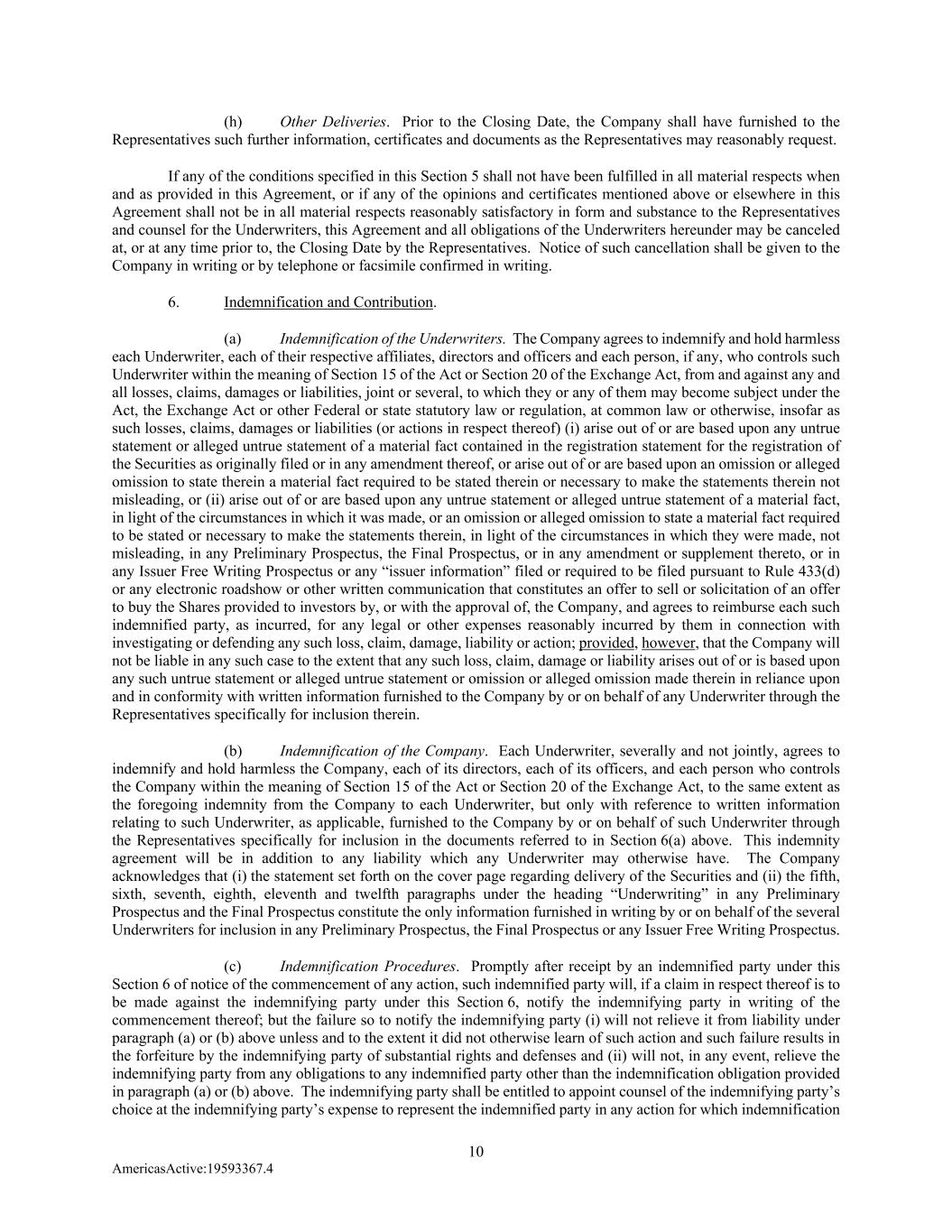 10 AmericasActive:19593367.4 (h) Other Deliveries. Prior to the Closing Date, the Company shall have furnished to the Representatives such further information, certificates and documents as the Representatives may reasonably request. If any of the conditions specified in this Section 5 shall not have been fulfilled in all material respects when and as provided in this Agreement, or if any of the opinions and certificates mentioned above or elsewhere in this Agreement shall not be in all material respects reasonably satisfactory in form and substance to the Representatives and counsel for the Underwriters, this Agreement and all obligations of the Underwriters hereunder may be canceled at, or at any time prior to, the Closing Date by the Representatives. Notice of such cancellation shall be given to the Company in writing or by telephone or facsimile confirmed in writing. 6. Indemnification and Contribution. (a) Indemnification of the Underwriters. The Company agrees to indemnify and hold harmless each Underwriter, each of their respective affiliates, directors and officers and each person, if any, who controls such Underwriter within the meaning of Section 15 of the Act or Section 20 of the Exchange Act, from and against any and all losses, claims, damages or liabilities, joint or several, to which they or any of them may become subject under the Act, the Exchange Act or other Federal or state statutory law or regulation, at common law or otherwise, insofar as such losses, claims, damages or liabilities (or actions in respect thereof) (i) arise out of or are based upon any untrue statement or alleged untrue statement of a material fact contained in the registration statement for the registration of the Securities as originally filed or in any amendment thereof, or arise out of or are based upon an omission or alleged omission to state therein a material fact required to be stated therein or necessary to make the statements therein not misleading, or (ii) arise out of or are based upon any untrue statement or alleged untrue statement of a material fact, in light of the circumstances in which it was made, or an omission or alleged omission to state a material fact required to be stated or necessary to make the statements therein, in light of the circumstances in which they were made, not misleading, in any Preliminary Prospectus, the Final Prospectus, or in any amendment or supplement thereto, or in any Issuer Free Writing Prospectus or any “issuer information” filed or required to be filed pursuant to Rule 433(d) or any electronic roadshow or other written communication that constitutes an offer to sell or solicitation of an offer to buy the Shares provided to investors by, or with the approval of, the Company, and agrees to reimburse each such indemnified party, as incurred, for any legal or other expenses reasonably incurred by them in connection with investigating or defending any such loss, claim, damage, liability or action; provided, however, that the Company will not be liable in any such case to the extent that any such loss, claim, damage or liability arises out of or is based upon any such untrue statement or alleged untrue statement or omission or alleged omission made therein in reliance upon and in conformity with written information furnished to the Company by or on behalf of any Underwriter through the Representatives specifically for inclusion therein. (b) Indemnification of the Company. Each Underwriter, severally and not jointly, agrees to indemnify and hold harmless the Company, each of its directors, each of its officers, and each person who controls the Company within the meaning of Section 15 of the Act or Section 20 of the Exchange Act, to the same extent as the foregoing indemnity from the Company to each Underwriter, but only with reference to written information relating to such Underwriter, as applicable, furnished to the Company by or on behalf of such Underwriter through the Representatives specifically for inclusion in the documents referred to in Section 6(a) above. This indemnity agreement will be in addition to any liability which any Underwriter may otherwise have. The Company acknowledges that (i) the statement set forth on the cover page regarding delivery of the Securities and (ii) the fifth, sixth, seventh, eighth, eleventh and twelfth paragraphs under the heading “Underwriting” in any Preliminary Prospectus and the Final Prospectus constitute the only information furnished in writing by or on behalf of the several Underwriters for inclusion in any Preliminary Prospectus, the Final Prospectus or any Issuer Free Writing Prospectus. (c) Indemnification Procedures. Promptly after receipt by an indemnified party under this Section 6 of notice of the commencement of any action, such indemnified party will, if a claim in respect thereof is to be made against the indemnifying party under this Section 6, notify the indemnifying party in writing of the commencement thereof; but the failure so to notify the indemnifying party (i) will not relieve it from liability under paragraph (a) or (b) above unless and to the extent it did not otherwise learn of such action and such failure results in the forfeiture by the indemnifying party of substantial rights and defenses and (ii) will not, in any event, relieve the indemnifying party from any obligations to any indemnified party other than the indemnification obligation provided in paragraph (a) or (b) above. The indemnifying party shall be entitled to appoint counsel of the indemnifying party’s choice at the indemnifying party’s expense to represent the indemnified party in any action for which indemnification