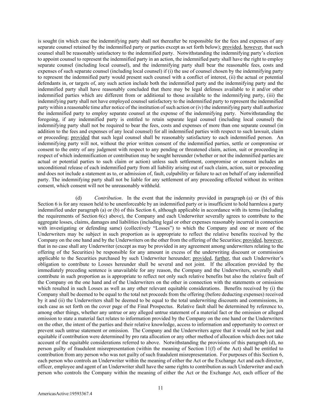 11 AmericasActive:19593367.4 is sought (in which case the indemnifying party shall not thereafter be responsible for the fees and expenses of any separate counsel retained by the indemnified party or parties except as set forth below); provided, however, that such counsel shall be reasonably satisfactory to the indemnified party. Notwithstanding the indemnifying party’s election to appoint counsel to represent the indemnified party in an action, the indemnified party shall have the right to employ separate counsel (including local counsel), and the indemnifying party shall bear the reasonable fees, costs and expenses of such separate counsel (including local counsel) if (i) the use of counsel chosen by the indemnifying party to represent the indemnified party would present such counsel with a conflict of interest, (ii) the actual or potential defendants in, or targets of, any such action include both the indemnified party and the indemnifying party and the indemnified party shall have reasonably concluded that there may be legal defenses available to it and/or other indemnified parties which are different from or additional to those available to the indemnifying party, (iii) the indemnifying party shall not have employed counsel satisfactory to the indemnified party to represent the indemnified party within a reasonable time after notice of the institution of such action or (iv) the indemnifying party shall authorize the indemnified party to employ separate counsel at the expense of the indemnifying party. Notwithstanding the foregoing, if any indemnified party is entitled to retain separate legal counsel (including local counsel) the indemnifying party shall not be required to bear the fees, costs and expenses of more than one separate counsel (in addition to the fees and expenses of any local counsel) for all indemnified parties with respect to such lawsuit, claim or proceeding; provided that such legal counsel shall be reasonably satisfactory to each indemnified person. An indemnifying party will not, without the prior written consent of the indemnified parties, settle or compromise or consent to the entry of any judgment with respect to any pending or threatened claim, action, suit or proceeding in respect of which indemnification or contribution may be sought hereunder (whether or not the indemnified parties are actual or potential parties to such claim or action) unless such settlement, compromise or consent includes an unconditional release of each indemnified party from all liability arising out of such claim, action, suit or proceeding and does not include a statement as to, or admission of, fault, culpability or failure to act on behalf of any indemnified party. The indemnifying party shall not be liable for any settlement of any proceeding effected without its written consent, which consent will not be unreasonably withheld. (d) Contribution. In the event that the indemnity provided in paragraph (a) or (b) of this Section 6 is for any reason held to be unenforceable by an indemnified party or is insufficient to hold harmless a party indemnified under paragraph (a) or (b) of this Section 6, although applicable in accordance with its terms (including the requirements of Section 6(c) above), the Company and each Underwriter severally agrees to contribute to the aggregate losses, claims, damages and liabilities (including legal or other expenses reasonably incurred in connection with investigating or defending same) (collectively “Losses”) to which the Company and one or more of the Underwriters may be subject in such proportion as is appropriate to reflect the relative benefits received by the Company on the one hand and by the Underwriters on the other from the offering of the Securities; provided, however, that in no case shall any Underwriter (except as may be provided in any agreement among underwriters relating to the offering of the Securities) be responsible for any amount in excess of the underwriting discount or commission applicable to the Securities purchased by such Underwriter hereunder; provided, further, that each Underwriter’s obligation to contribute to Losses hereunder shall be several and not joint. If the allocation provided by the immediately preceding sentence is unavailable for any reason, the Company and the Underwriters, severally shall contribute in such proportion as is appropriate to reflect not only such relative benefits but also the relative fault of the Company on the one hand and of the Underwriters on the other in connection with the statements or omissions which resulted in such Losses as well as any other relevant equitable considerations. Benefits received by (i) the Company shall be deemed to be equal to the total net proceeds from the offering (before deducting expenses) received by it and (ii) the Underwriters shall be deemed to be equal to the total underwriting discounts and commissions, in each case as set forth on the cover page of the Final Prospectus. Relative fault shall be determined by reference to, among other things, whether any untrue or any alleged untrue statement of a material fact or the omission or alleged omission to state a material fact relates to information provided by the Company on the one hand or the Underwriters on the other, the intent of the parties and their relative knowledge, access to information and opportunity to correct or prevent such untrue statement or omission. The Company and the Underwriters agree that it would not be just and equitable if contribution were determined by pro rata allocation or any other method of allocation which does not take account of the equitable considerations referred to above. Notwithstanding the provisions of this paragraph (d), no person guilty of fraudulent misrepresentation (within the meaning of Section 11(f) of the Act) shall be entitled to contribution from any person who was not guilty of such fraudulent misrepresentation. For purposes of this Section 6, each 