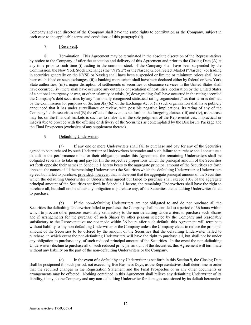 12 AmericasActive:19593367.4 Company and each director of the Company shall have the same rights to contribution as the Company, subject in each case to the applicable terms and conditions of this paragraph (d). 7. [Reserved]. 8. Termination. This Agreement may be terminated in the absolute discretion of the Representatives by notice to the Company, if after the execution and delivery of this Agreement and prior to the Closing Date (A) at any time prior to such time (i) trading in the common stock of the Company shall have been suspended by the Commission, the New York Stock Exchange (the “NYSE”) or the Nasdaq Global Select Market (“Nasdaq”) or trading in securities generally on the NYSE or Nasdaq shall have been suspended or limited or minimum prices shall have been established on such exchanges, (ii) a banking moratorium shall have been declared either by federal or New York State authorities, (iii) a major disruption of settlements of securities or clearance services in the United States shall have occurred, (iv) there shall have occurred any outbreak or escalation of hostilities, declaration by the United States of a national emergency or war, or other calamity or crisis, (v) downgrading shall have occurred in the rating accorded the Company’s debt securities by any “nationally recognized statistical rating organization,” as that term is defined by the Commission for purposes of Section 3(a)(62) of the Exchange Act or (vi) such organization shall have publicly announced that it has under surveillance or review, with possible negative implications, its rating of any of the Company’s debt securities and (B) the effect of the event as set forth in the foregoing clauses (iii) and (iv), as the case may be, on the financial markets is such as to make it, in the sole judgment of the Representatives, impractical or inadvisable to proceed with the offering or delivery of the Securities as contemplated by the Disclosure Package and the Final Prospectus (exclusive of any supplement thereto). 9. Defaulting Underwriter. (a) If any one or more Underwriters shall fail to purchase and pay for any of the Securities agreed to be purchased by such Underwriter or Underwriters hereunder and such failure to purchase shall constitute a default in the performance of its or their obligations under this Agreement, the remaining Underwriters shall be obligated severally to take up and pay for (in the respective proportions which the principal amount of the Securities set forth opposite their names in Schedule 1 hereto bears to the aggregate principal amount of the Securities set forth opposite the names of all the remaining Underwriters) the Securities which the defaulting Underwriter or Underwriters agreed but failed to purchase; provided, however, that in the event that the aggregate principal amount of the Securities which the defaulting Underwriter or Underwriters agreed but failed to purchase shall exceed 10% of the aggregate principal amount of the Securities set forth in Schedule 1 hereto, the remaining Underwriters shall have the right to purchase all, but shall not be under any obligation to purchase any, of the Securities the defaulting Underwriter failed to purchase. (b) If the non-defaulting Underwriters are not obligated to and do not purchase all the Securities the defaulting Underwriter failed to purchase, the Company shall be entitled to a period of 36 hours within which to procure other persons reasonably satisfactory to the non-defaulting Underwriters to purchase such Shares and if arrangements for the purchase of such Shares by other persons selected by the Company and reasonably satisfactory to the Representative are not made within 36 hours after such default, this Agreement will terminate without liability to any non-defaulting Underwriter or the Company unless the Company elects to reduce the principal amount of the Securities to be offered by the amount of the Securities that the defaulting Underwriter failed to purchase, in which event the non-defaulting Underwriters will have the right to purchase all, but shall not be under any obligation to purchase any, of such reduced principal amount of the Securities. In the event the non-defaulting Underwriters decline to purchase all of such reduced principal amount of the Securities, this Agreement will terminate without any liability on the part of the non-defaulting Underwriters or the Company. (c) In the event of a default by any Underwriter as set forth in this Section 9, the Closing Date shall be postponed for such period, not exceeding five Business Days, as the Representatives shall determine in order that the required changes in the Registration Statement and the Final Prospectus or in any other documents or arrangements may be effected. Nothing contained in this Agreement shall relieve any defaulting Underwriter of its liability, if any, to the Company and any non-defaulting Underwriter for damages occasioned by its default hereunder.