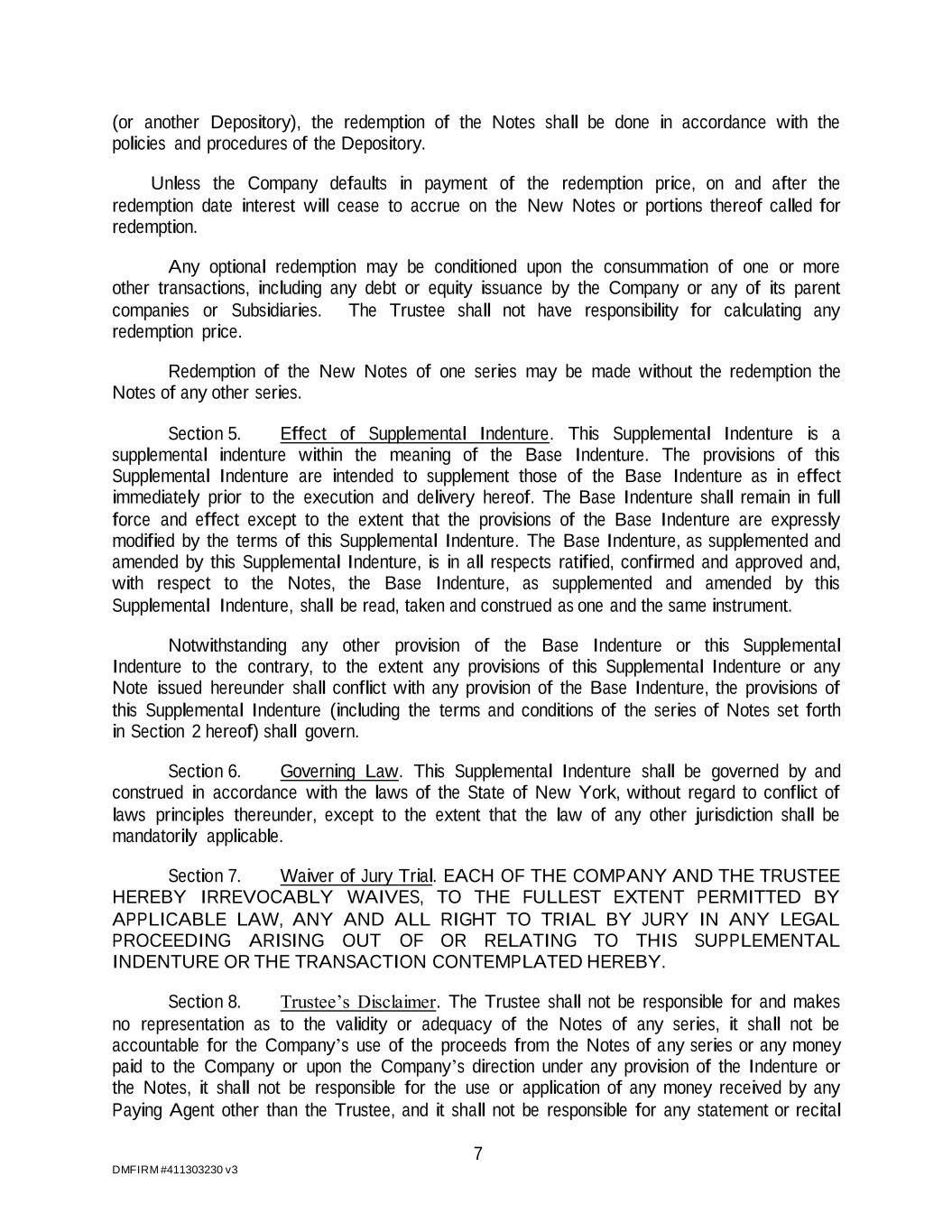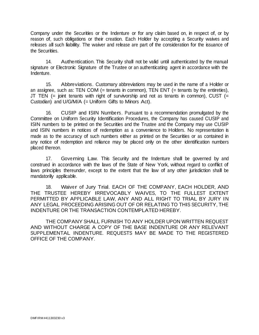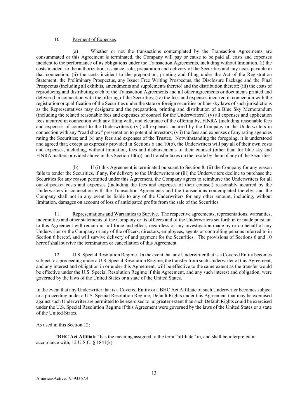 13 AmericasActive:19593367.4 10. Payment of Expenses. (a) Whether or not the transactions contemplated by the Transaction Agreements are consummated or this Agreement is terminated, the Company will pay or cause to be paid all costs and expenses incident to the performance of its obligations under the Transaction Agreements, including without limitation, (i) the costs incident to the authorization, issuance, sale, preparation and delivery of the Securities and any taxes payable in that connection; (ii) the costs incident to the preparation, printing and filing under the Act of the Registration Statement, the Preliminary Prospectus, any Issuer Free Writing Prospectus, the Disclosure Package and the Final Prospectus (including all exhibits, amendments and supplements thereto) and the distribution thereof; (iii) the costs of reproducing and distributing each of the Transaction Agreements and all other agreements or documents printed and delivered in connection with the offering of the Securities; (iv) the fees and expenses incurred in connection with the registration or qualification of the Securities under the state or foreign securities or blue sky laws of such jurisdictions as the Representatives may designate and the preparation, printing and distribution of a Blue Sky Memorandum (including the related reasonable fees and expenses of counsel for the Underwriters); (v) all expenses and application fees incurred in connection with any filing with, and clearance of the offering by, FINRA (including reasonable fees and expenses of counsel to the Underwriters); (vi) all expenses incurred by the Company or the Underwriters in connection with any “road show” presentation to potential investors; (vii) the fees and expenses of any rating agencies rating the Securities; and (x) any fees and expenses of the Trustee. Notwithstanding the foregoing, it is understood and agreed that, except as expressly provided in Sections 6 and 10(b), the Underwriters will pay all of their own costs and expenses, including, without limitation, fees and disbursements of their counsel (other than for blue sky and FINRA matters provided above in this Section 10(a)), and transfer taxes on the resale by them of any of the Securities. (b) If (i) this Agreement is terminated pursuant to Section 8, (ii) the Company for any reason fails to tender the Securities, if any, for delivery to the Underwriters or (iii) the Underwriters decline to purchase the Securities for any reason permitted under this Agreement, the Company agrees to reimburse the Underwriters for all out-of-pocket costs and expenses (including the fees and expenses of their counsel) reasonably incurred by the Underwriters in connection with the Transaction Agreements and the transactions contemplated thereby, and the Company shall not in any event be liable to any of the Underwriters for any other amount, including, without limitation, damages on account of loss of anticipated profits from the sale of the Securities. 11. Representations and Warranties to Survive. The respective agreements, representations, warranties, indemnities and other statements of the Company or its officers and of the Underwriters set forth in or made pursuant to this Agreement will remain in full force and effect, regardless of any investigation made by or on behalf of any Underwriter or the Company or any of the officers, directors, employees, agents or controlling persons referred to in Section 6 hereof, and will survive delivery of and payment for the Securities. The provisions of Sections 6 and 10 hereof shall survive the termination or cancellation of this Agreement. 12. U.S. Special Resolution Regime. In the event that any Underwriter that is a Covered Entity becomes subject to a proceeding under a U.S. Special Resolution Regime, the transfer from such Underwriter of this Agreement, and any interest and obligation in or under this Agreement, will be effective to the same extent as the transfer would be effective under the U.S. Special Resolution Regime if this Agreement, and any such interest and obligation, were governed by the laws of the United States or a state of the United States. In the event that any Underwriter that is a Covered Entity or a BHC Act Affiliate of such Underwriter becomes subject to a proceeding under a U.S. Special Resolution Regime, Default Rights under this Agreement that may be exercised against such Underwriter are permitted to be exercised to no greater extent than such Default Rights could be exercised under the U.S. Special Resolution Regime if this Agreement were governed by the laws of the United States or a state of the United States. As used in this Section 12: “BHC Act Affiliate” has the meaning assigned to the term “affiliate” in, and shall be interpreted in accordance with, 12 U.S.C. § 1841(k).