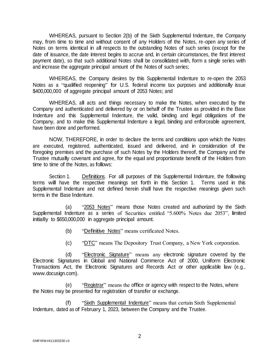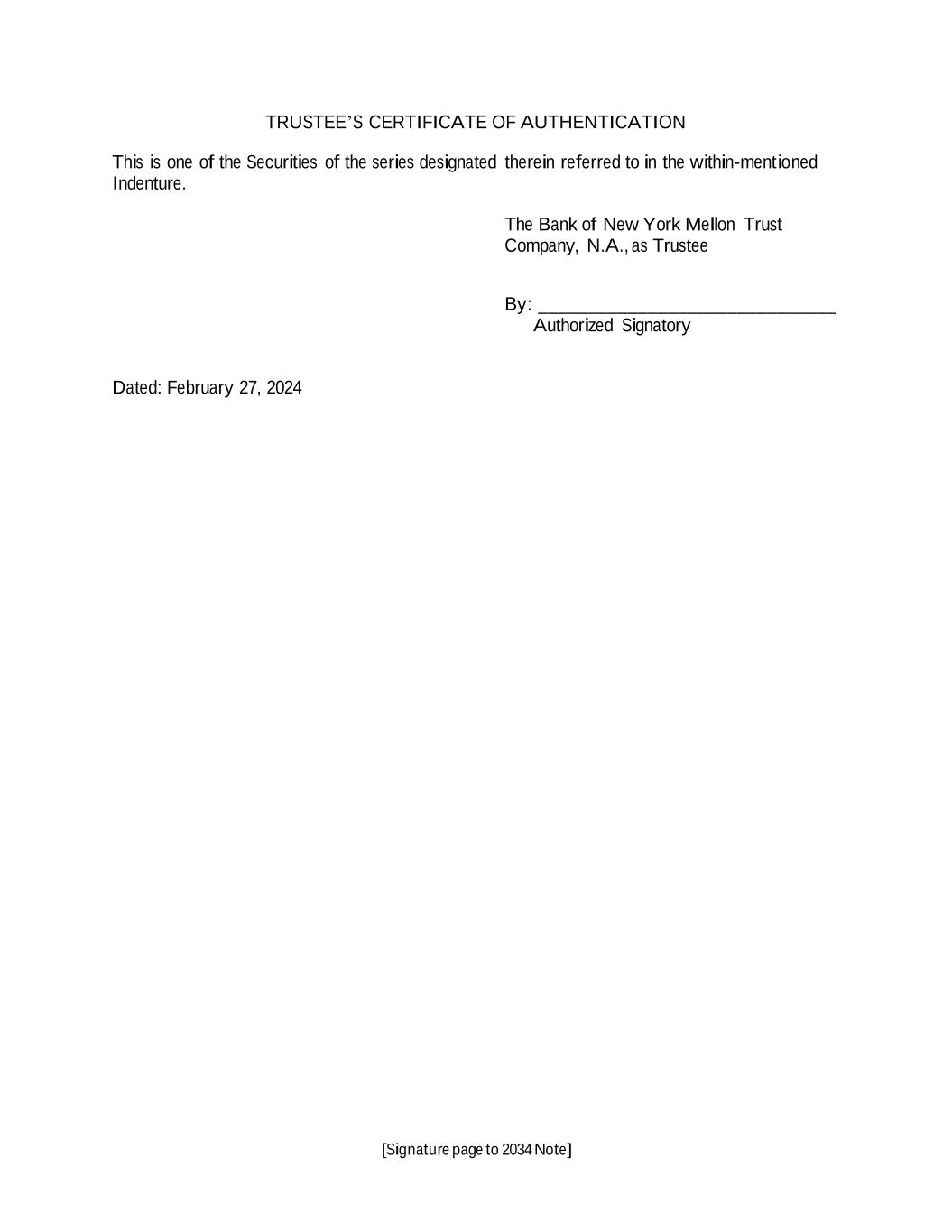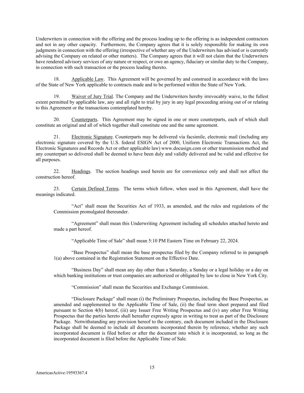 15 AmericasActive:19593367.4 Underwriters in connection with the offering and the process leading up to the offering is as independent contractors and not in any other capacity. Furthermore, the Company agrees that it is solely responsible for making its own judgments in connection with the offering (irrespective of whether any of the Underwriters has advised or is currently advising the Company on related or other matters). The Company agrees that it will not claim that the Underwriters have rendered advisory services of any nature or respect, or owe an agency, fiduciary or similar duty to the Company, in connection with such transaction or the process leading thereto. 18. Applicable Law. This Agreement will be governed by and construed in accordance with the laws of the State of New York applicable to contracts made and to be performed within the State of New York. 19. Waiver of Jury Trial. The Company and the Underwriters hereby irrevocably waive, to the fullest extent permitted by applicable law, any and all right to trial by jury in any legal proceeding arising out of or relating to this Agreement or the transactions contemplated hereby. 20. Counterparts. This Agreement may be signed in one or more counterparts, each of which shall constitute an original and all of which together shall constitute one and the same agreement. 21. Electronic Signature. Counterparts may be delivered via facsimile, electronic mail (including any electronic signature covered by the U.S. federal ESIGN Act of 2000, Uniform Electronic Transactions Act, the Electronic Signatures and Records Act or other applicable law) www.docusign.com or other transmission method and any counterpart so delivered shall be deemed to have been duly and validly delivered and be valid and effective for all purposes. 22. Headings. The section headings used herein are for convenience only and shall not affect the construction hereof. 23. Certain Defined Terms. The terms which follow, when used in this Agreement, shall have the meanings indicated. “Act” shall mean the Securities Act of 1933, as amended, and the rules and regulations of the Commission promulgated thereunder. “Agreement” shall mean this Underwriting Agreement including all schedules attached hereto and made a part hereof. “Applicable Time of Sale” shall mean 5:10 PM Eastern Time on February 22, 2024. “Base Prospectus” shall mean the base prospectus filed by the Company referred to in paragraph 1(a) above contained in the Registration Statement on the Effective Date. “Business Day” shall mean any day other than a Saturday, a Sunday or a legal holiday or a day on which banking institutions or trust companies are authorized or obligated by law to close in New York City. “Commission” shall mean the Securities and Exchange Commission. “Disclosure Package” shall mean (i) the Preliminary Prospectus, including the Base Prospectus, as amended and supplemented to the Applicable Time of Sale, (ii) the final term sheet prepared and filed pursuant to Section 4(b) hereof, (iii) any Issuer Free Writing Prospectus and (iv) any other Free Writing Prospectus that the parties hereto shall hereafter expressly agree in writing to treat as part of the Disclosure Package. Notwithstanding any provision hereof to the contrary, each document included in the Disclosure Package shall be deemed to include all documents incorporated therein by reference, whether any such incorporated document is filed before or after the document into which it is incorporated, so long as the incorporated document is filed before the Applicable Time of Sale.