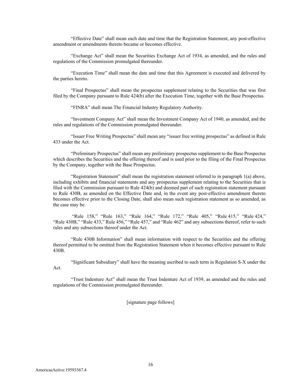 16 AmericasActive:19593367.4 “Effective Date” shall mean each date and time that the Registration Statement, any post-effective amendment or amendments thereto became or becomes effective. “Exchange Act” shall mean the Securities Exchange Act of 1934, as amended, and the rules and regulations of the Commission promulgated thereunder. “Execution Time” shall mean the date and time that this Agreement is executed and delivered by the parties hereto. “Final Prospectus” shall mean the prospectus supplement relating to the Securities that was first filed by the Company pursuant to Rule 424(b) after the Execution Time, together with the Base Prospectus. “FINRA” shall mean The Financial Industry Regulatory Authority. “Investment Company Act” shall mean the Investment Company Act of 1940, as amended, and the rules and regulations of the Commission promulgated thereunder. “Issuer Free Writing Prospectus” shall mean any “issuer free writing prospectus” as defined in Rule 433 under the Act. “Preliminary Prospectus” shall mean any preliminary prospectus supplement to the Base Prospectus which describes the Securities and the offering thereof and is used prior to the filing of the Final Prospectus by the Company, together with the Base Prospectus. “Registration Statement” shall mean the registration statement referred to in paragraph 1(a) above, including exhibits and financial statements and any prospectus supplement relating to the Securities that is filed with the Commission pursuant to Rule 424(b) and deemed part of such registration statement pursuant to Rule 430B, as amended on the Effective Date and, in the event any post-effective amendment thereto becomes effective prior to the Closing Date, shall also mean such registration statement as so amended, as the case may be. “Rule 158,” “Rule 163,” “Rule 164,” “Rule 172,” “Rule 405,” “Rule 415,” “Rule 424,” “Rule 430B,” “Rule 433,” Rule 456,” “Rule 457,” and “Rule 462” and any subsections thereof, refer to such rules and any subsections thereof under the Act. “Rule 430B Information” shall mean information with respect to the Securities and the offering thereof permitted to be omitted from the Registration Statement when it becomes effective pursuant to Rule 430B. “Significant Subsidiary” shall have the meaning ascribed to such term in Regulation S-X under the Act. “Trust Indenture Act” shall mean the Trust Indenture Act of 1939, as amended and the rules and regulations of the Commission promulgated thereunder. [signature page follows]