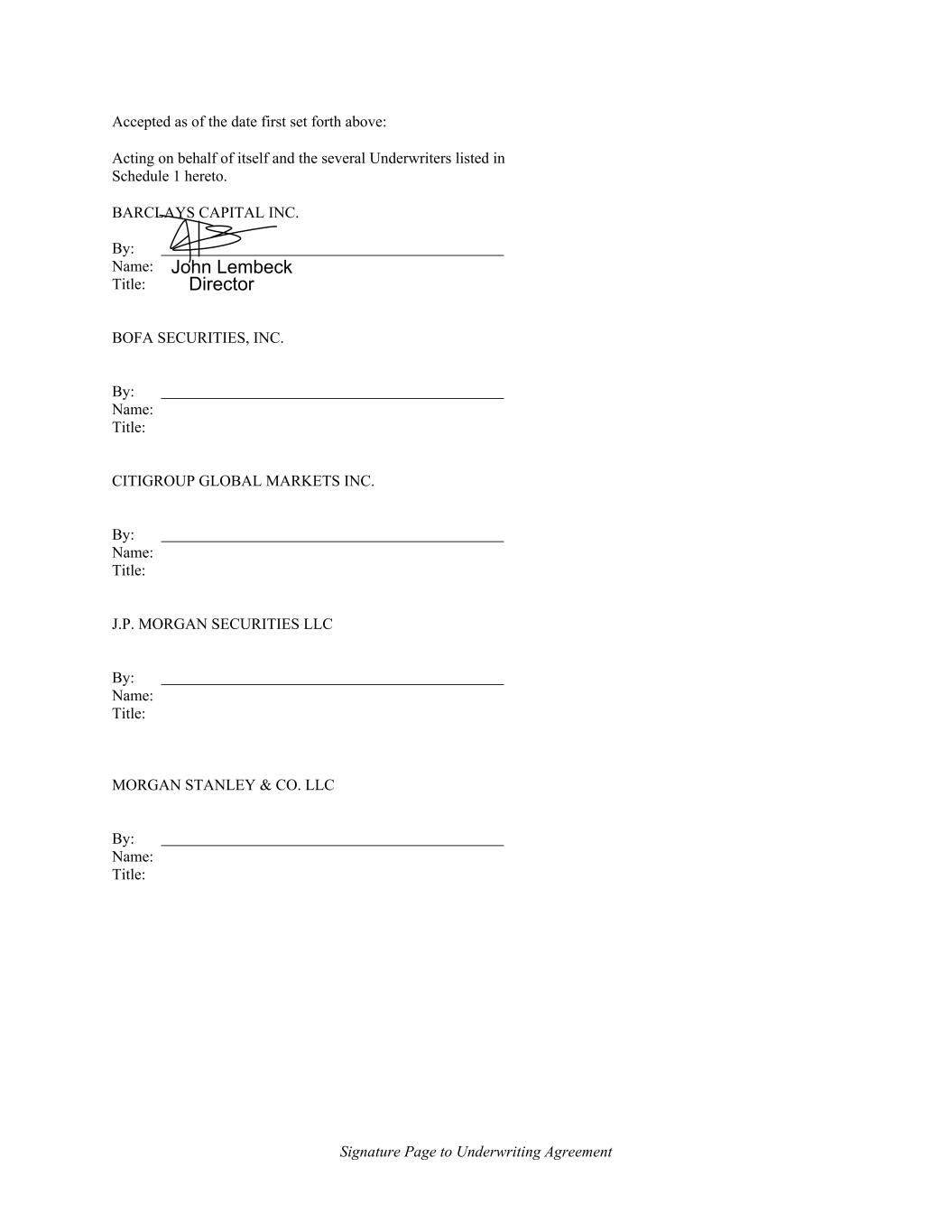 Signature Page to Underwriting Agreement Accepted as of the date first set forth above: Acting on behalf of itself and the several Underwriters listed in Schedule 1 hereto. BARCLAYS CAPITAL INC. By: Name: Title: BOFA SECURITIES, INC. By: Name: Title: CITIGROUP GLOBAL MARKETS INC. By: Name: Title: J.P. MORGAN SECURITIES LLC By: Name: Title: MORGAN STANLEY & CO. LLC By: Name: Title: John Lembeck Director